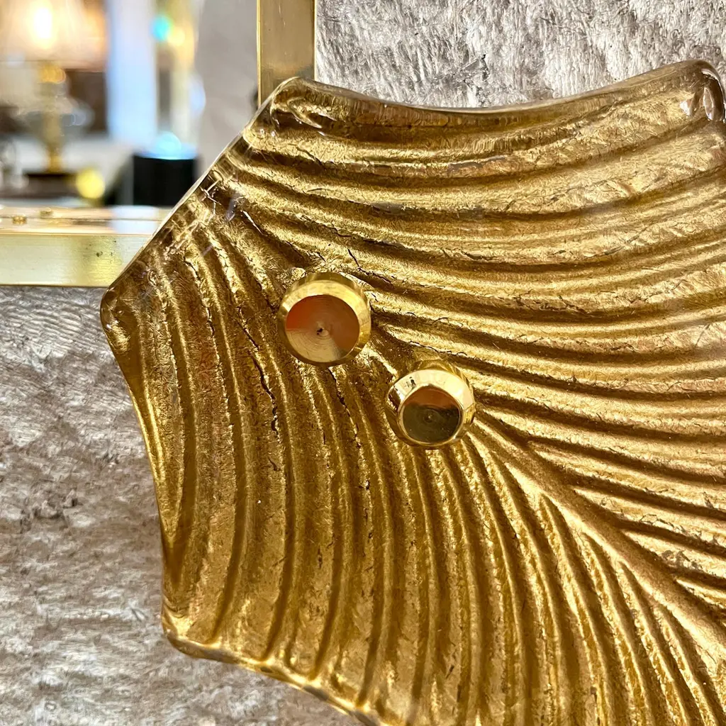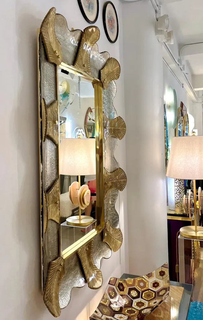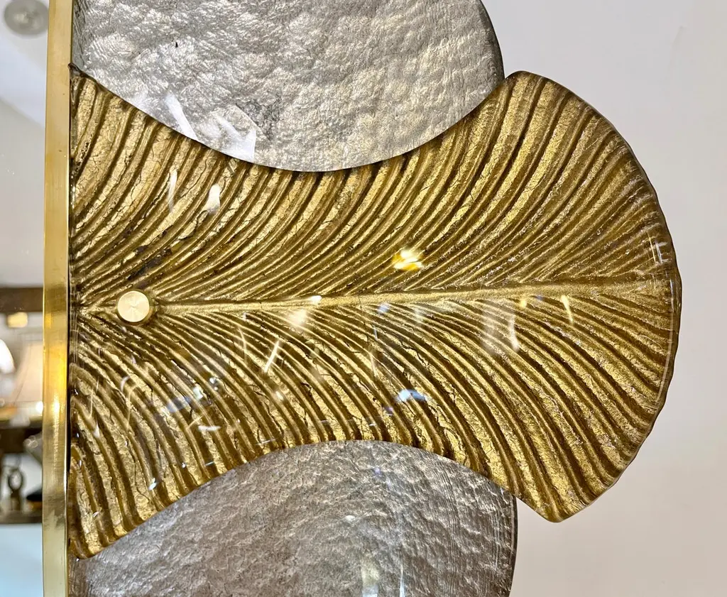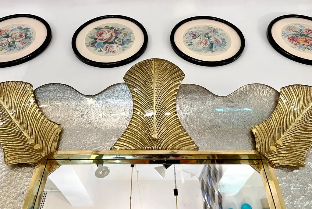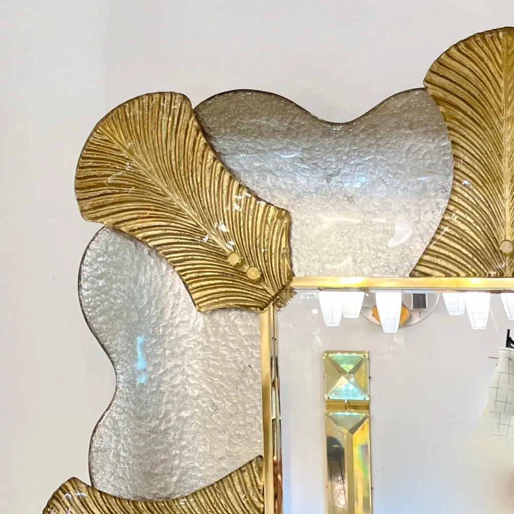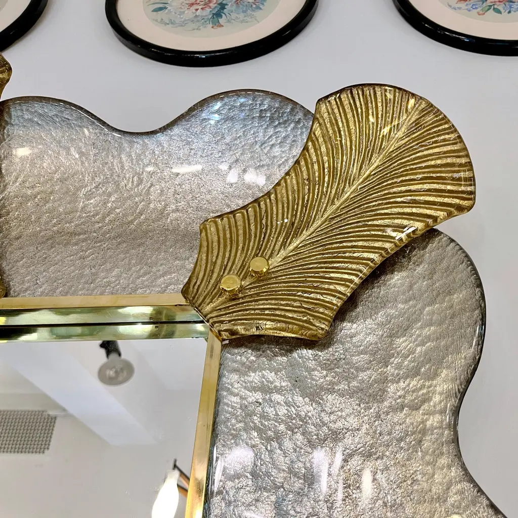 Bespoke Italian Pair Of Art Deco Style Curved Leaf Murano Glass Brass Mirror