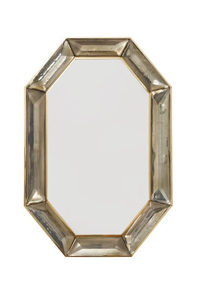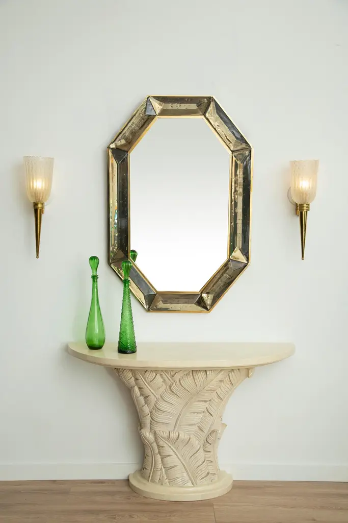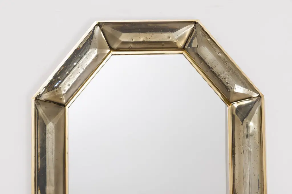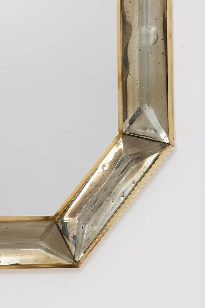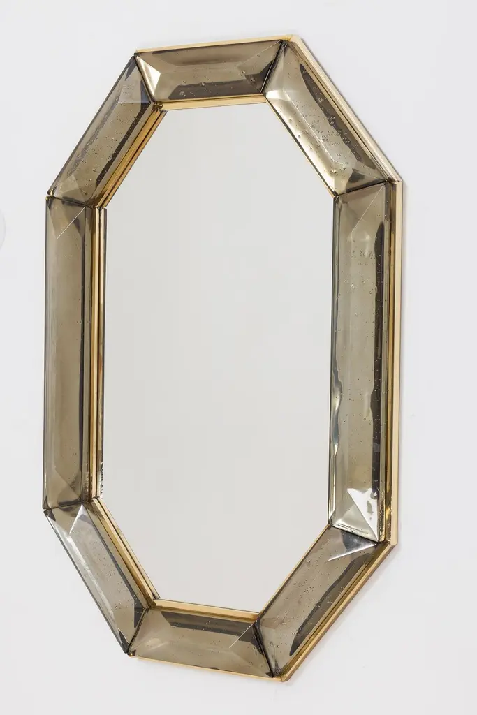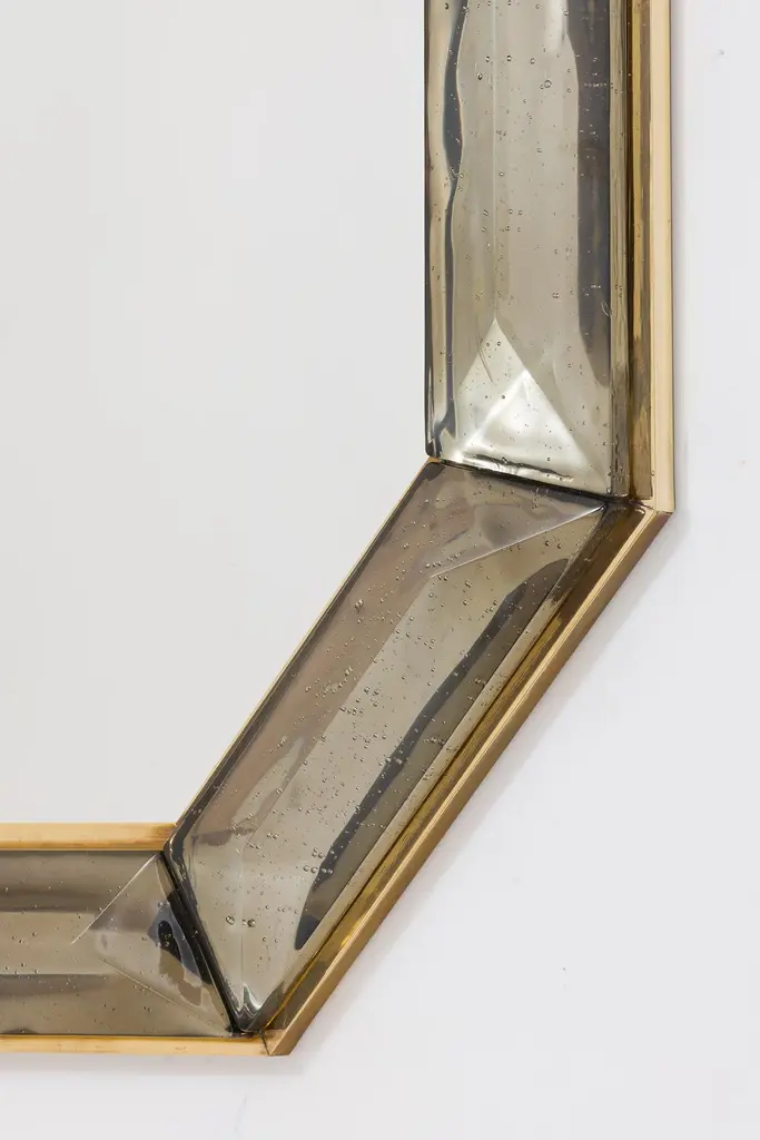 Bespoke octagon smoked Murano glass mirror, in stock Vivid and intense smoked or bronze glass block with naturally occurring air inclusions throughout Highly polished faceted pattern Brass gallery all around Each mirror is a unique luxury handcrafted by a team of artisans in Italy, customization is available in different colors, please see our listings. Can be easily hung vertically or horizontally with metal hanging bracket on back. Weight Lbs90 Located in our store in Miami ready for shipping.