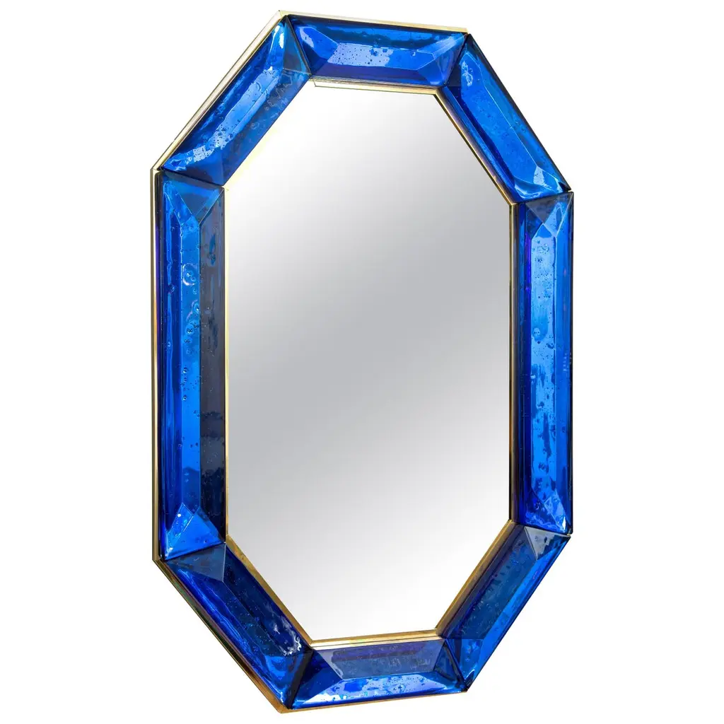 Bespoke octagon emerald green Murano glass mirror, in stock Vivid and intense emerald green glass block with naturally occurring air inclusions throughout Highly polished faceted pattern Brass gallery all around Each mirror is a unique luxury handcrafted by a team of artisans in Italy, customization is available in different colors, Can be easily hung vertically or horizontally with metal hanging bracket on back. Weight Lbs90.