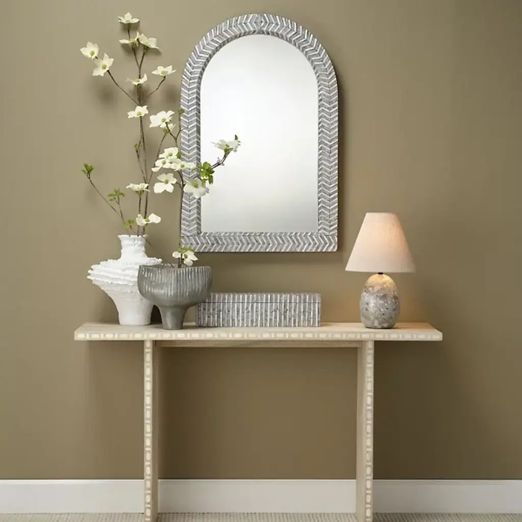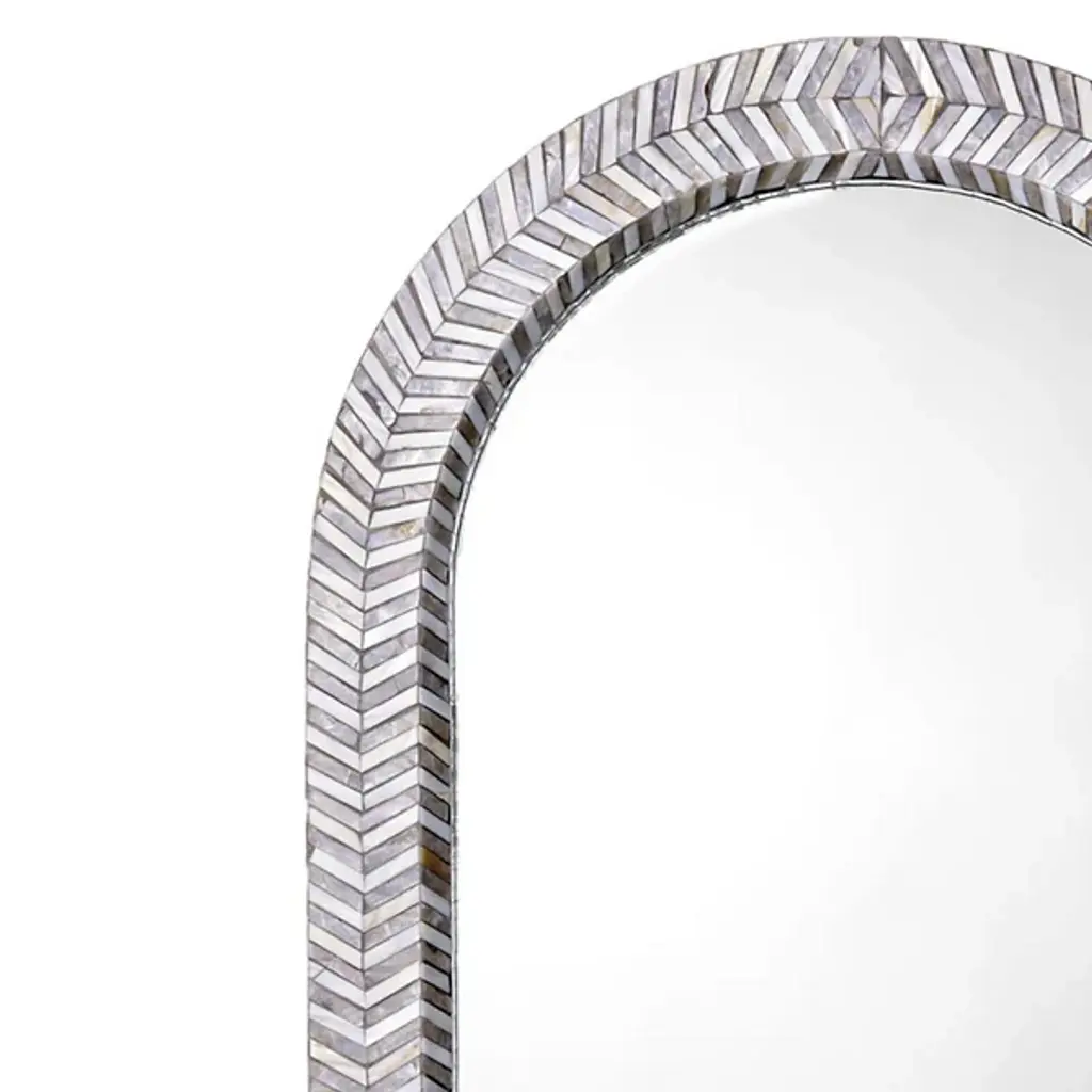The Beverly Arch Mirror from Jamie Young Co. introduces an artisanal interpretation of classic arched design. The traditional arch shape gains contemporary relevance through the innovative use of materials and expert execution. Each mirror becomes unique through the natural variations in the mother of pearl. The vertical orientation and graceful proportions make this mirror particularly suited for narrow walls or as a dramatic addition to dressing areas.
