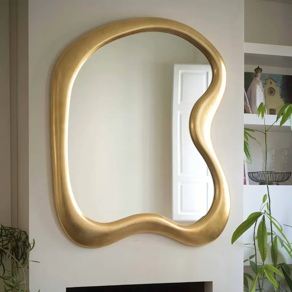This stunning Bi Gold Mirror will bring contemporary flair to any modern environment. The magnificent wall accessory measures 112 x 94 cm and features an MDF frame in beautiful soft curves with a superb gold leaf finish that has been expertly applied by hand.