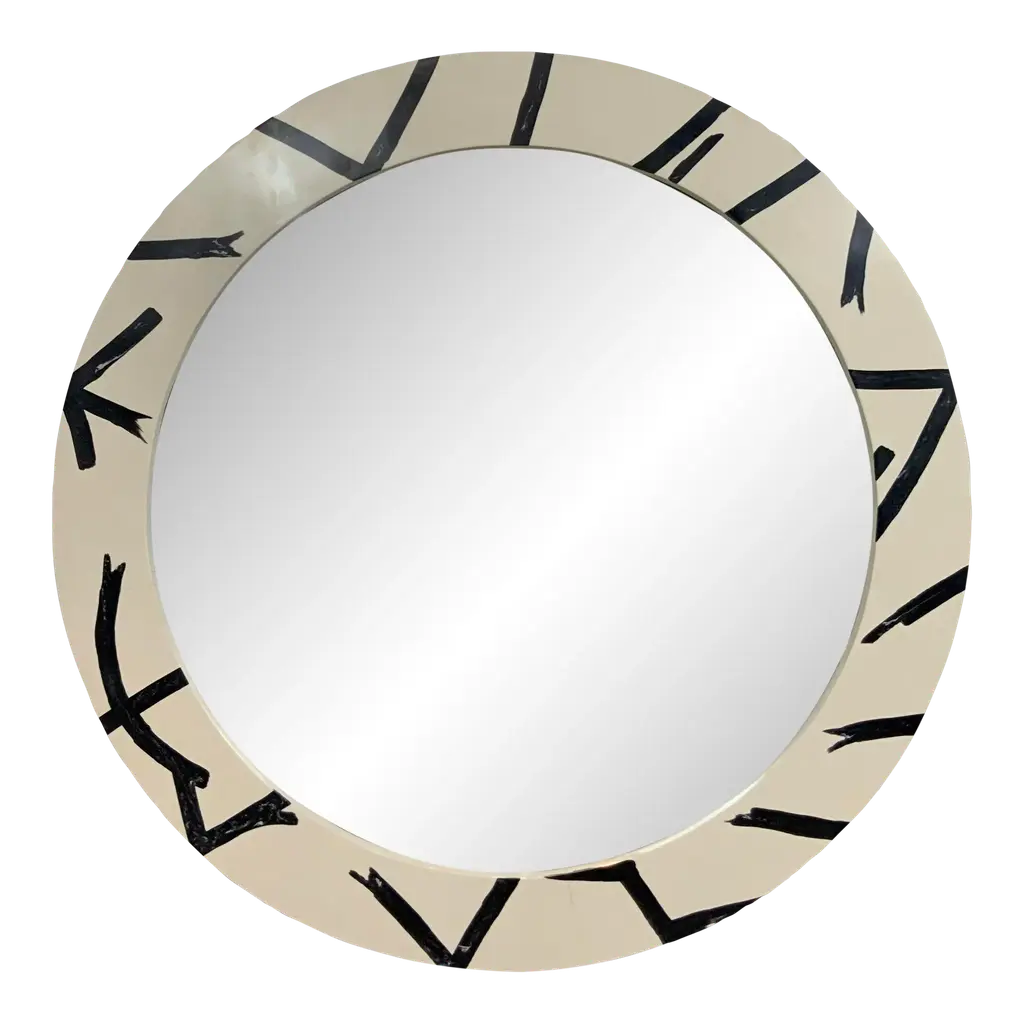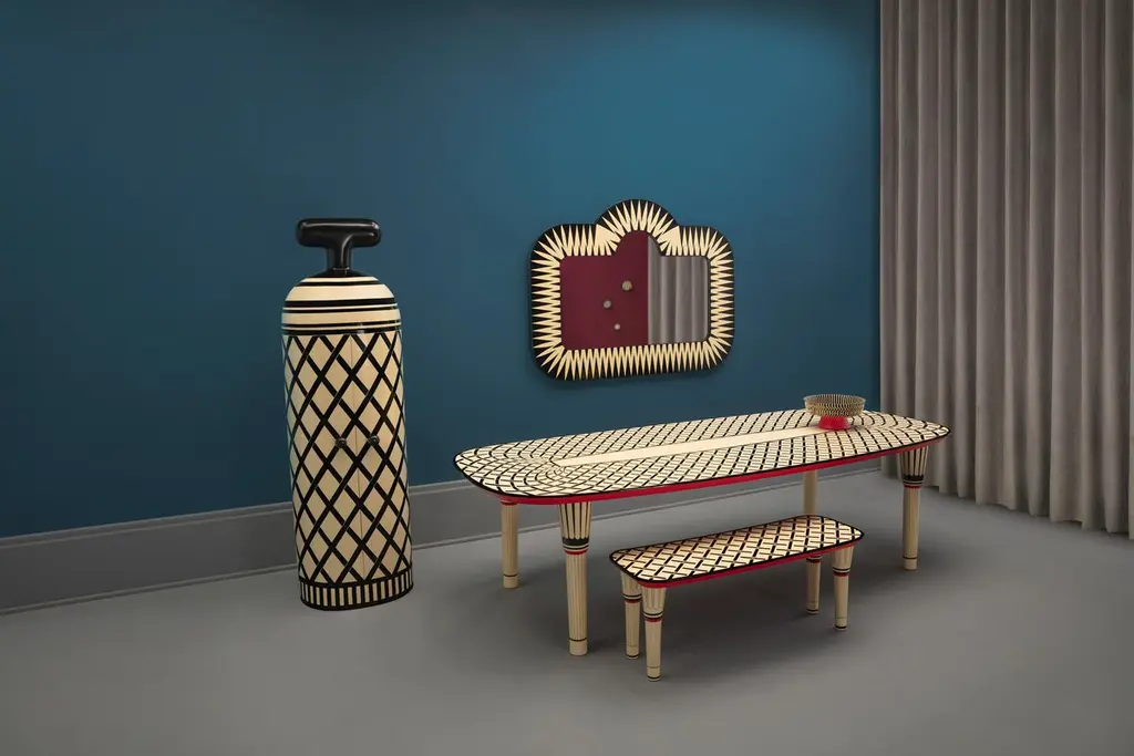 Big Parade Wide Wall Console Mirror by Matteo Cibic is a large fun shaped mirror, spectacular on any wall.India's handicrafts are as multifarious as its cultures, and as rich as its history. The art of bone and Horn inlay is omnipresent here. Artisans from the Northern region of Sarai Tarin, to Bengal in the East, and Trivandrum in the South, have imbibed the ancient technique from Himalayan tribes, and have made their own mark along the way. The intricately crafted combs, vases, toys, and other objets d'art have long been a connoisseur's delight, and a means of livelihood for millions. When the founders of Scarlet Splendour and designer Matteo Cibic went on tour, in search of inspiration for their first collection, they were captivated by the exquisite bone marquetry. They decided to make a contemporary version of the playfully geometric designs, which would be accepted across the world. Cibic then developed a resin compound, and the company carried out trials with the material until they found the right mix. The resin would replicate ivory inlay, on a base of plywood, ultimately smoothened and lacquered to have no visible or tactile end. Each piece of the Vanilla Noir collection would then be made in India, by local craftsmen using locally sourced materials and pigments. The aim was to combine Indian workmanship and Western aesthetic in such a way that each piece appears timeless, and with multiple roots. In the unique decorative imprints one would recognize Indian styles, and also unexpected drifts to Italian design. The company's founders wanted to proudly showcase the Fine art and making capabilities of their native India, and give the craftsmen due recognition. They have successfully paid homage to their heritage by elevating indigenous art and taking it to global design platforms.Care: Wipe gently with dry soft cloth. Liquid spillage must be wiped without delay.Please note: Each piece in the Vanilla Noir collection exalts the handmade, the painstakingly crafted, the authentic. A piece may have slight variations and tiny imperfections but these are the marks of an artisan, a testament to the individuality of each work of art. It is our belief that these variations infuse our objects d'art which desire and we assert our right to make the necessary qualitative changes. Prices do not include VAT. VAT may be applied depending on the ship-to location.
