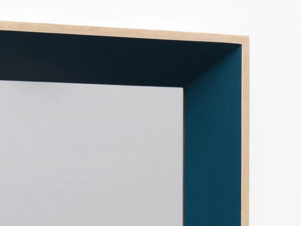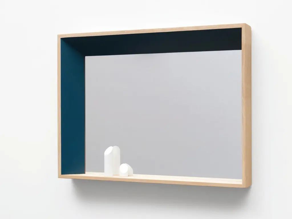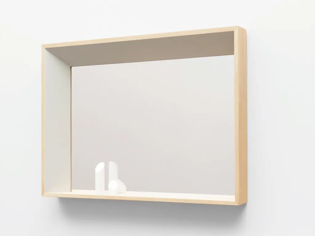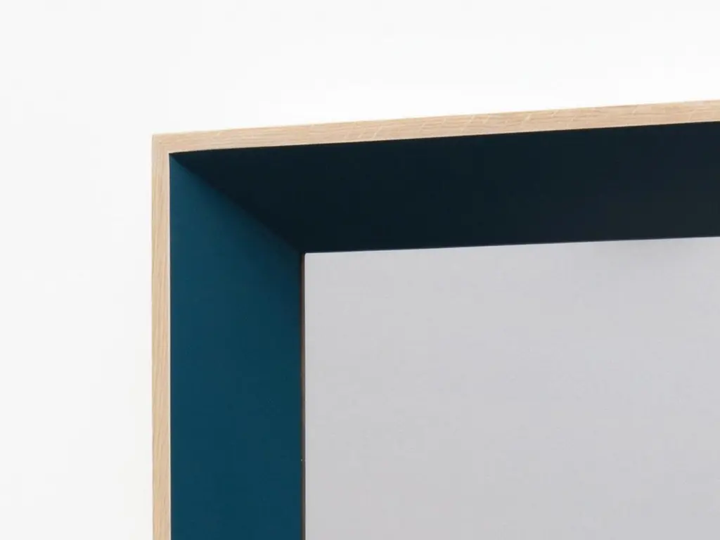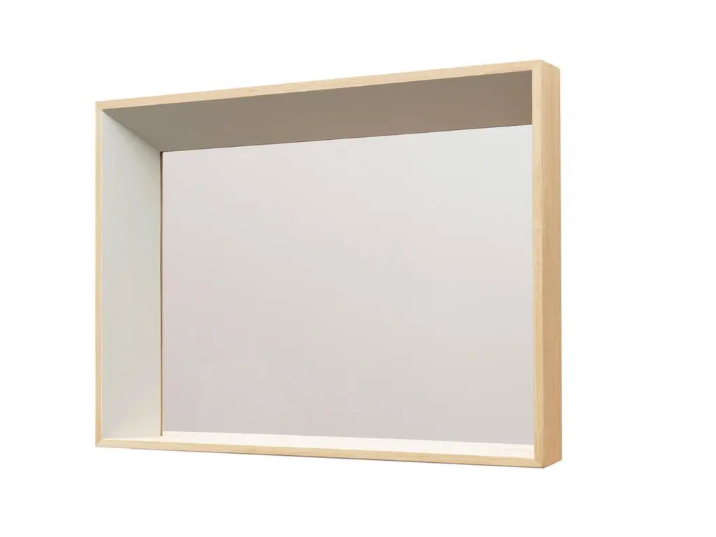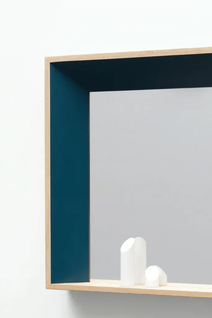 The BISO mirror plays on a perspective effect; 2 sides are bevelled at 45° degrees, giving a depth effect. Available with a right or left version, the BISO mirrors can be displayed by 2, 3 or even 4 to design a quirky window. Its depth enables to display little artefacts or leave keys, phone on the little shelf…Fixing rail for the wall included. Frame in solid French oak and ash, back in veneered oak. Made in Anjou (France).