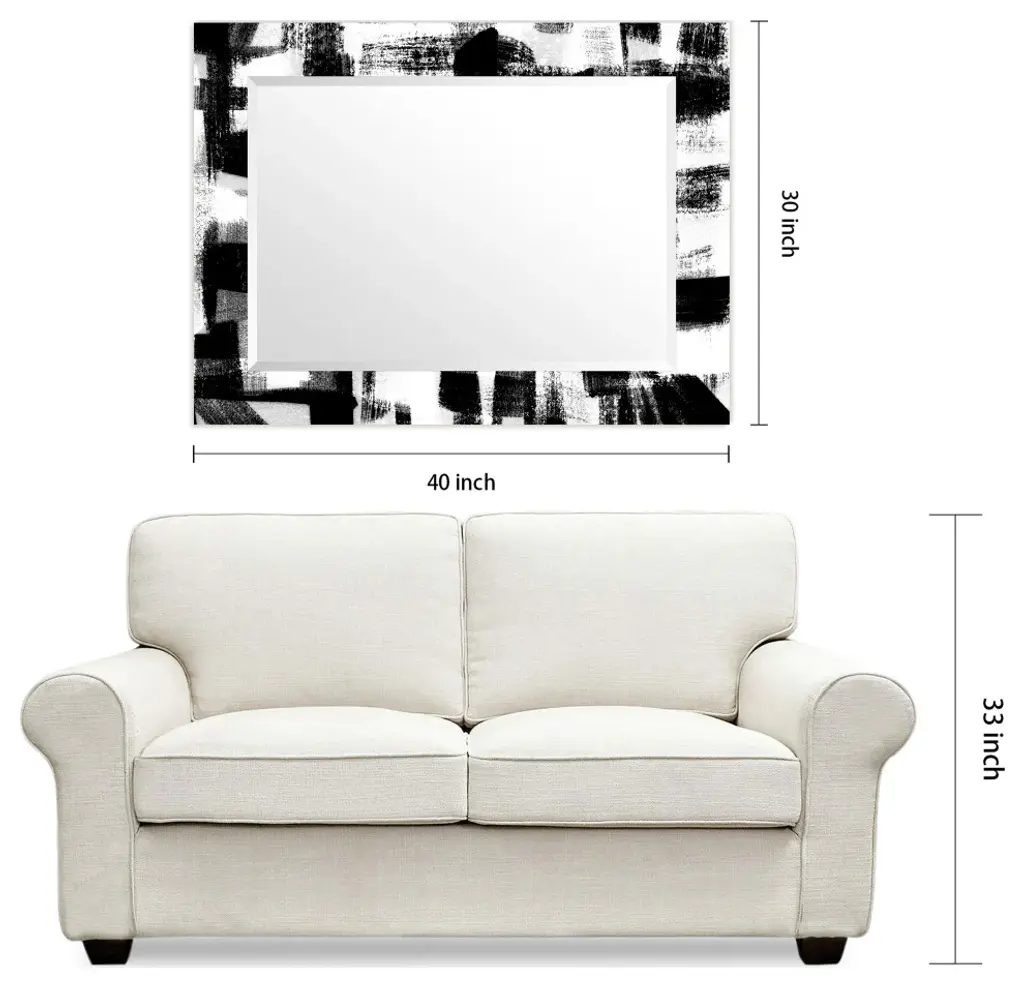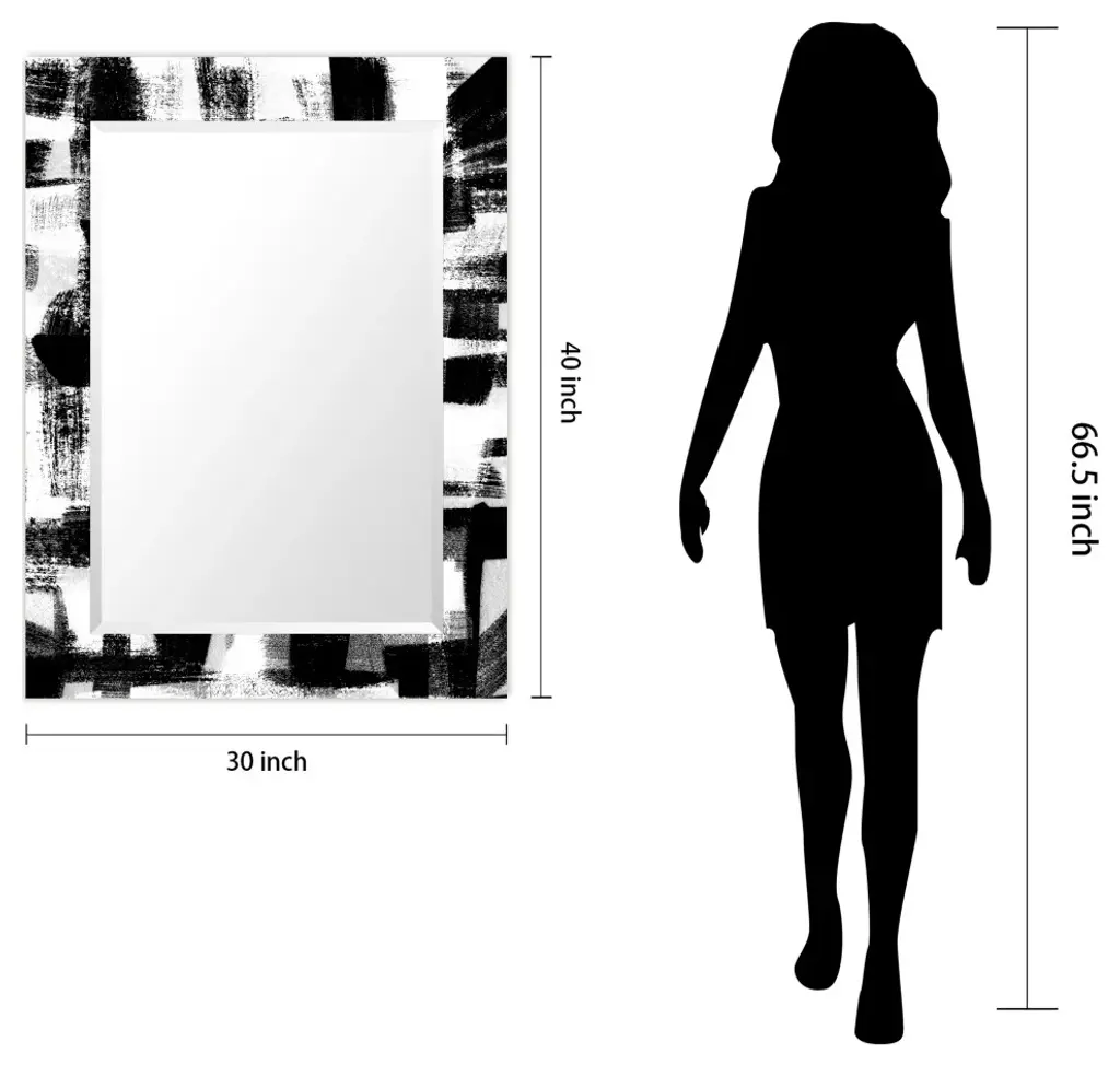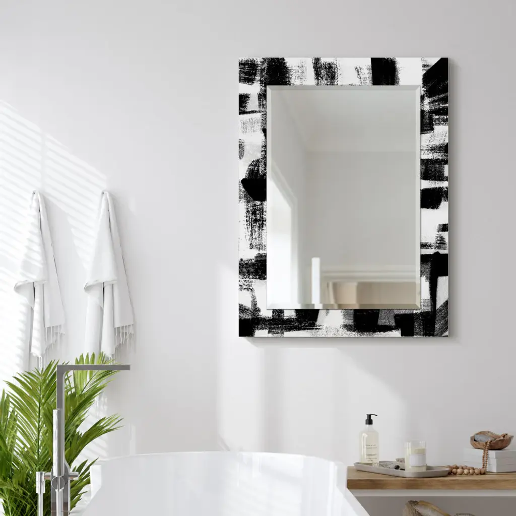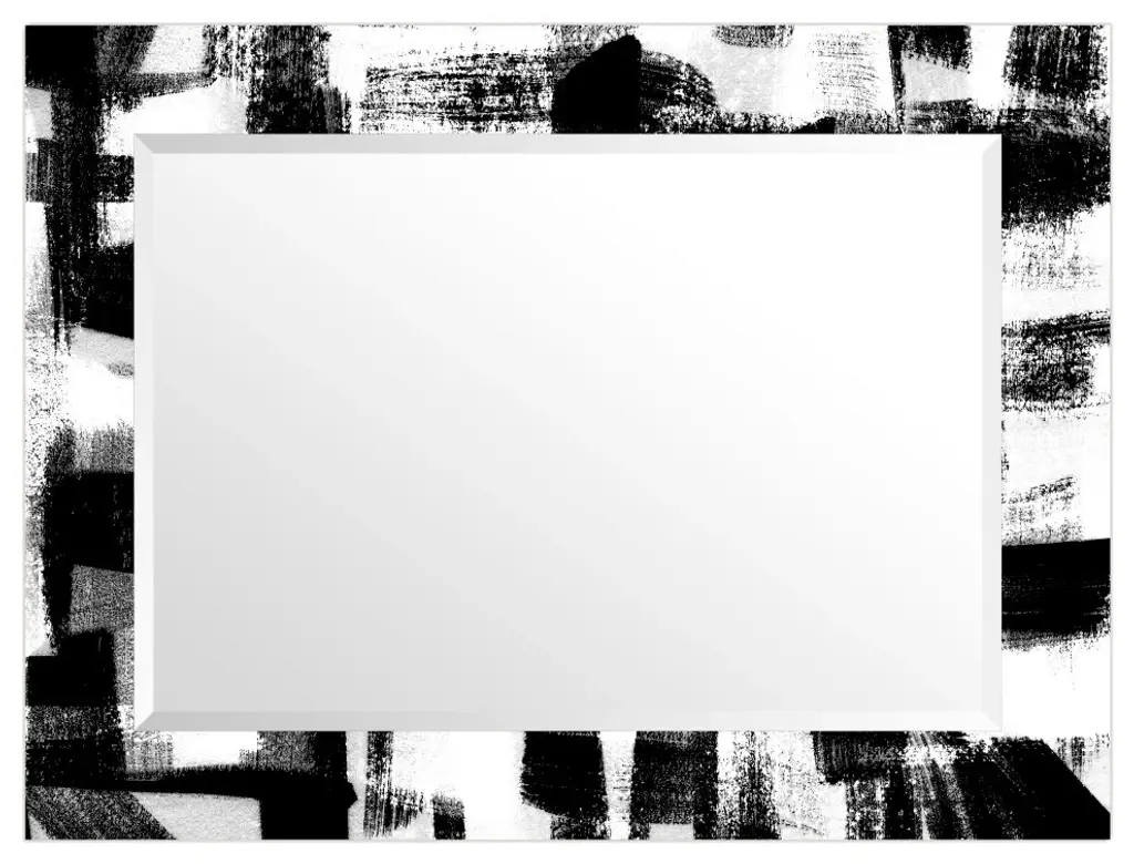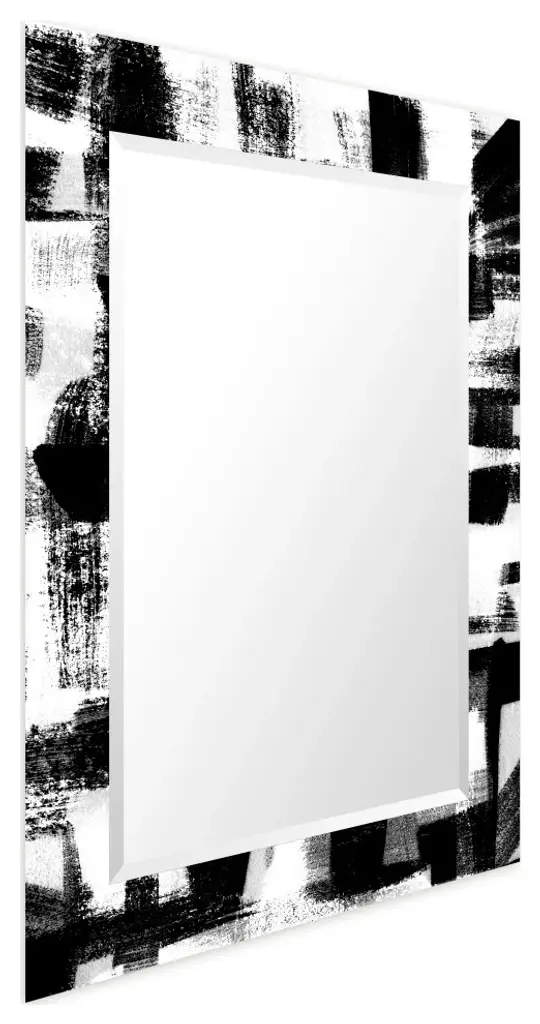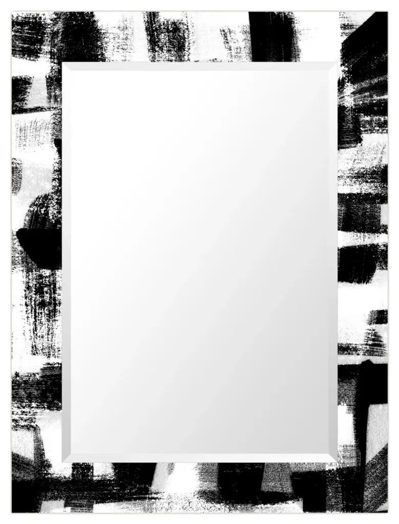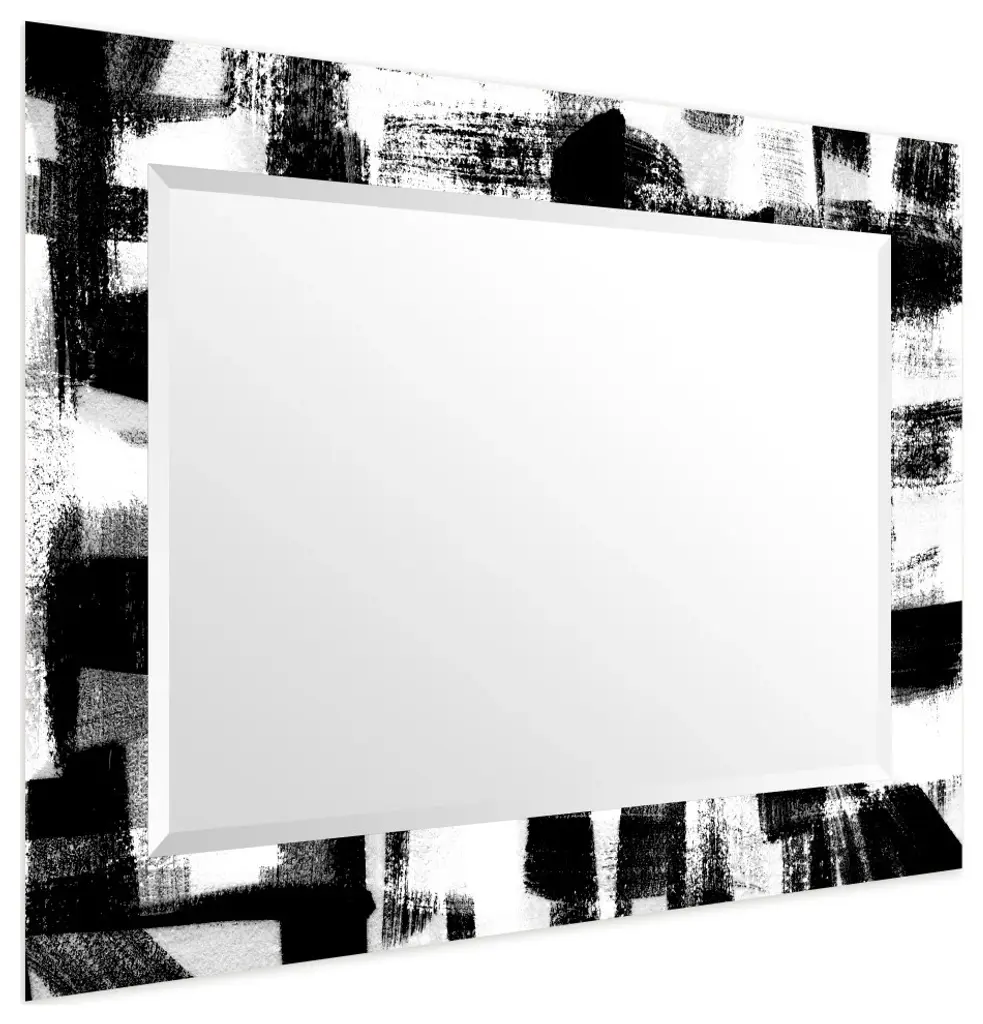 Black And White Beveled Mirror On Printed Abstarct Tempered Art Glass, 40x30"