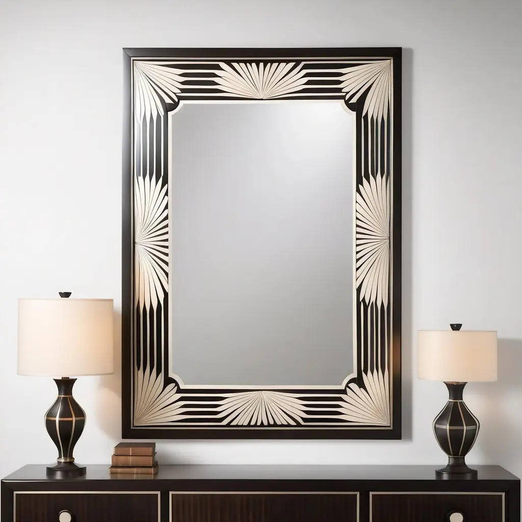 Elevate Your Space with Timeless EleganceTransform your interiors with the captivating beauty of our Art Deco -Inspired Wall Mirror—an exquisite fusion of traditional craftsmanship and modern sophistication. Designed to be a statement piece, this mirror seamlessly combines intricate artistry with contemporary style, making it the perfect centerpiece for any home or workspace.Exquisite CraftsmanshipAdorned with mesmerizing geometric patterns, this mirror highlights the meticulous artistry of traditional bone inlay. Each detail pays homage to the centuries-old techniques of decorative design, reimagined in a sleek black resin finish. The result is a stunning piece that radiates elegance while retaining its timeless appeal.The Art of CreationHandcrafted with precision and care, every mirror is a true labor of love. It features over 200 individually cut and shaped bone pieces, expertly arranged into intricate patterns. Once assembled, each piece undergoes a careful coloring process, ensuring a flawless finish that enhances its beauty and durability.Crafted in India by Master ArtisansOur mirrors are handcrafted by skilled artisans who specialize in traditional techniques passed down through generations. Their dedication and expertise ensure that each mirror is not just a product but a masterpiece, reflecting India's rich heritage and craftsmanship.A Legacy of ExcellenceAt Artisanal, our mission is to revive and preserve India's rich artistic traditions by blending age-old techniques with contemporary design. For over six years, our team of artisans and designers has worked in-house to create high-quality, timeless pieces. Our mission is to keep these traditions alive, offering products that resonate with elegance, sophistication, and enduring value.Indulge in luxury and bring home the Art Deco Wall Mirror—a testament to art, culture, and craftsmanship that will be admired for years to come.