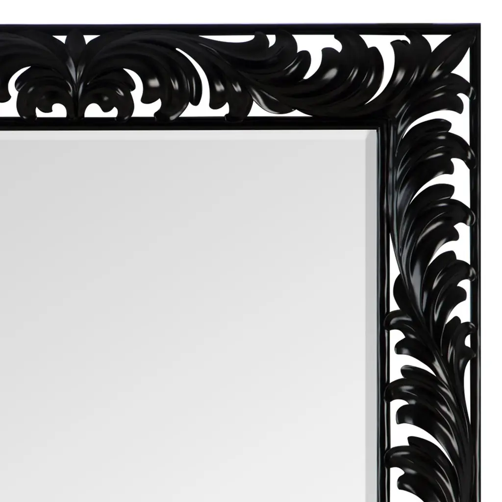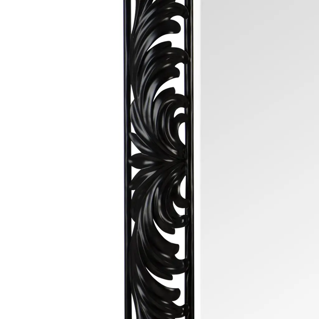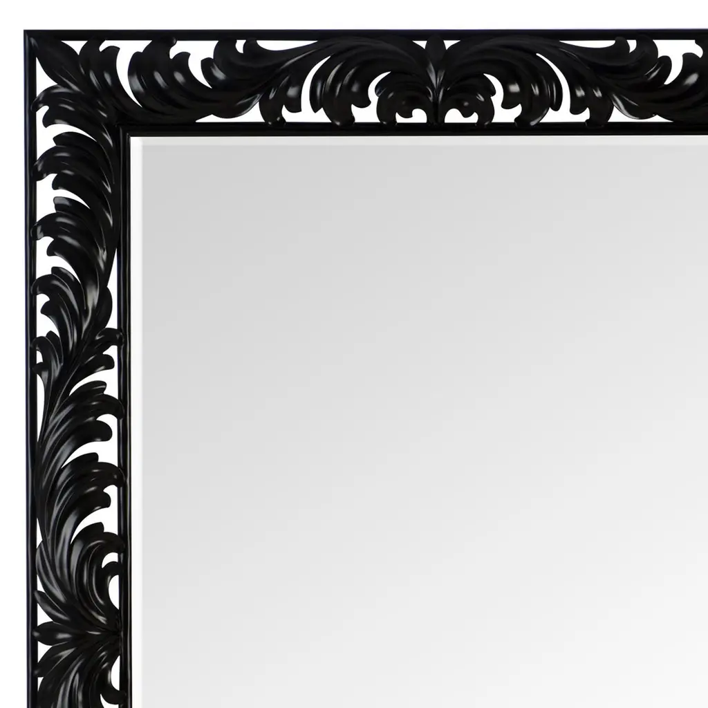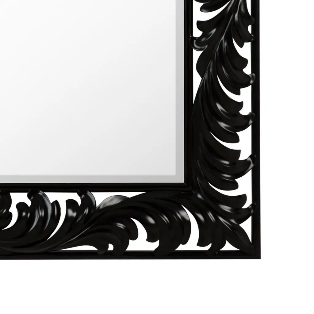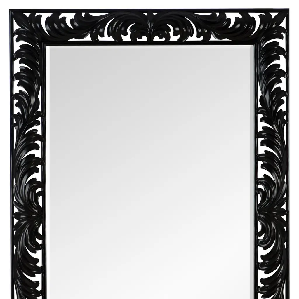 Mirror black Roman with frame in solid hand carvedwood with finish in black satin. With bevelled mirrorglass.Also available on request, in antique silver or antique gold paint or in natural tobacco wood finish.Available on request in:L 159 x D 07 x H 231, price: 13500,00€L 159 x D 07 x H 173, price: 10500,00€.
