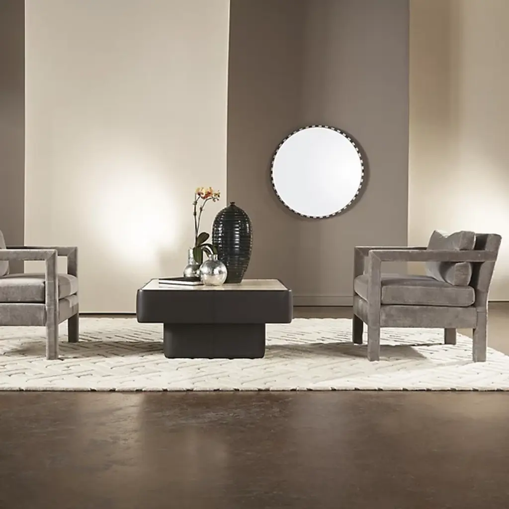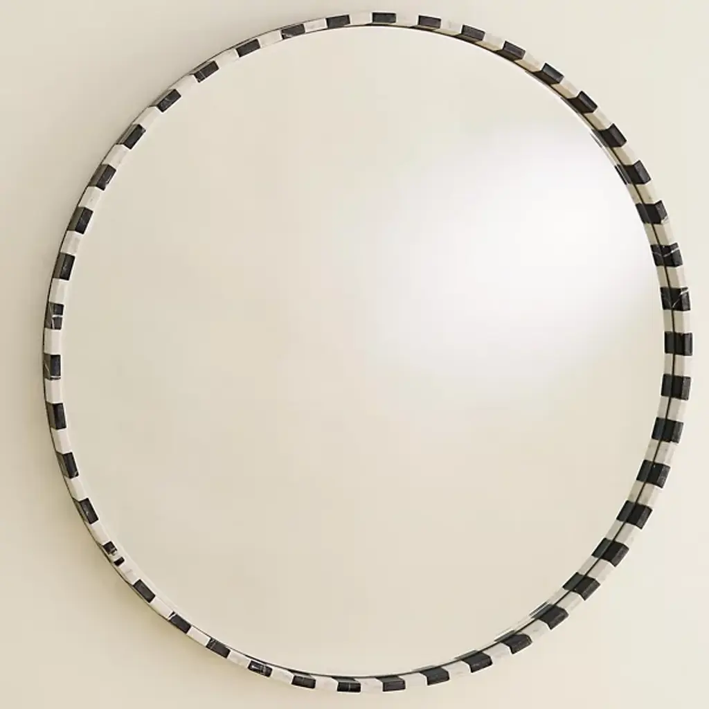 Present intricate appeal to indoor walls with the subtle, layered design of the Black/White Mirror from Global Views. Starting with a round reflector, it’s accompanied by a ring frame of alternating black and white marble tiles, each one naturally textured and individual enough to draw the eye while cohering into the larger pattern of the full ring shape.
