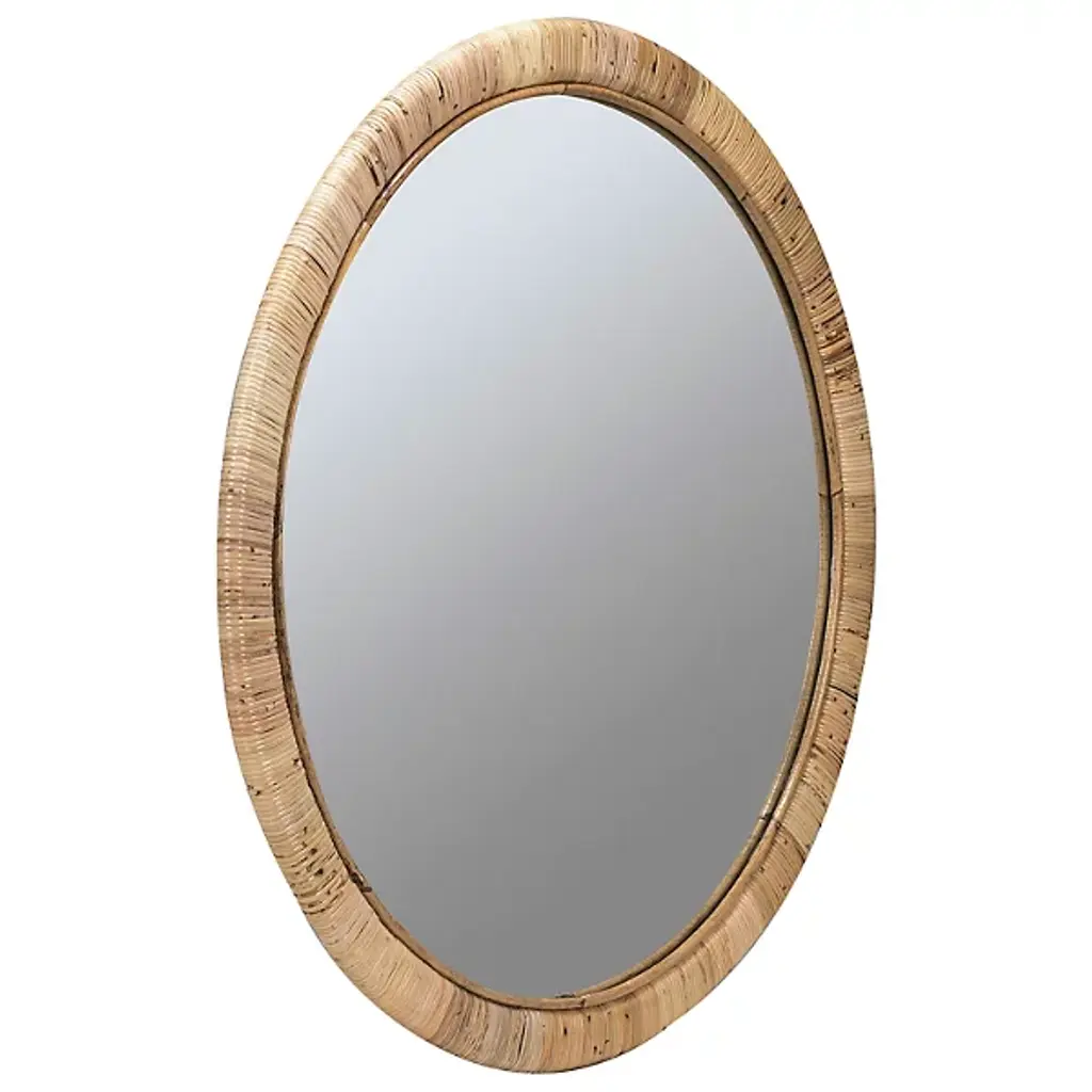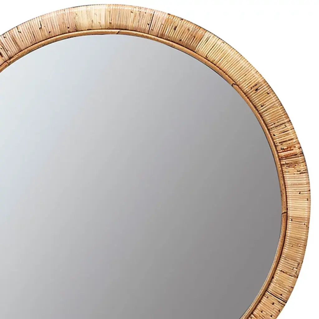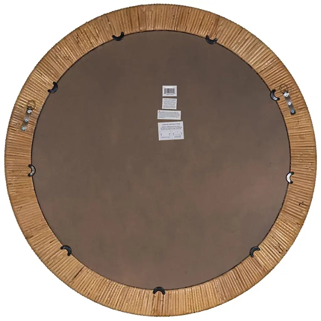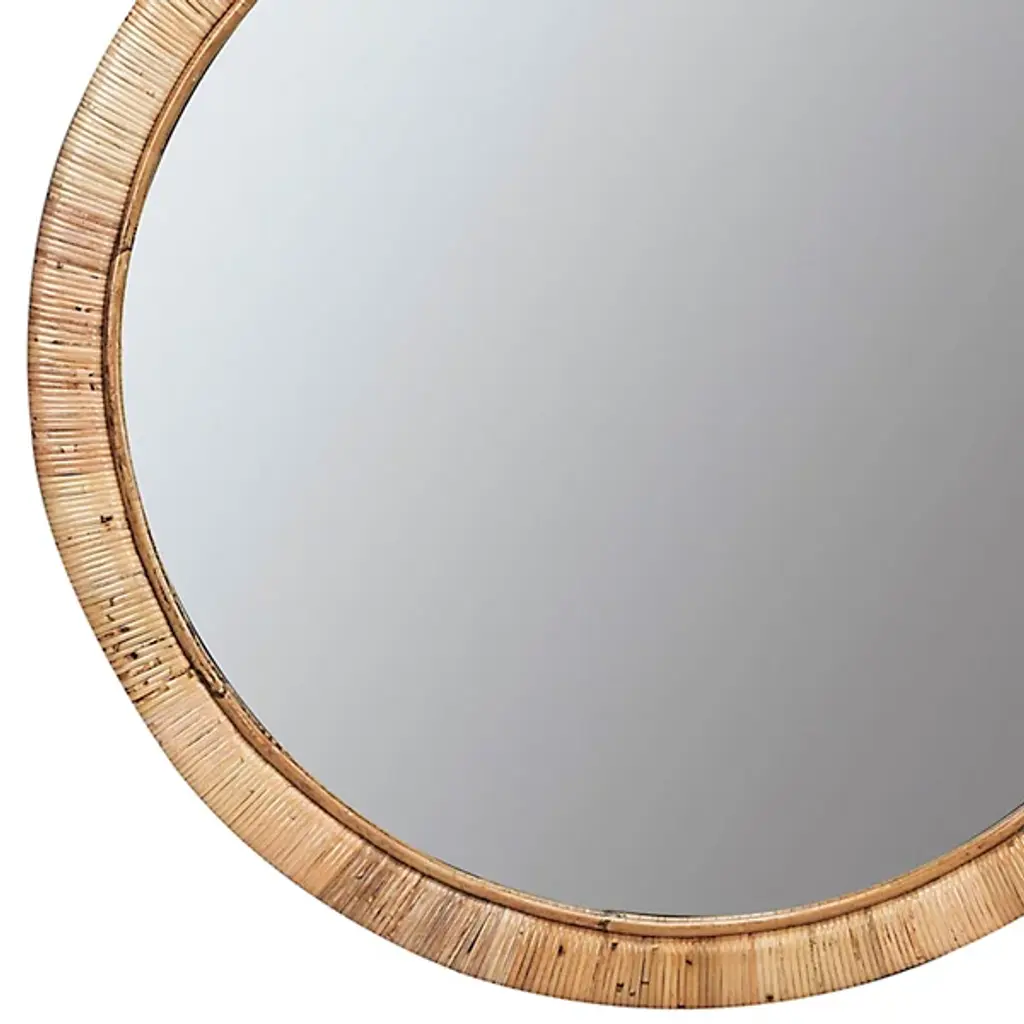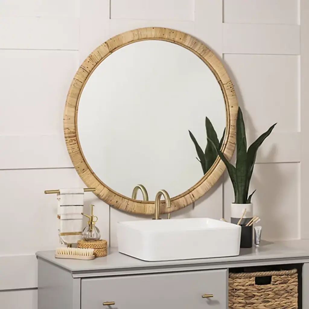 The Blaise Wall Mirror from Cooper Classics surrounds the reflection with handwoven rattan. The natural material creates a wide border with intricate woven patterns that filter ambient light. Traditional basketry techniques inform the frame's construction, resulting in a sturdy yet visually light composition. The circular design references both vintage port-hole windows and contemporary disc mirrors. Perfect for spaces seeking to incorporate natural materials and artisanal craftsmanship.