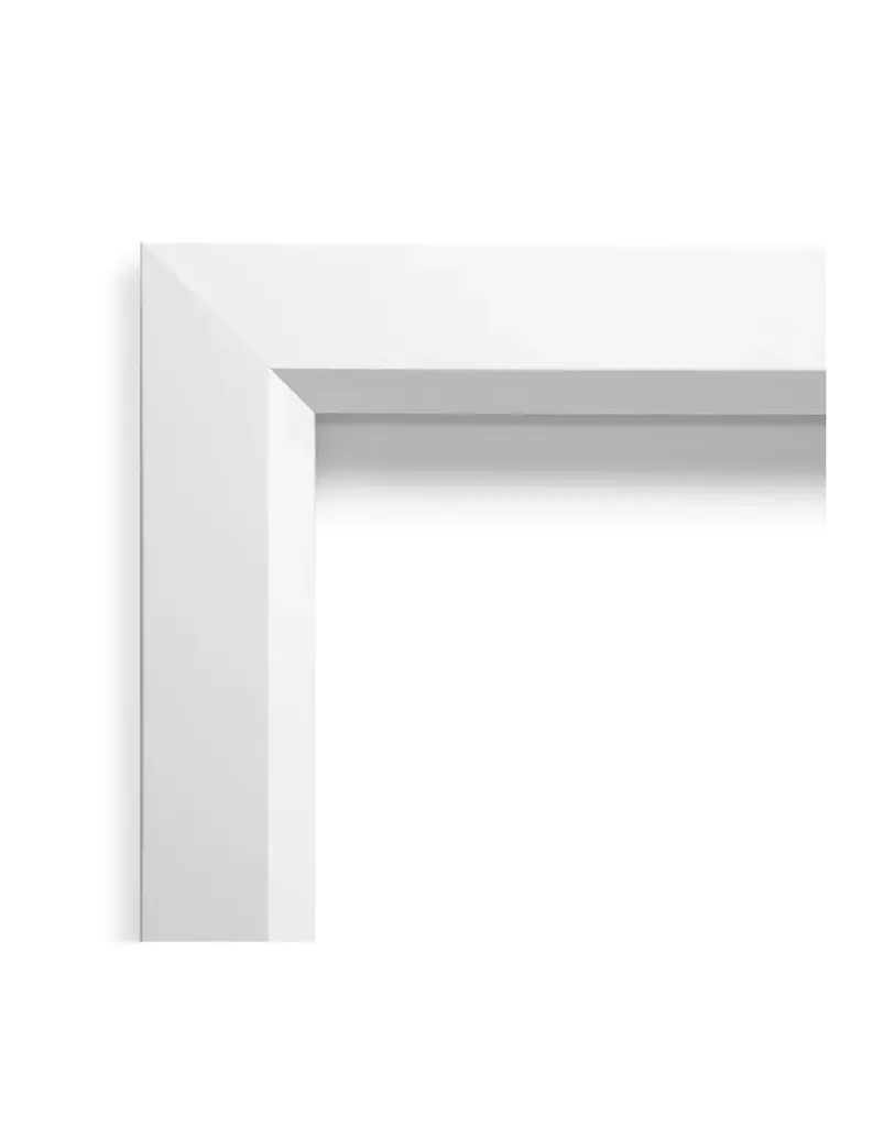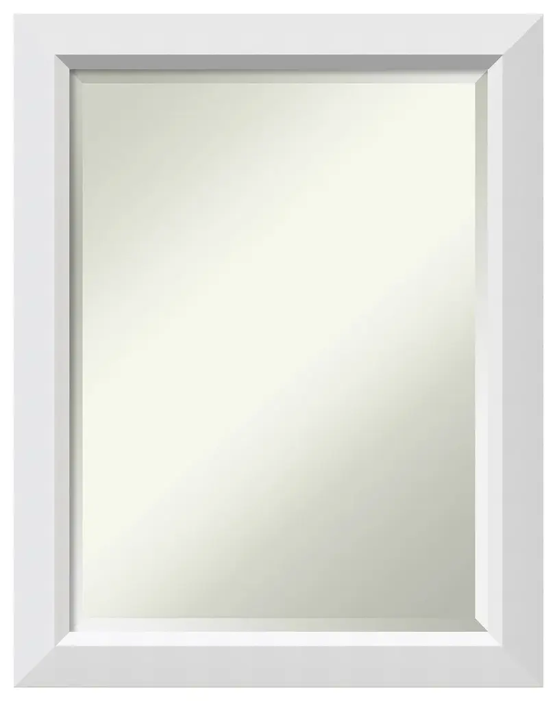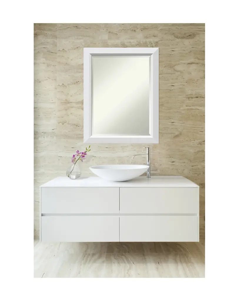 Give your bathroom the finishing touch with this 100% real wood Beveled Wall Mirror framed with the Blanco White frame. Individually made using traditional custom framing techniques, it has the quality you would expect from your local frame shop. It holds its value with premium finishing that can be appreciated up close.Features:MIRROR DETAILS: This mirror features premium glass for a clear, undistorted image and is finished with a beveled edge to give the glass a decorative touch. The overall size of this wall mirror measures 21.5 x 27.5 inches, including the frame. Its reflective area measures 18 x 24 inches.WOOD FRAME DETAILS: The Blanco White Frame is a geometric white frame with a flat face and an angled inner edge with a smooth satin finish. The frame is 2 in. wide and stands 1.25 in. off the wall.PROTECTIVE BACKING: The mirror has a solid surface backing to ensure stability and prevent moisture and dust buildup.HASSLE-FREE HANGING: All mirrors have durable hanging hardware attached to the back to hang vertically or horizontally, along with hanging hooks and nails.ASSEMBLED IN THE USA: Each piece is assembled to order in Madison, WI USA.FOR HOME OR COMMERCIAL USE: Because of our attention to detail and focus on artistry, architects, interior designers, and homeowners alike choose this mirror to create beautiful living spaces.