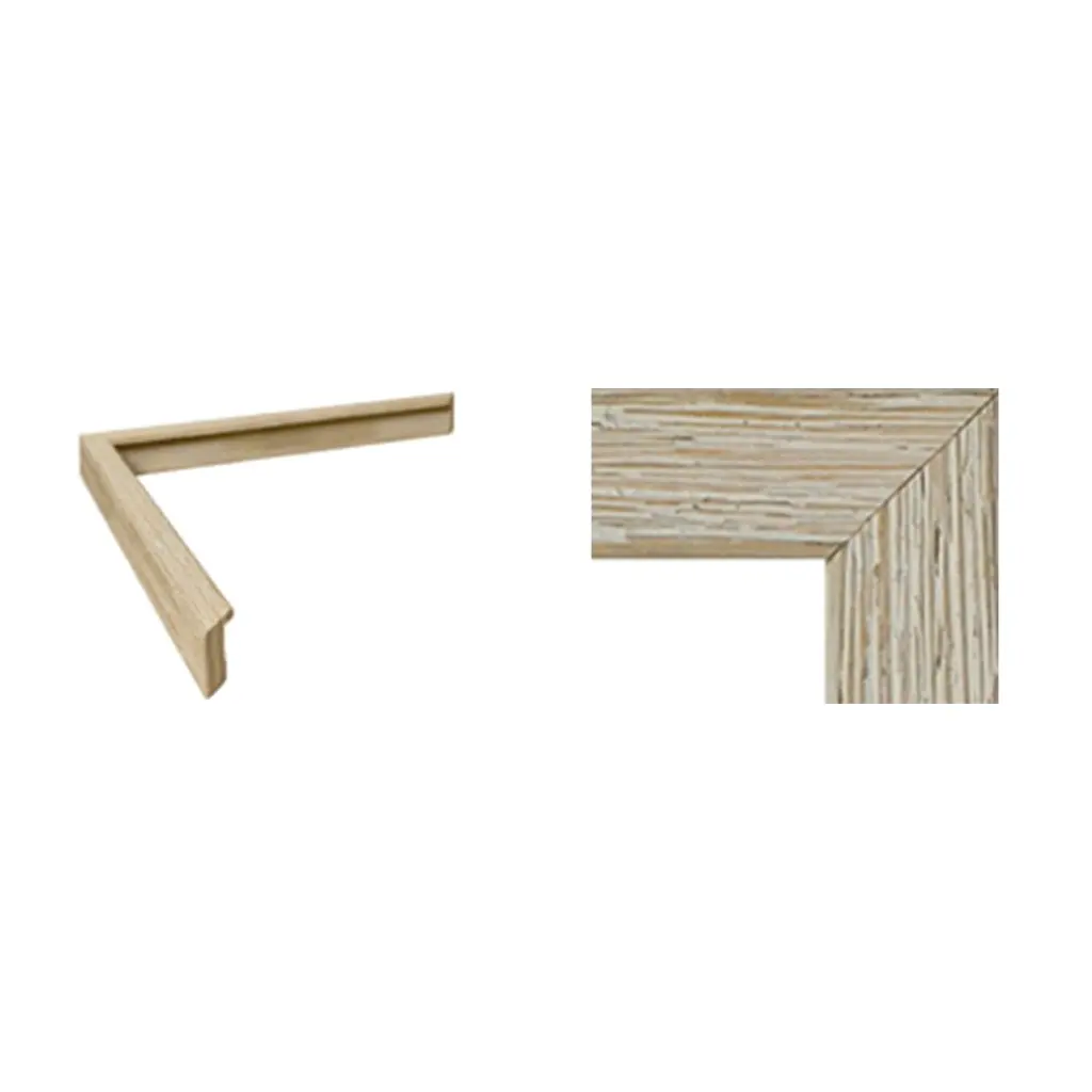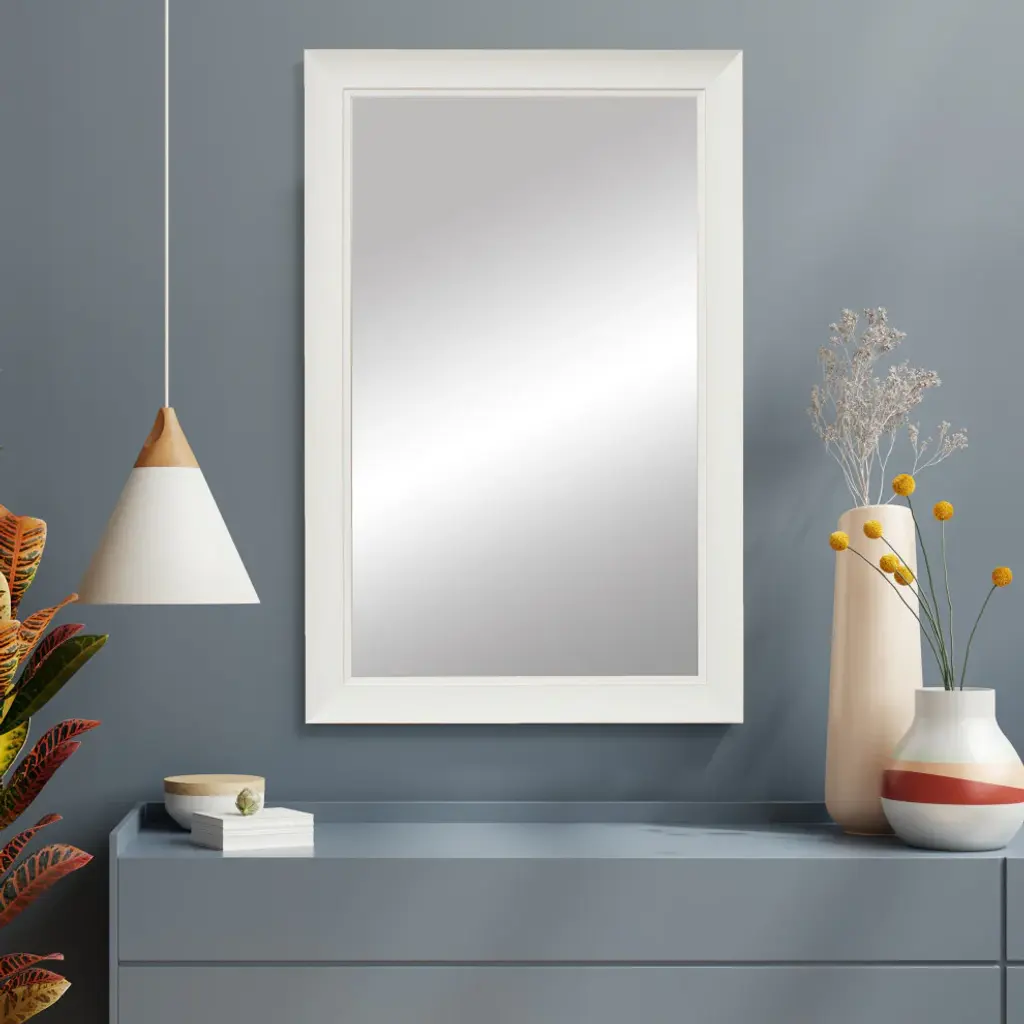 Like the edges of an old Polaroid picture, the frame of the Blanco framed mirror adds a pop of white to draw attention to your custom mirror. The edges are aged in color, giving this frame a bit of an antique feel. The frame is tall along the outside edge, and it slopes gently down to the inner edge, which is beveled for added depth.Hangrail for installation will be applied on the width of the frame. All assembly hardware and instructions will be included. Additional hangrails are included if the opposite orientation is desired for installation. The dimensions displayed are the final outside dimensions of the frame, including the mirror. CATII safety backing applied on all mirrors. Approved for high-moisture areas such as bathrooms.