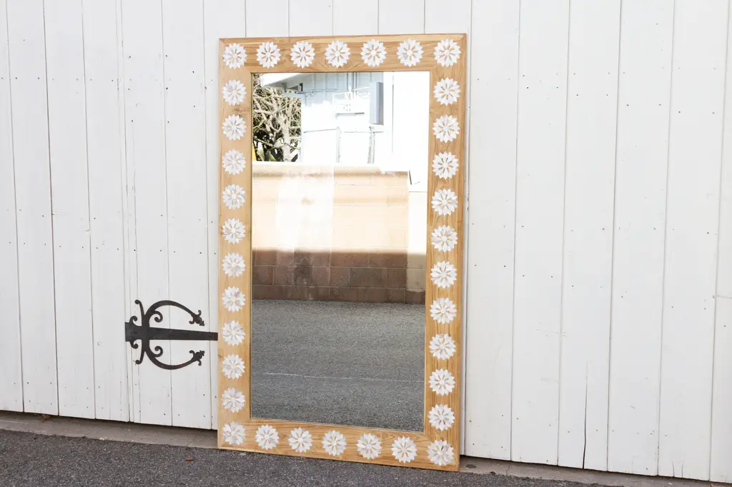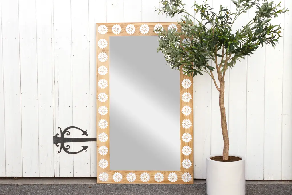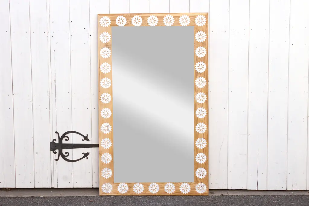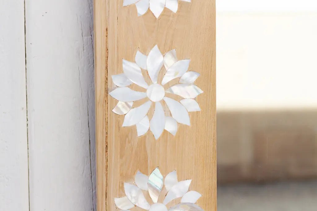 Showing clean contemporary lines contrasting with reclaimed teak and handmade inlay work. This beautiful boho modern mirror would be a staple in any home. Our blossom mother of pearl inlay collection is inspired by the opening of a lotus flower which is a symbol of purity and enlightenment. The reclaimed teak is hand-carved forming the flower shape, the inlay pieces are cut and carefully hammered into the wood to create the lovely lotus design.