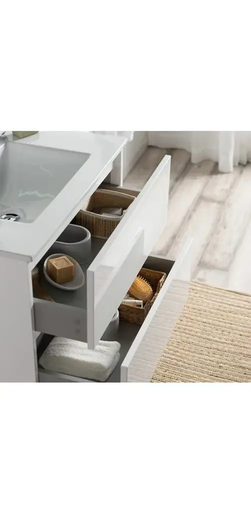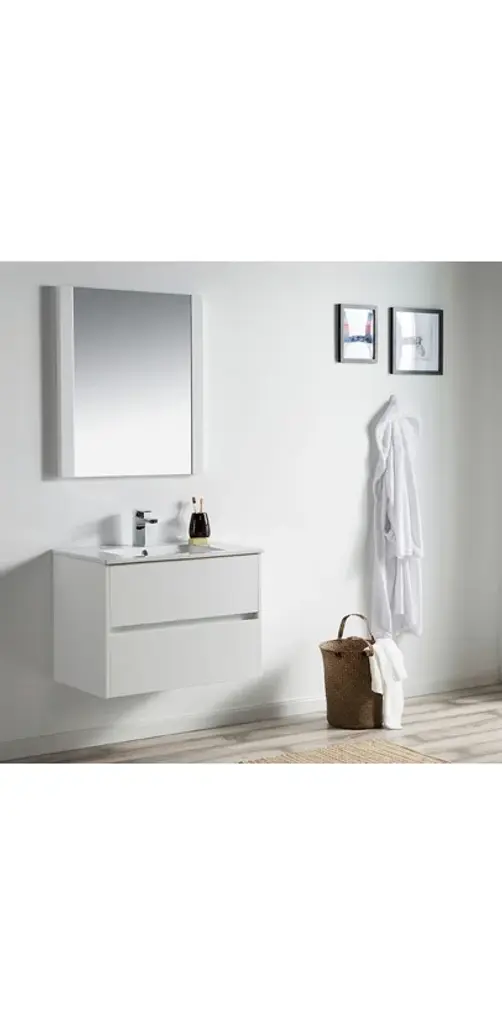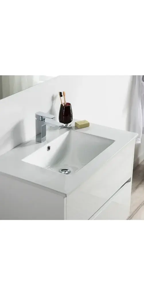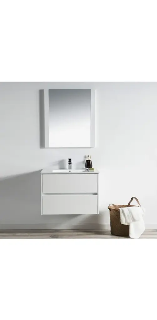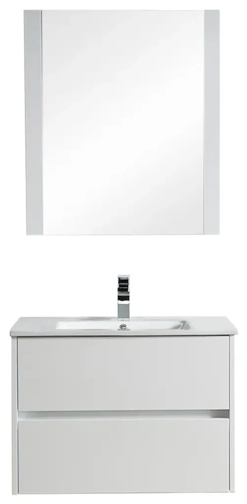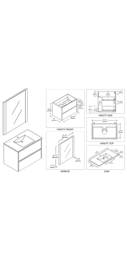 FEATURESALL WOOD provides smooth and elegant design also resistance to dent or distortion.CLASSIC TWO DRAWERS Wall-Hung Design offers sleek appearance with spacious storage spaces.FIVE LAYERS PAINTING offers 2 times longer lasting and resistance to moisture and humidity.U SHAPE & OPEN BACK for easy plumbing installation.SOFT CLOSE DRAWERS prevents cracks and reduces friction on the hardware.Color matching wood frame mirror offers an elegant completed set look of vanity.High quality easy clean up and maintenance free ceramic sink.One year warranty with top level customer service.INCLUDED: Vanity, Ceramic Sink and Mirror.NOT INCLUDED: Faucets, Pop Up, P trap, etc.