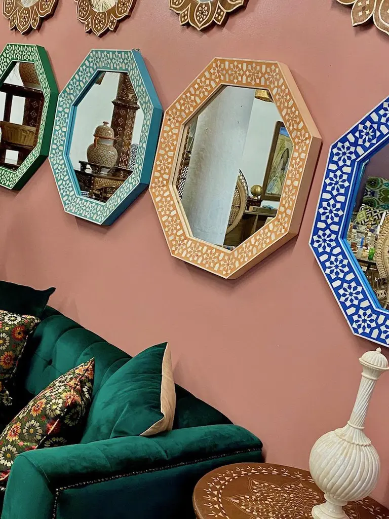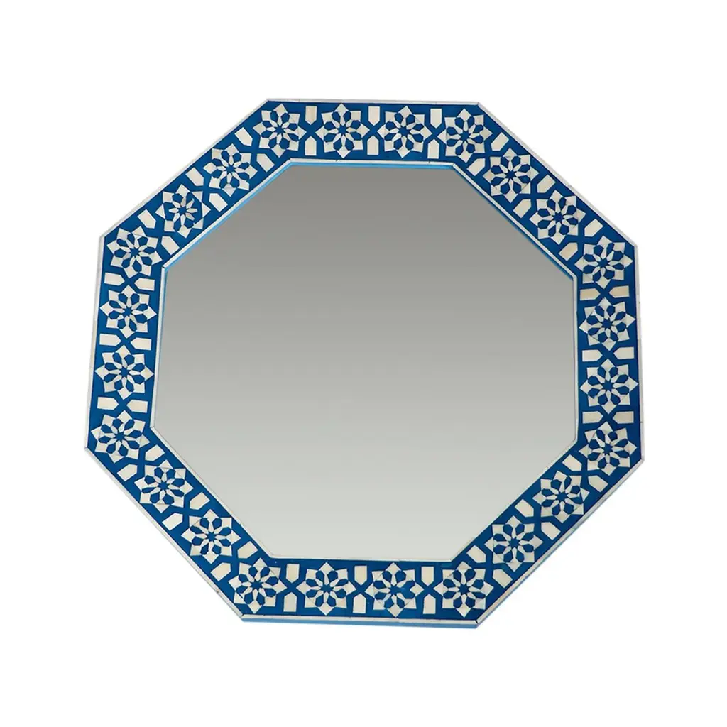 Admire your own beauty in this octagonal mirror designed by Sheherazade’s Rachid Ouassil. The arabesque pattern is created using bone inlay on top of medium-density fiberboard. Size 30"" x 30" Solid wood frame; bone inlay Mirrored glass. Each mirror is one of a kind. Imported.