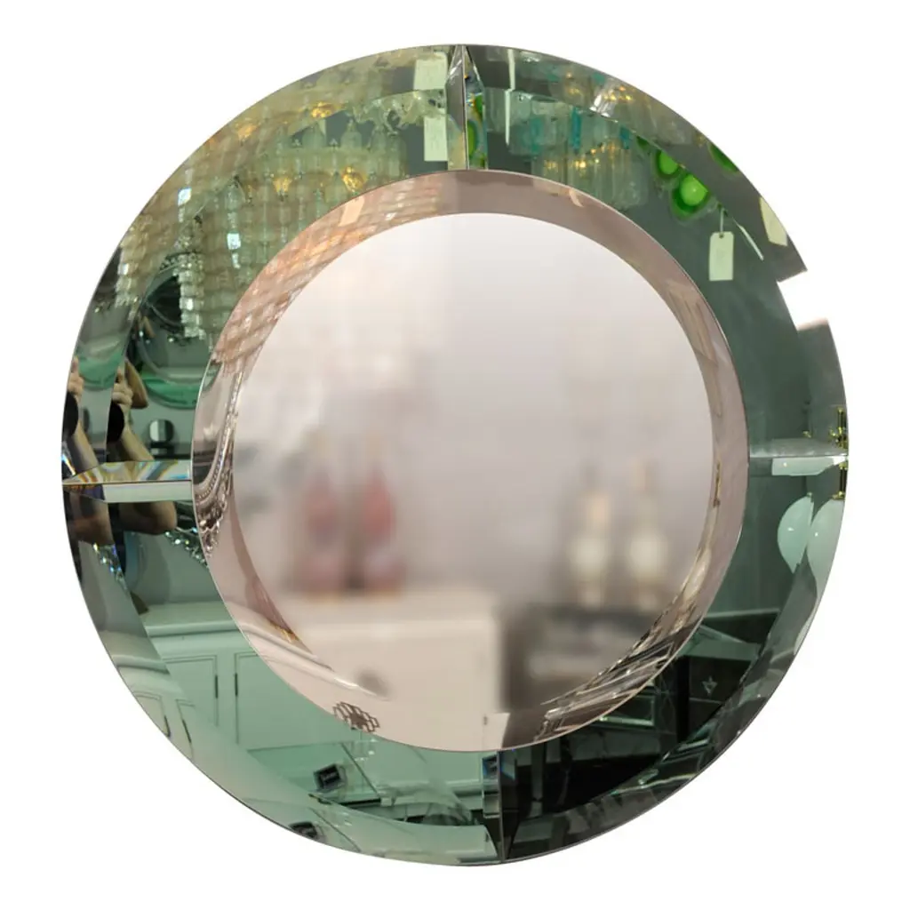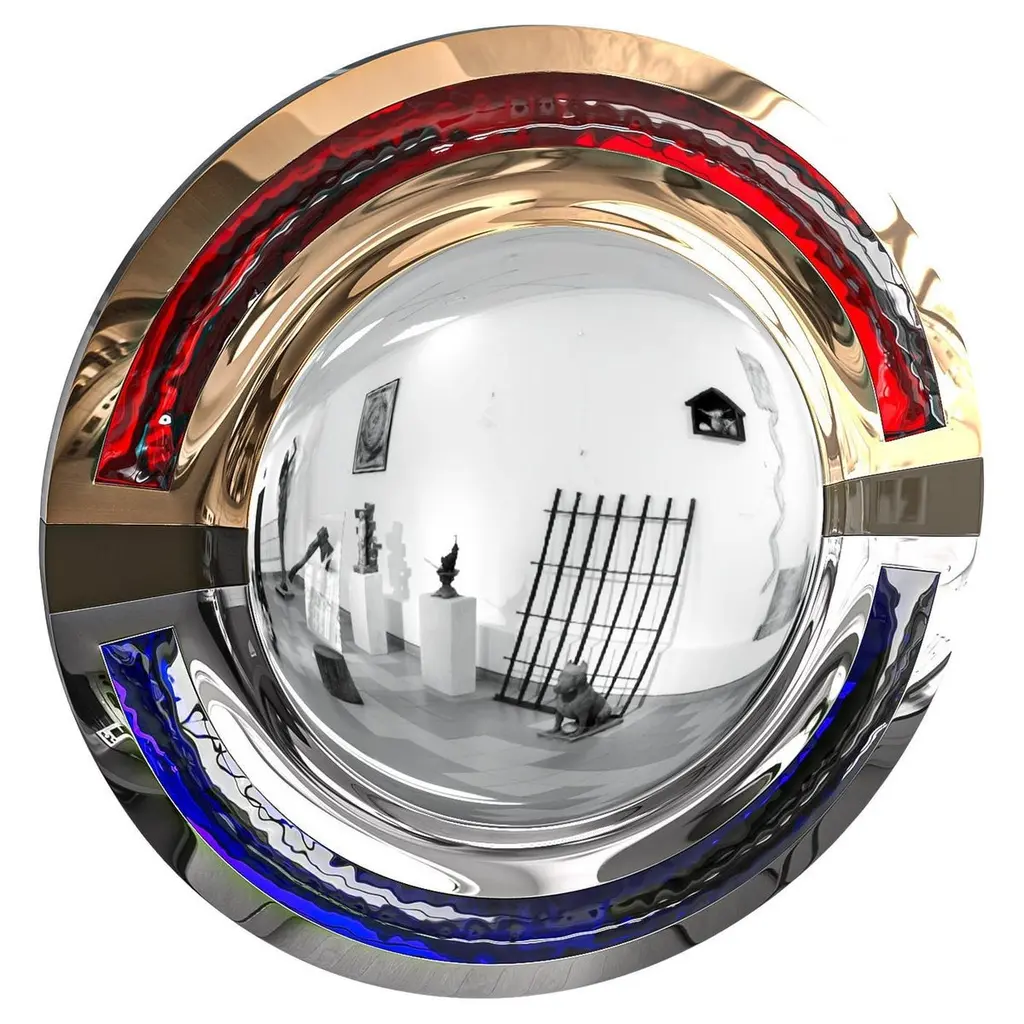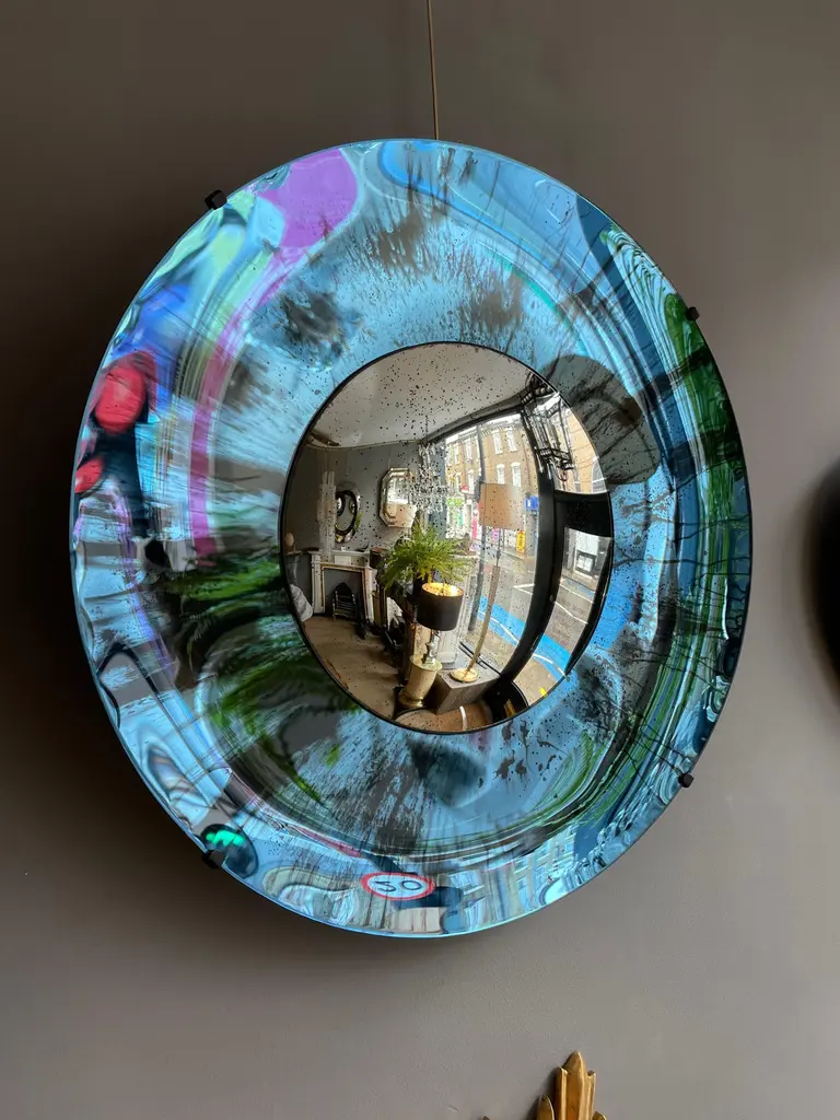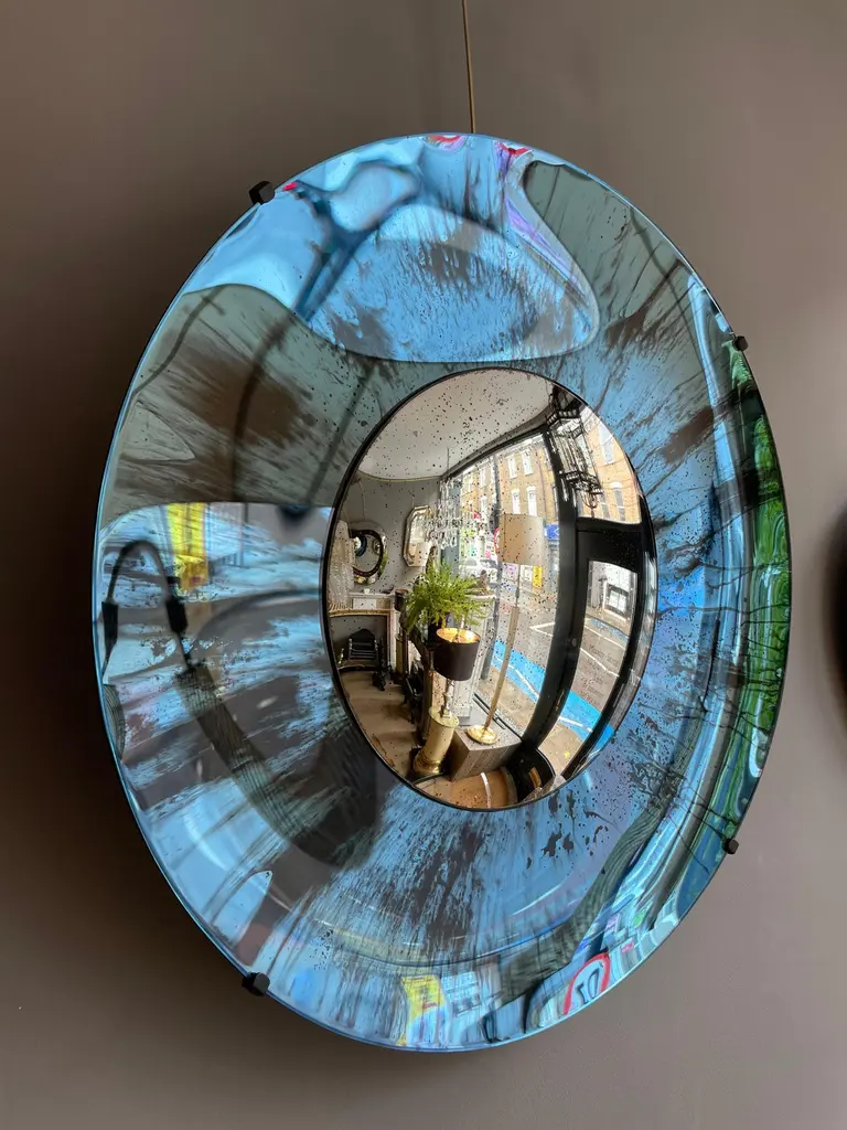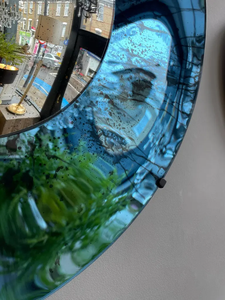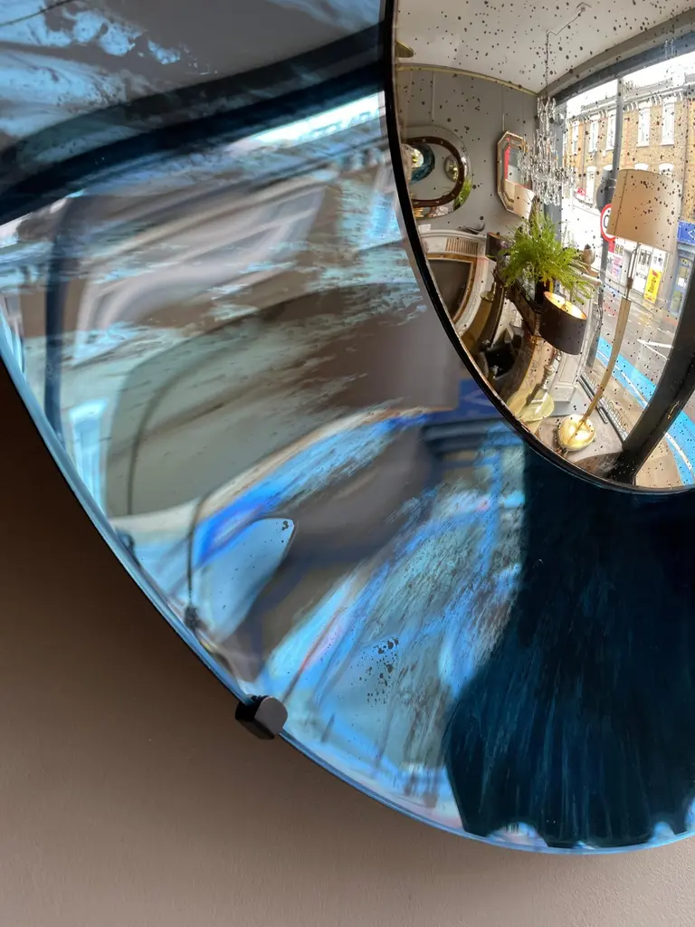 A large Blue concave distressed glass mirror with inner convex mirror in distressed silver glass. The mirror is fixed with 4 clips for a seamless frame finish.