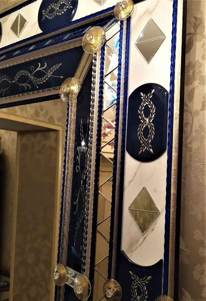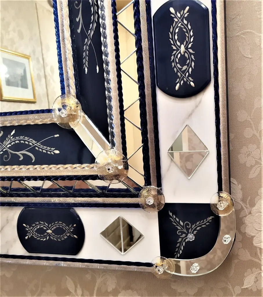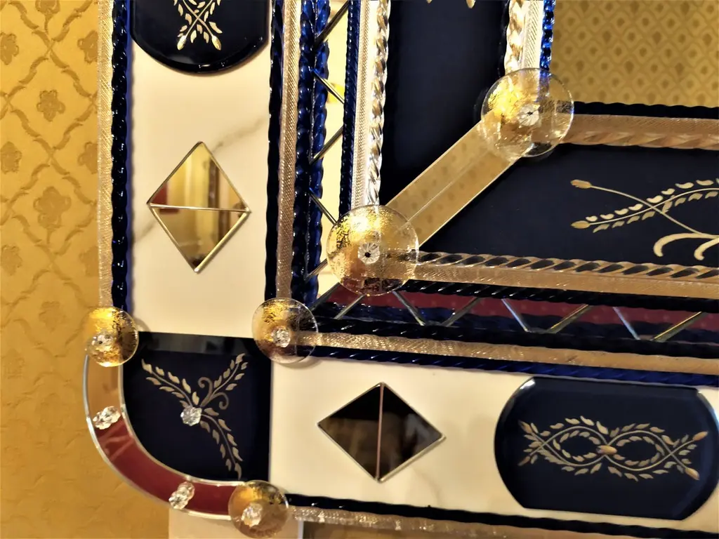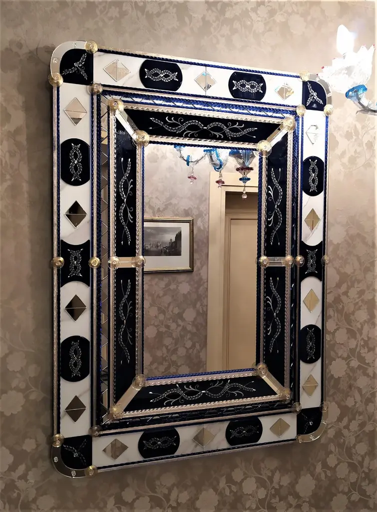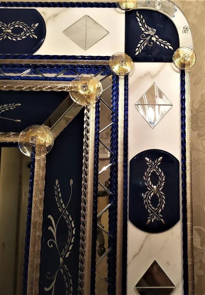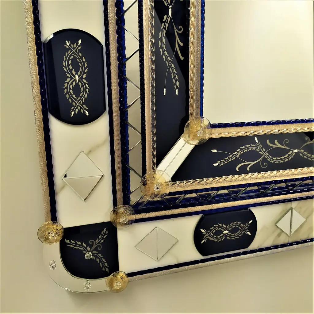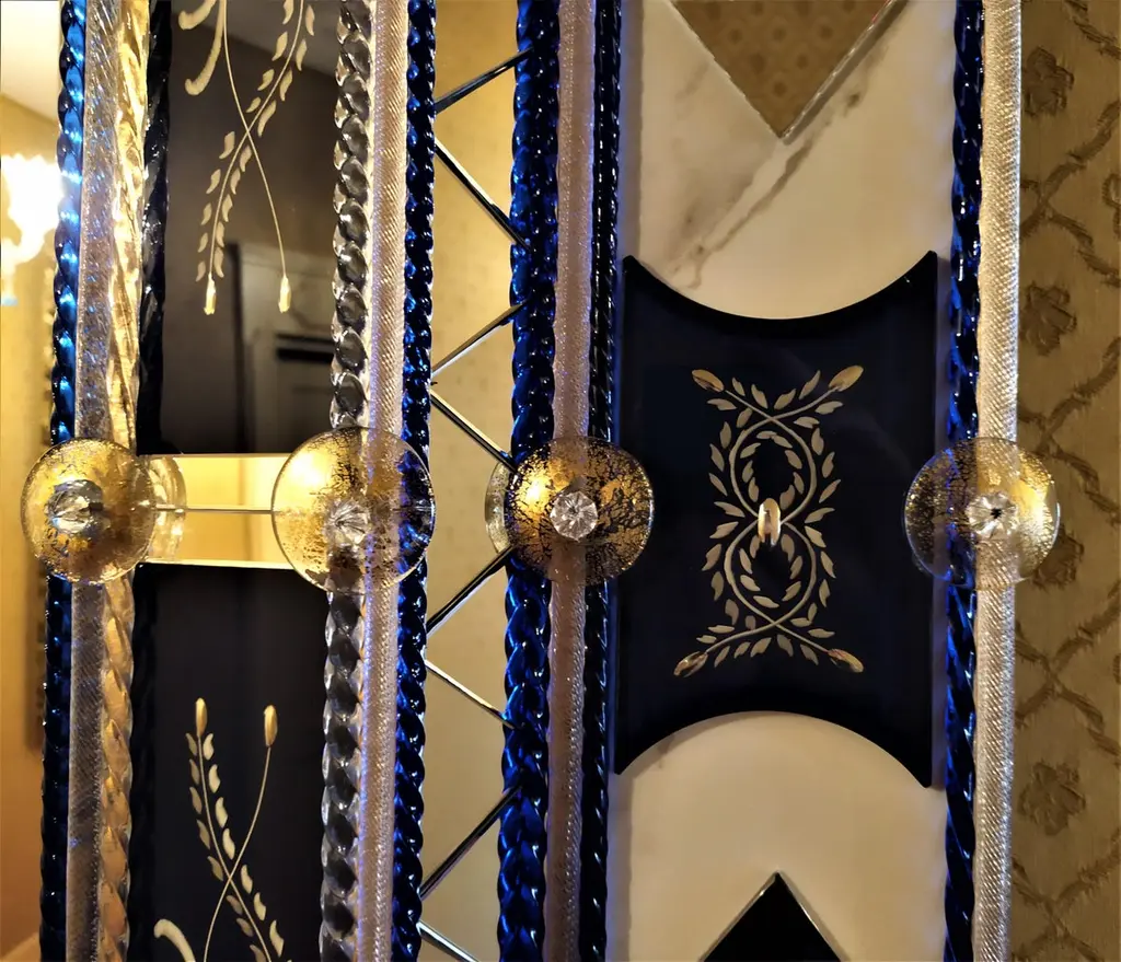 Mirror in Murano glass, with bands and beveled pieces engraved, silvered with pure silver in blue color, with insertion of details in clear mirror in the shape of a triangle, Murano glass rods in crystal and blue color Madonna on a gold background, with finishing of round-shaped details in crystal with gold leaf, made entirely by hand following the ancient techniques of the glass masters of the fourteenth century, all inserted on a background of Carrara marble.This mirror, a classic produced by Fratelli Tosi, has been revisited in colors and finishes to be able to better fit into the new and luxurious furnishings of our days.
