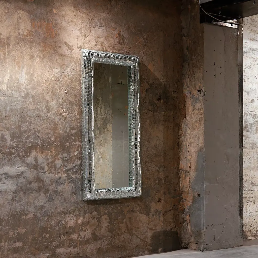 The perfect highlight of any interior in need of a glamorous accent, this superb mirror creates a luminous focal point in both classic and modern decors. The rectangular frame has a convex profile showcasing a striking mosaic of silver mirrored glass tiles hand-cut and laid out individually that will bounce natural light throughout the room. Used to either decorate a bare entryway or loft wall, enliven a mantelpiece, or add interest to a console in a living room, this statement-making mirror will create a captivating effect in any room it is placed.