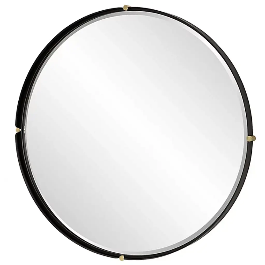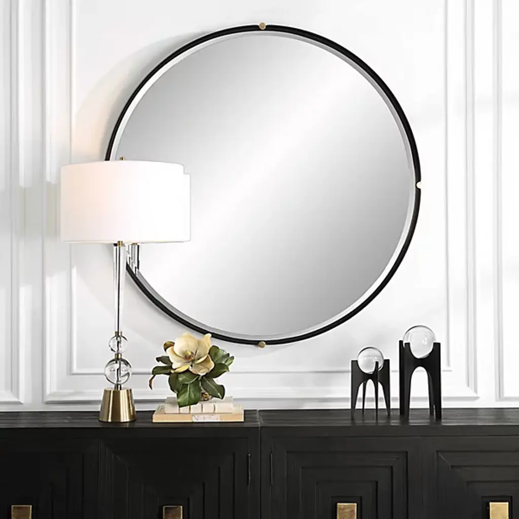 The Bonded Round Mirror from Uttermost showcases Grace Feyock's distinctive approach to industrial design. The iron frame employs a strap-style construction punctuated by decorative medallions at key points. A generous bevel adds dimension to the floating mirror surface. The frame's curved end segments introduce fluid movement to the otherwise geometric design, creating an unexpected dialogue between rigid and flowing forms.