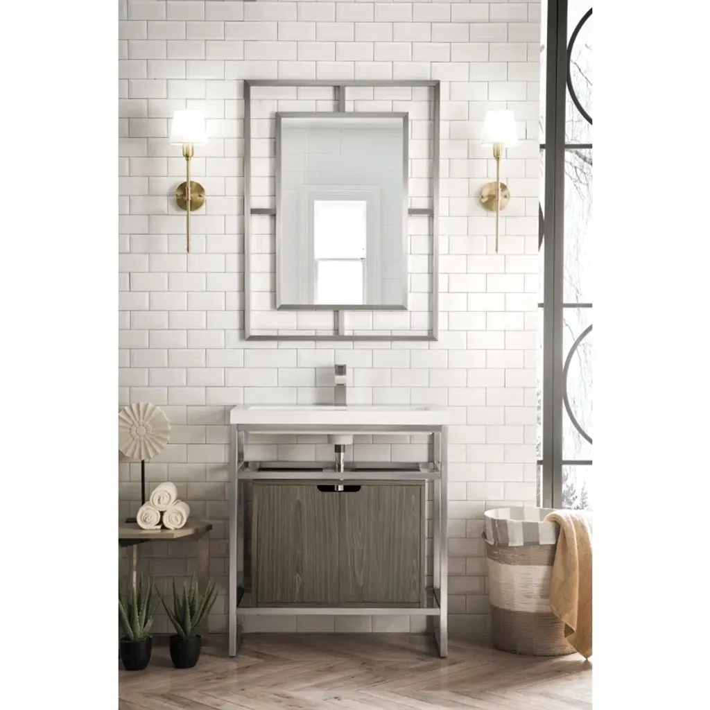 The Boston collection by James Martin is an artisan-crafted group that pairs the modern texture of stainless steel. This collection is the perfect combination of function and beauty, with its mix of metals and tops. The top is nonporous and scratch-resistant.