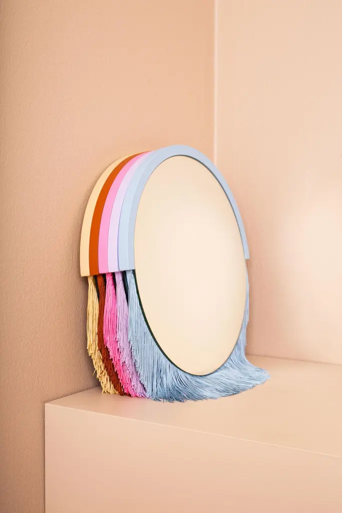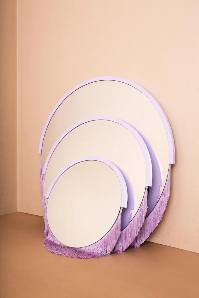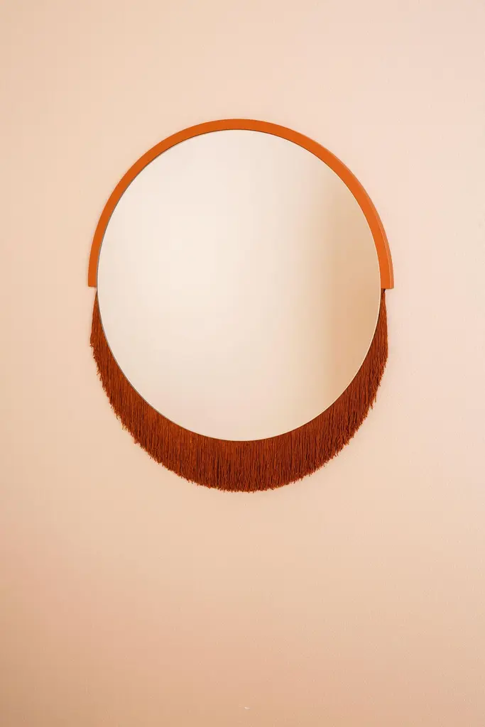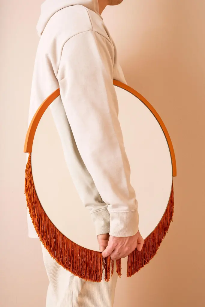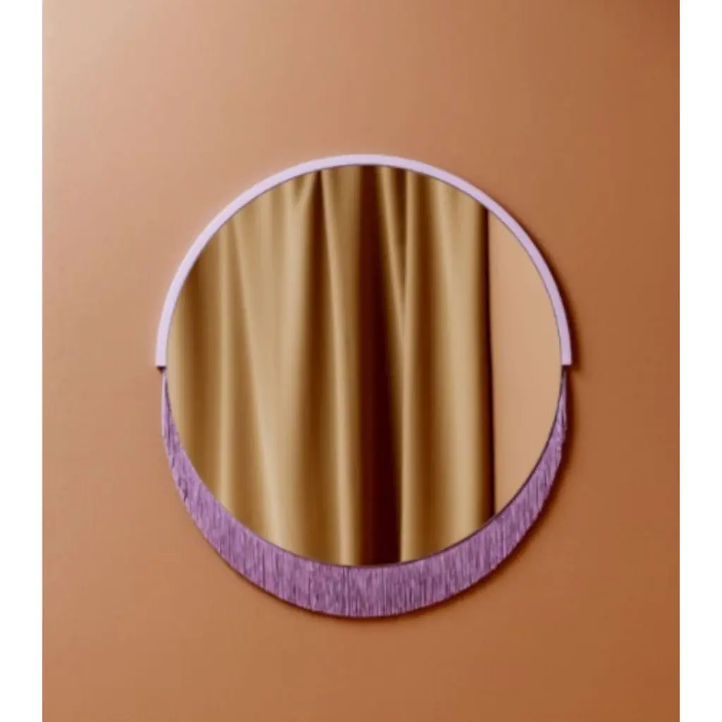 Boudoir medium wall mirror by Tero Kuitunen.Material: glass mirror, mdf board, textile fringes.Dimensions: D53 x W53 x H1.6 cmAlso available : different size, models and colors.Playful wall mirrors with fringe detail.Designer Tero Kuitunen, b. 1986, is inspired by the interface of design and art, the unprejudiced apposition of things, floating sceneries, and the meaning of humor and touch in design. Alongside product design, Tero is known for concept and space planning as well as memorable projects of contemporary art and design. He has graduated as a designer from the Applied Arts MA program at the Aalto University School of Art, Design and Architecture. Tero works as a product, concept and interior designer in projects for clients such as Supercell, Absolut Vodka, Hakola and many more. Currently Tero is working as a freelance designer with a vast experience in the design and art field. He has participated in international exhibitions and fairs in e.g. Beirut, Stockholm, Japan and Italy. 2019-2020 he curated and created the concept for Wild at Heart exhibition that toured to Vienna, Budapest, Stockholm, Tokyo and Helsinki. In 2021 Tero was invited to create together with Karoliina Hellberg and Raimo Saarinen a new exhibition at the prominent Amos Rex Museum. Tero has received a one-year working grant from the Finnish Cultural Foundation in 2017 and projects grands from Arts Promotion Centre Finland and City of Kotka.Throughout his work, Tero wants to find something that moves and touches people. Materials and colours are often his biggest inspiration when starting a new design project.