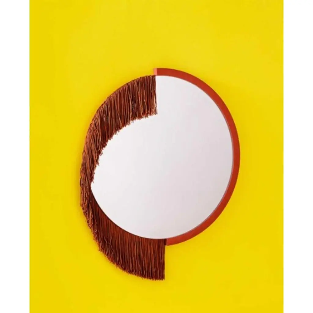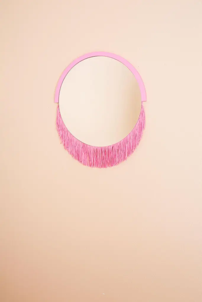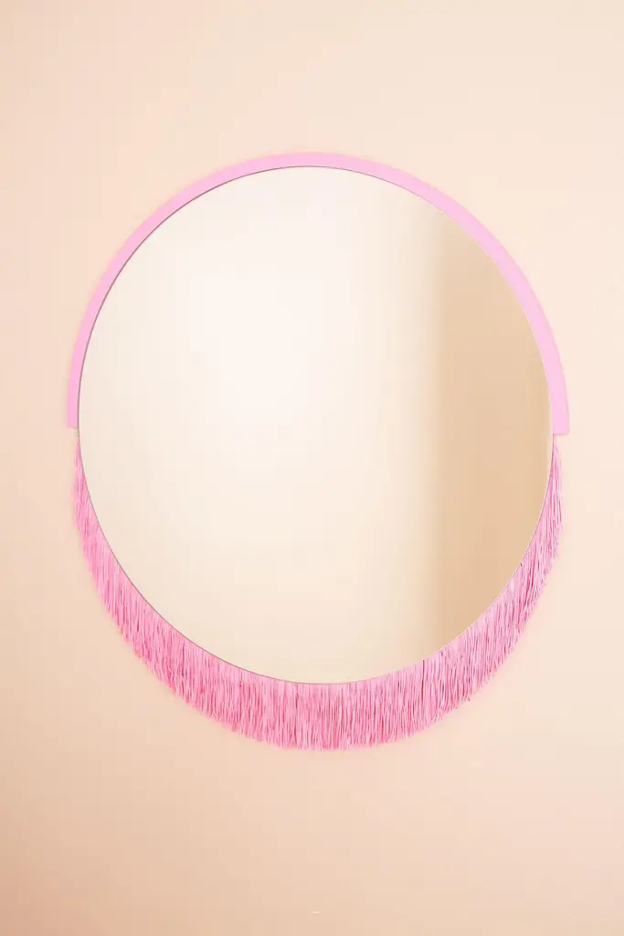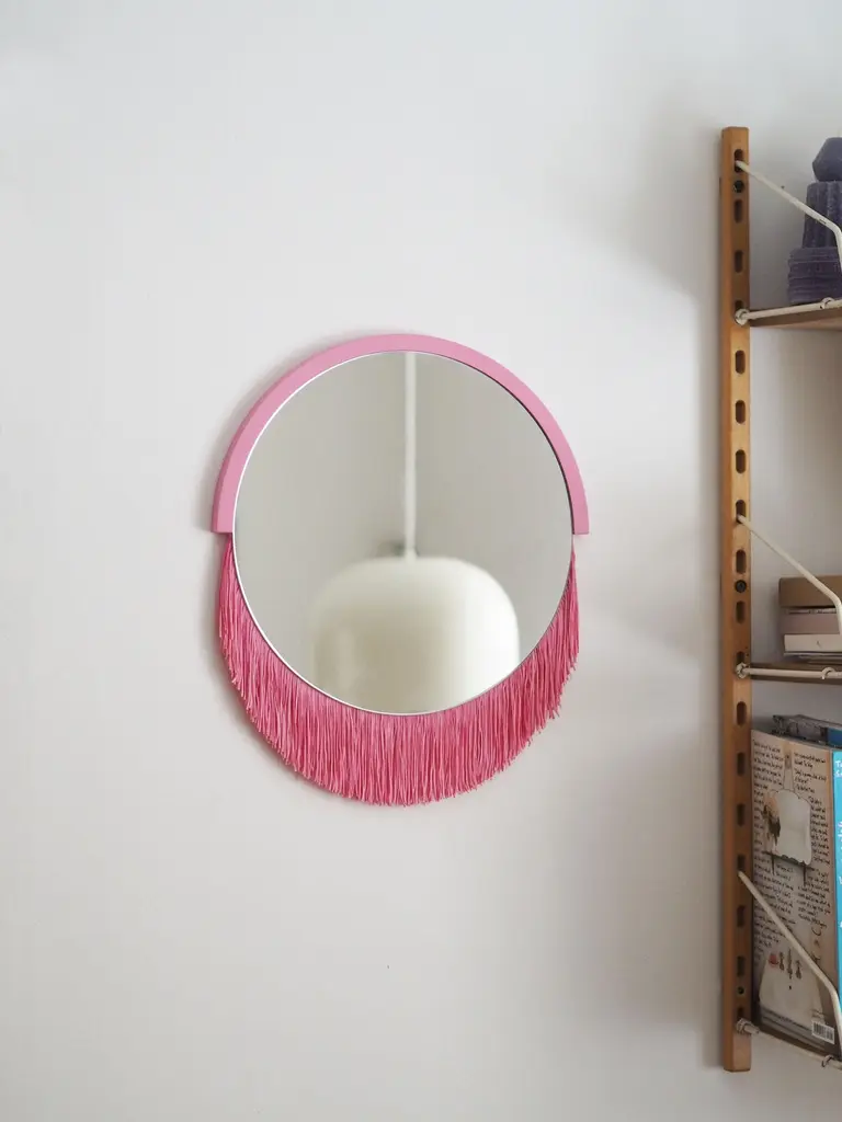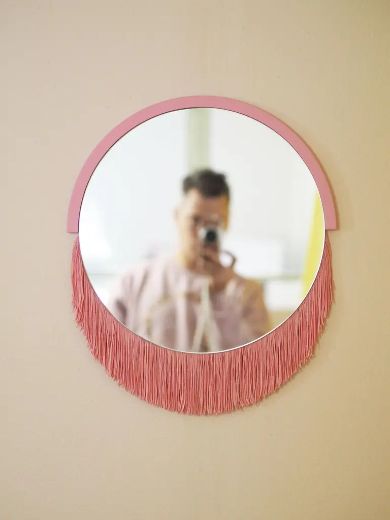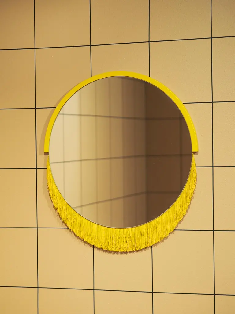 Boudoir small wall mirror by Tero KuitunenMaterial: glass mirror, mdf board, textile fringes.Dimensions: ⌀ 38 x H 2 cmAlso Available: Different Size, models and colors.Playful wall mirrors with fringe detail.Designer Tero Kuitunen, b. 1986, is inspired by the interface of design and art, the unprejudiced apposition of things, floating sceneries, and the meaning of humor and touch in design. Alongside product design, Tero is known for concept and space planning as well as memorable projects of contemporary art and design. He has graduated as a designer from the Applied Arts MA program at the Aalto University School of Art, Design and Architecture. Tero works as a product, concept and interior designer in projects for clients such as Supercell, Absolut Vodka, Hakola and many more. Currently Tero is working as a freelance designer with a vast experience in the design and art field. He has participated in international exhibitions and fairs in e.g. Beirut, Stockholm, Japan and Italy. 2019-2020 he curated and created the concept for Wild at Heart exhibition that toured to Vienna, Budapest, Stockholm, Tokyo and Helsinki. In 2021 Tero was invited to create together with Karoliina Hellberg and Raimo Saarinen a new exhibition at the prominent Amos Rex Museum. Tero has received a one-year working grant from the Finnish Cultural Foundation in 2017 and projects grands from Arts Promotion Centre Finland and City of Kotka.Throughout his work, Tero wants to find something that moves and touches people. Materials and colors are often his biggest inspiration when starting a new design project.