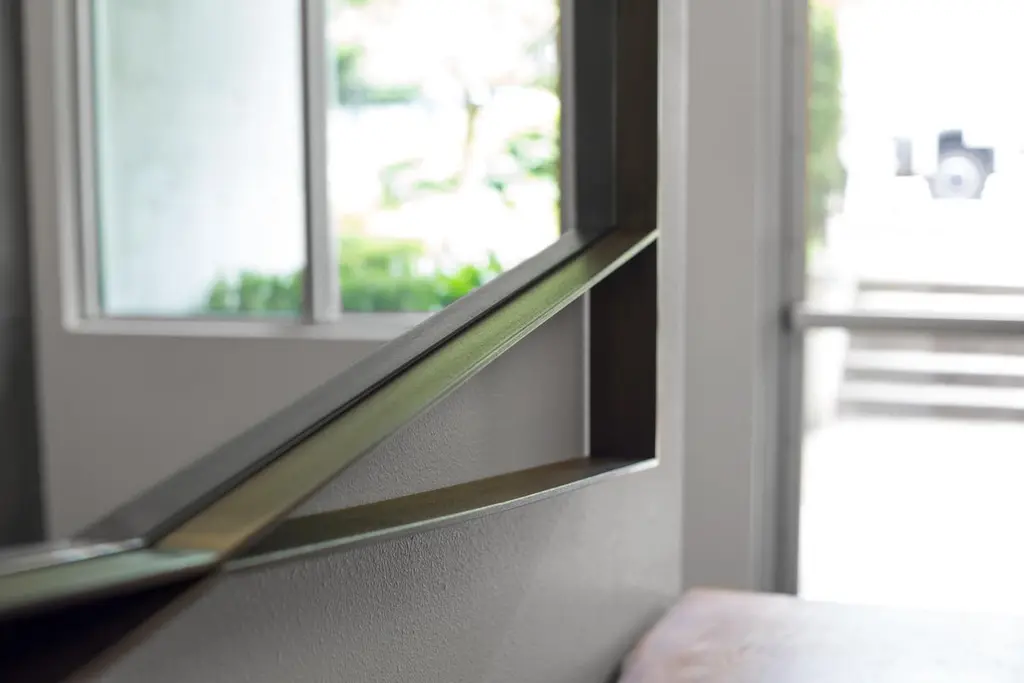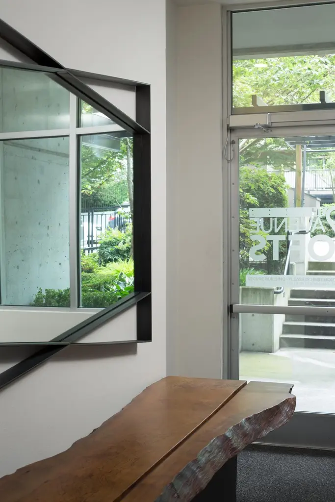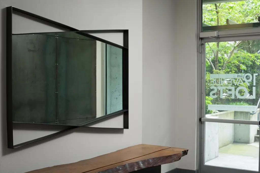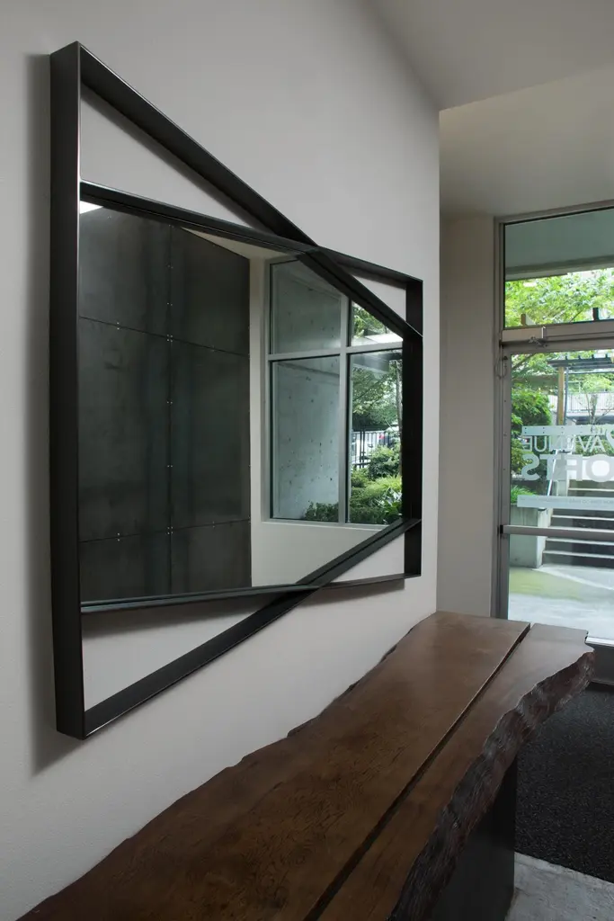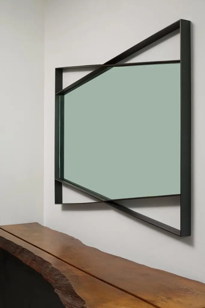 The Bow Tie Mirror is a statement piece for any residential or commercial setting. The geometry of the steel frame is finely constructed and finished to perfectly outline the hexagonal mirror. A wide, yet thin profiled metal gives this mirror depth and dimension. Thoughtful line-work is designed to create an uncommon and playful accent for interiors. The Bow Tie Mirror's steel framework is blackened, oiled and waxed for a sleek and dramatic finish. The mirror's edges are flat polished for a refined detail when reflected into the steel's satin finish. Its dynamic shape and seamless detail is designed to make a room feel elevated, spacious and welcoming.The Bow Tie Mirror is designed and made-to-order by Force/Collide in our Seattle, WA studio. Customizations in size and finish are available for this piece.
