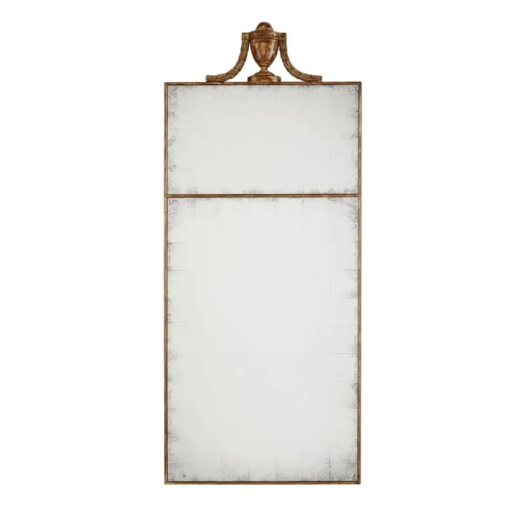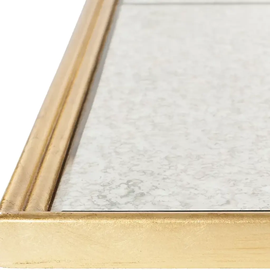 The memorable design of the Brantley Mirror gives interiors a vintage appeal. More of an art piece than an actual mirror, it sinks square glass tiles with beveled edges into a contoured wood frame surfaced in rich gold. Each tile is subtly antiqued, giving its surroundings a vintage look, though its reflecting capabilities are compromised in favor of the artistic elements.
