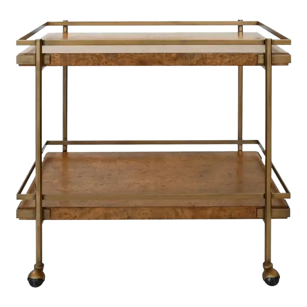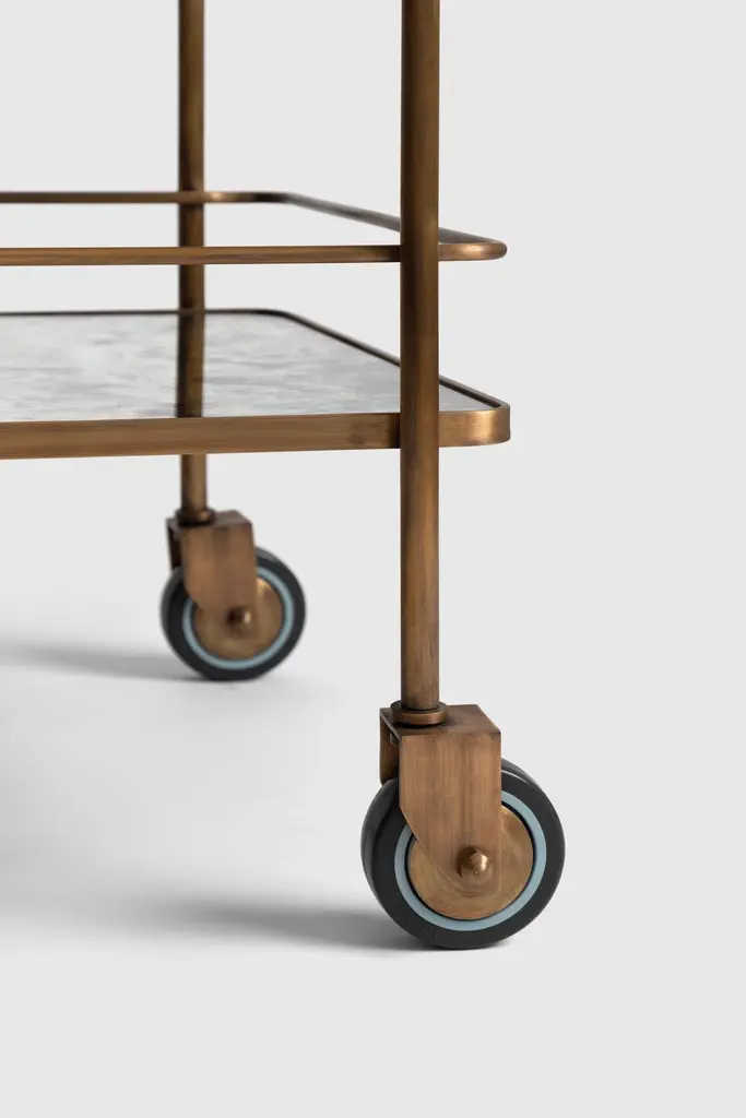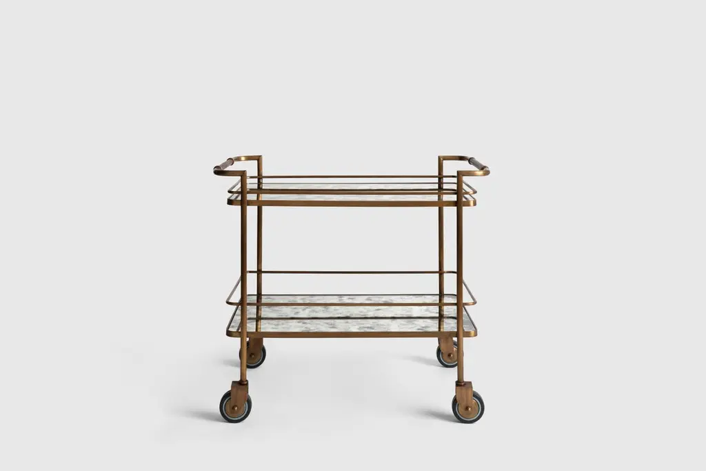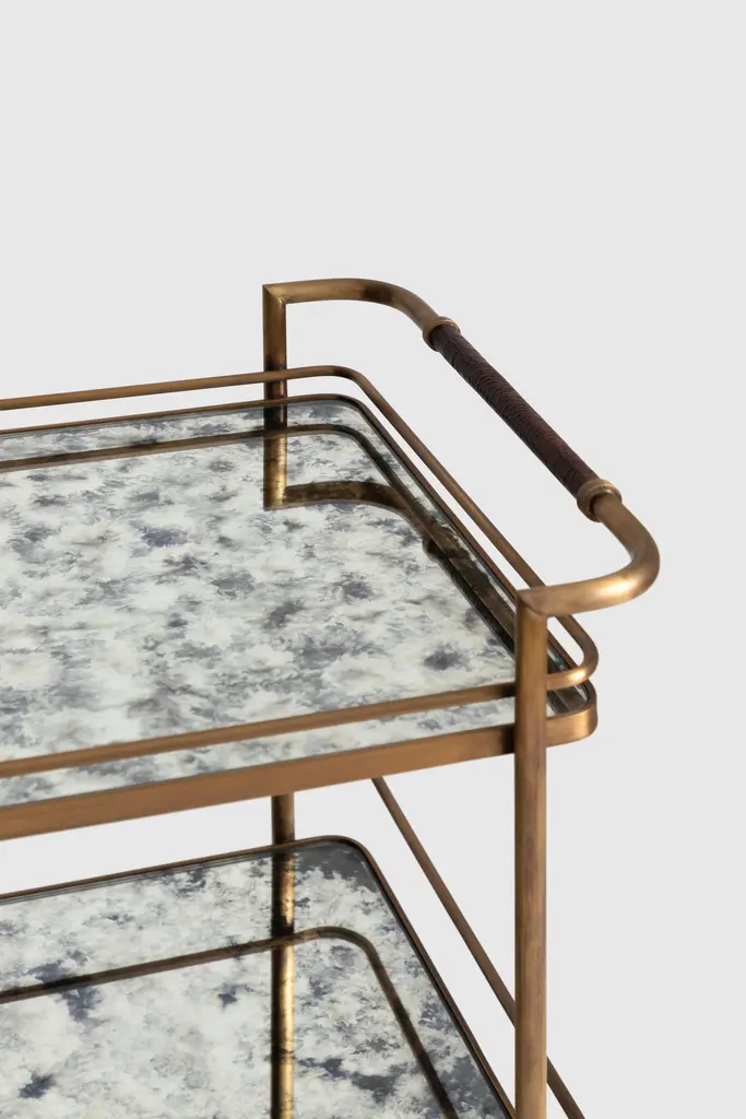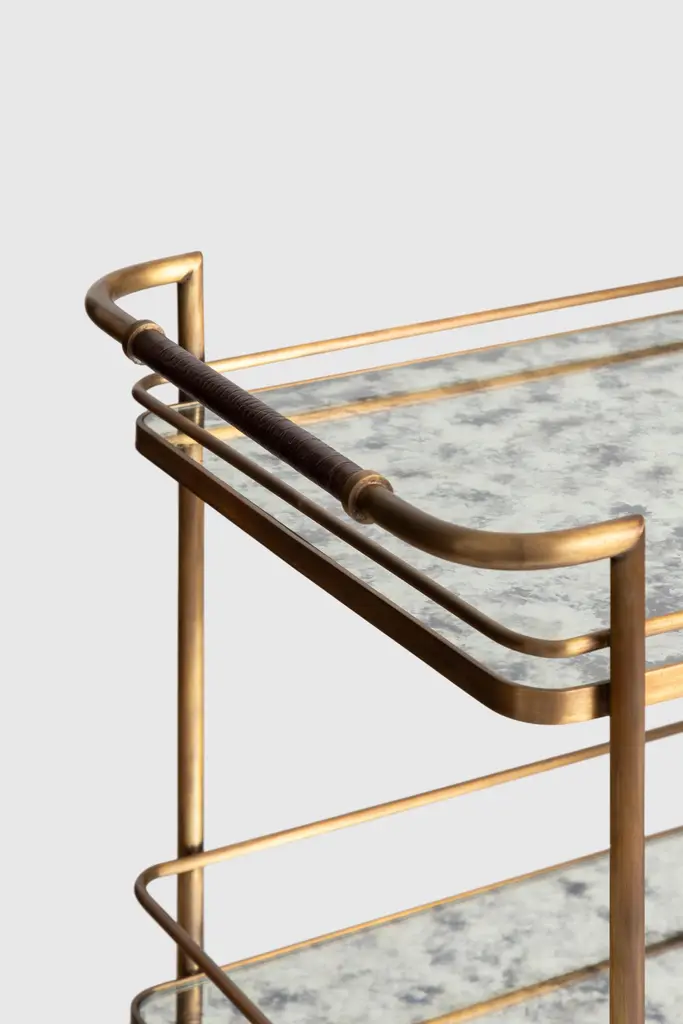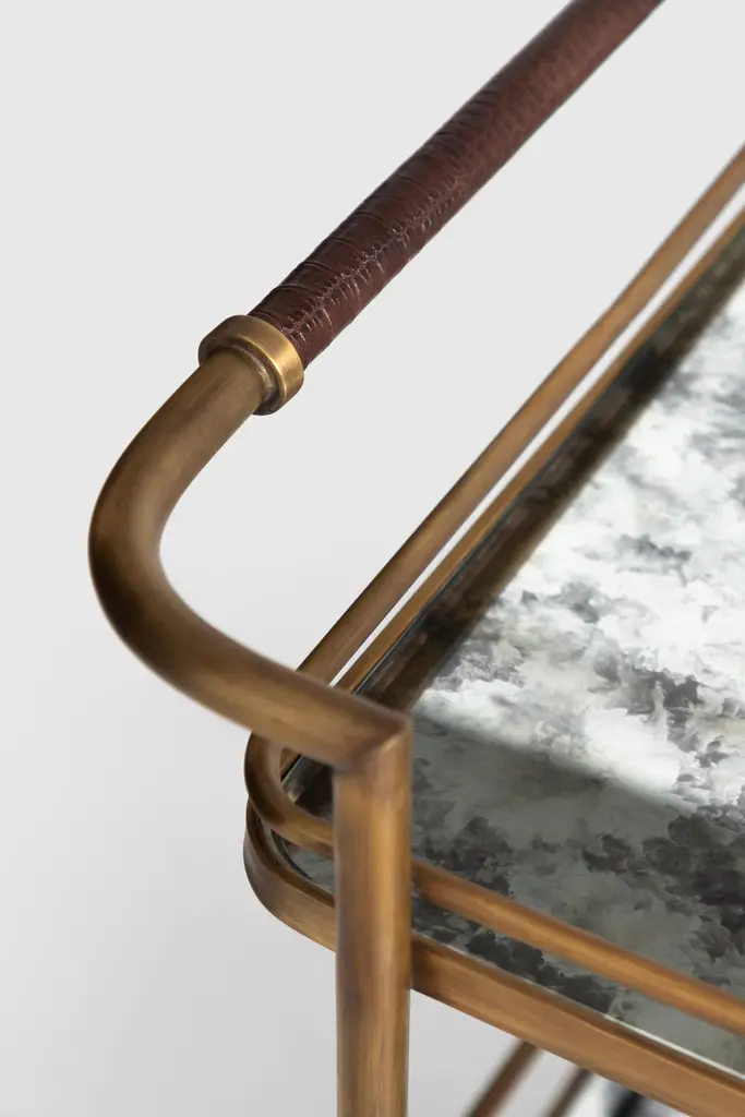The Vendôme Bar Cart is perfect to style any room. That's why it remains one of our bestselling pieces. It is made by our craftsmen in brass, with age mirror and leather making it a unique statement piece. It can be styled several different ways for it to fit your area best. The finishes are also custom, including: black, charcoal, green patina, antique brass, satin brass, satin nickel, polished brass, polished nickel
