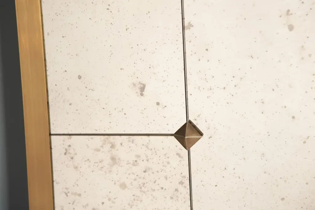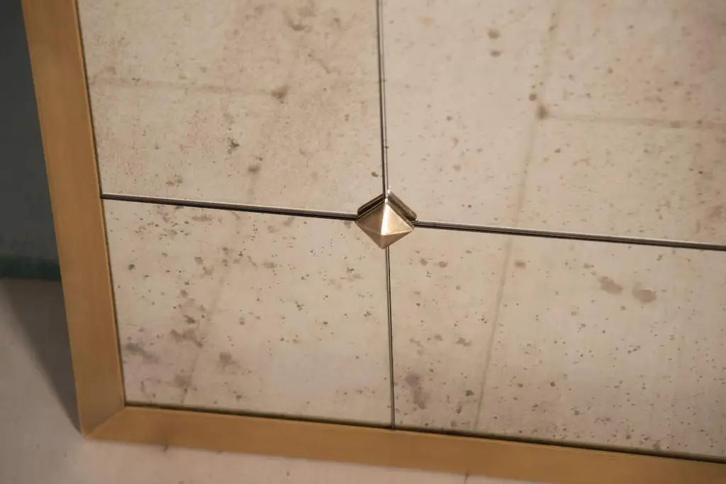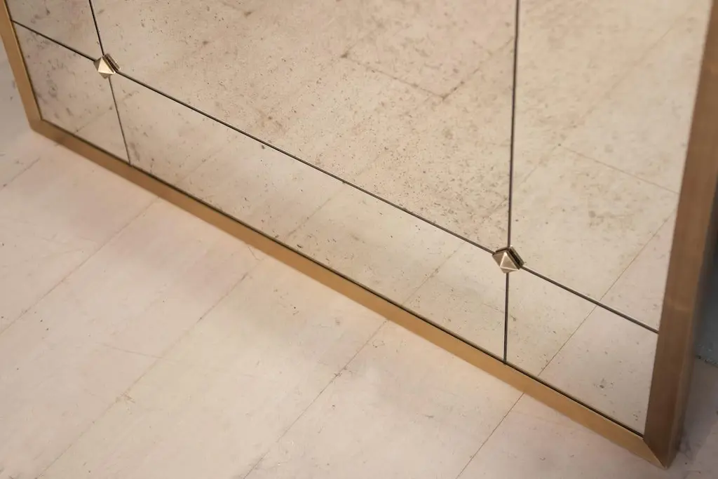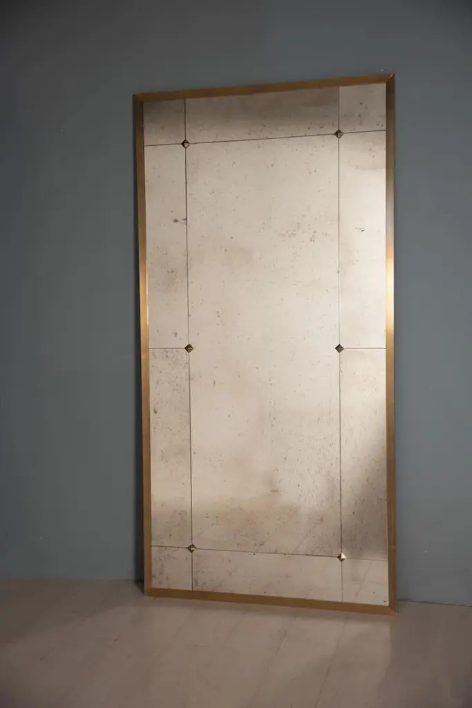 In this card, rectangular mirror measuring 100 x 200h cm, frame in burnished brass, edge L 3x3 cm, mirror with aged effect and framed with round brass studs.Pescetta presents the Collection of Brass Mirrors, made to measure and fully customisable. Designed both for sumptuous residences with a classic taste and for more contemporary interiors, it is inspired by the Art Deco atmospheres of Parisian bistros at the turn of the century. Each mirror is a unique piece, handcrafted and characterised by the quality of the Made in Italy finishes and materials. Delivery time about 20 working days. Shipping worldwide.The price including VAT refers to a mirror with the following characteristics:Shape: rectangularSize: 200h x 100 cmBrass frame: L profile 3x3 cmBrass finish: burnished effectMirror panels: squared with studsMirror: aged glass - black and white typeAccessories: round studsDESIGN YOUR MIRROR! Many details can be customised.Customise every frame detailDefine Shape and SizeChoose between polished or vintage brassDecide between L-shaped or half-nail frame profileCustomise MirrorReframe the mirror with brass studs or profilesChoose the type of mirror: Classic, Antique, Smoke, Bronze or Ground.Add accessories such as lights, coat hooks or studs.