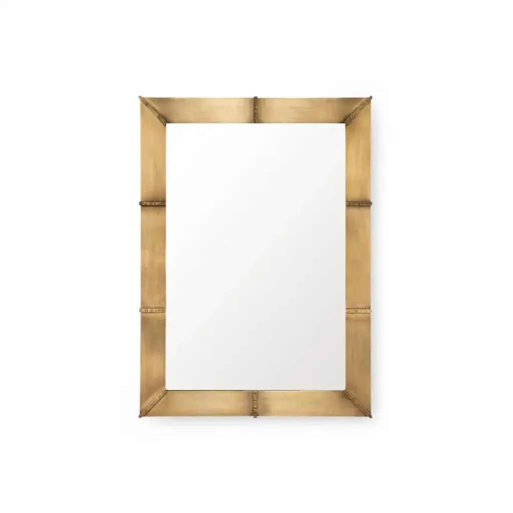 With its broad frame of antique-finished brass, the Brea Mirror brings dignified warmth, doubling as a functional piece and a sophisticated accent. A classic rectangular shape keeps the Brea anchored in tradition, as its embellishments of delicate, hand-hammered metallic ribbons speak to the quality of its craftsmanship. The glint of its subtle golden sheen is sure to catch the eye from across the room, instantly drawing you in for a gaze at both your reflection and the fine detailing bordering it. Either hung vertically or horizontally, this piece boasts unparalleled presence.