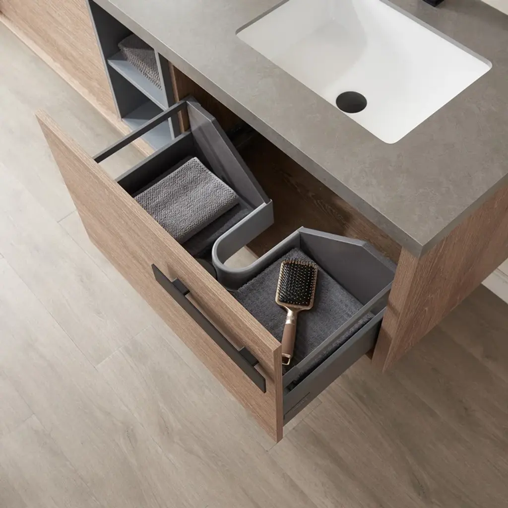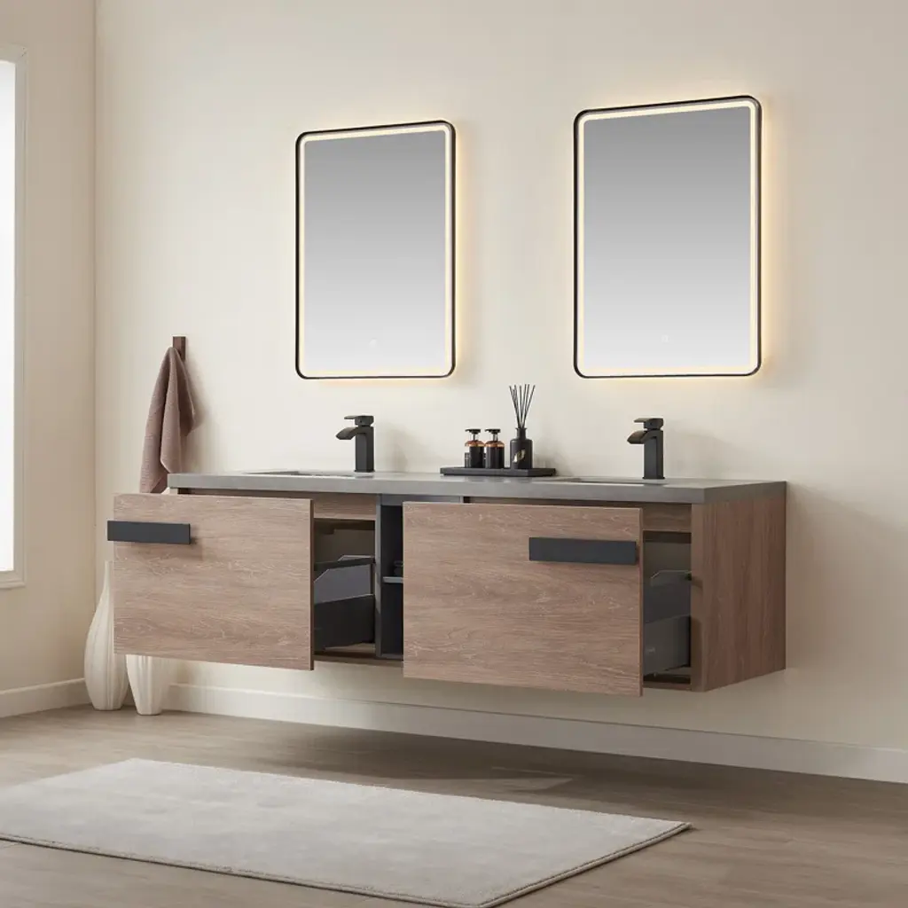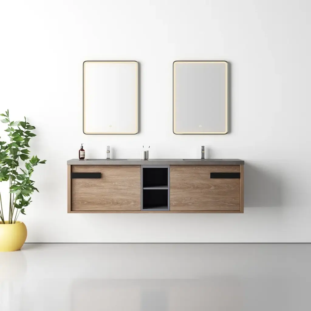 This modern wall-mounted vanity offers a sleek and sophisticated design for your bathroom. With its spacious drawers, you'll enjoy ample storage space. The vanity seamlessly integrates a double sink, providing a convenient and stylish solution for your daily routine. Experience the ultimate blend of functionality and contemporary design.