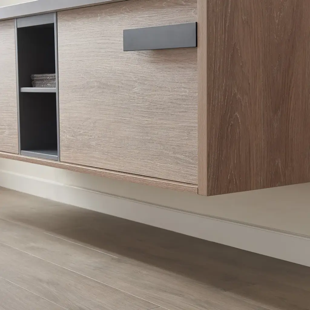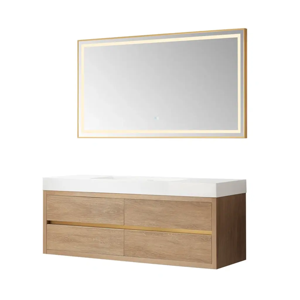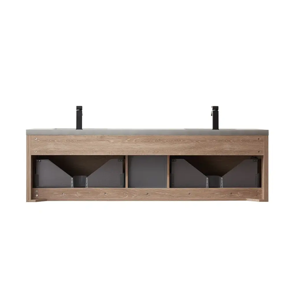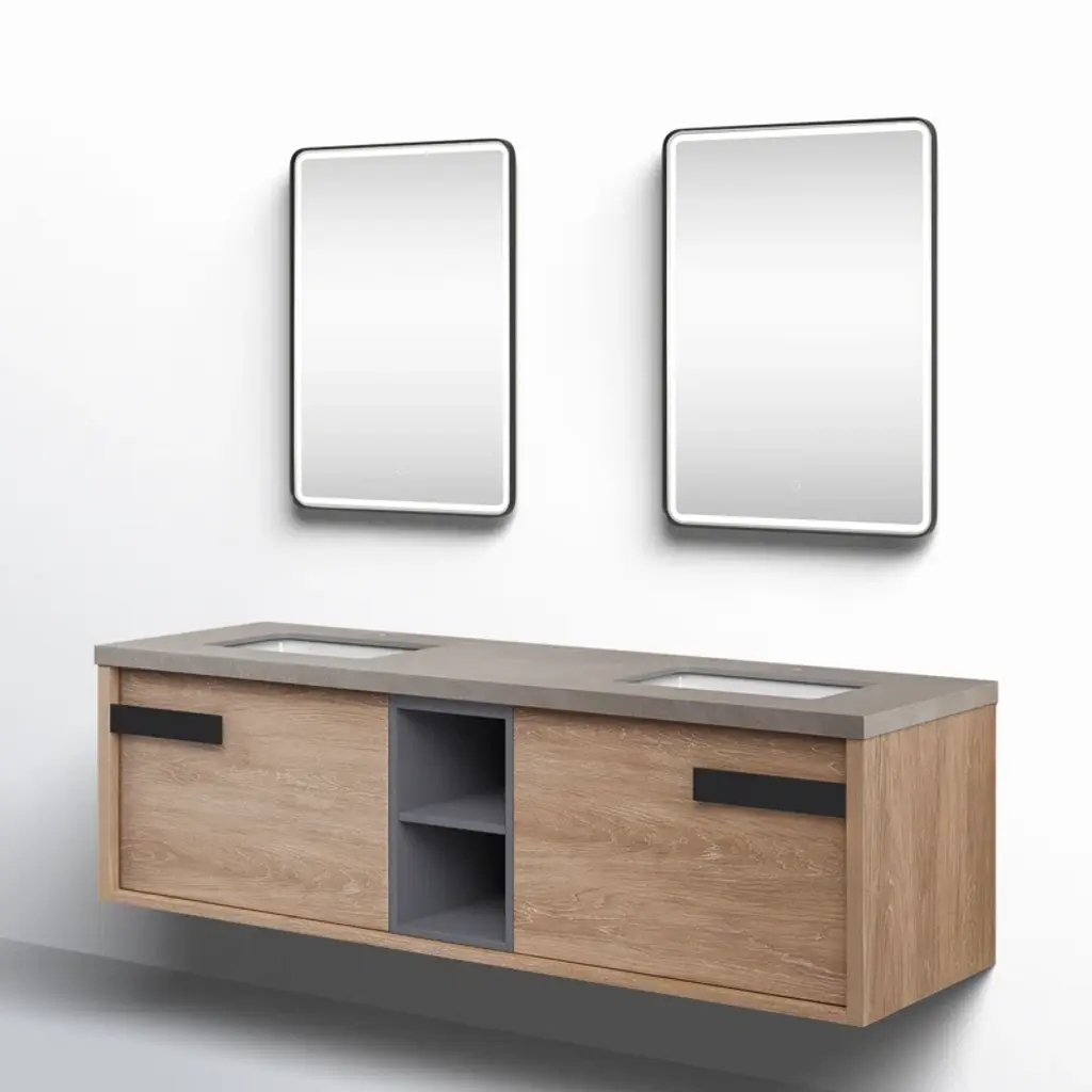This modern wall-mounted vanity offers a sleek and sophisticated design for your bathroom. With its spacious drawers, you'll enjoy ample storage space. The vanity seamlessly integrates a double sink, providing a convenient and stylish solution for your daily routine. Experience the ultimate blend of functionality and contemporary design.