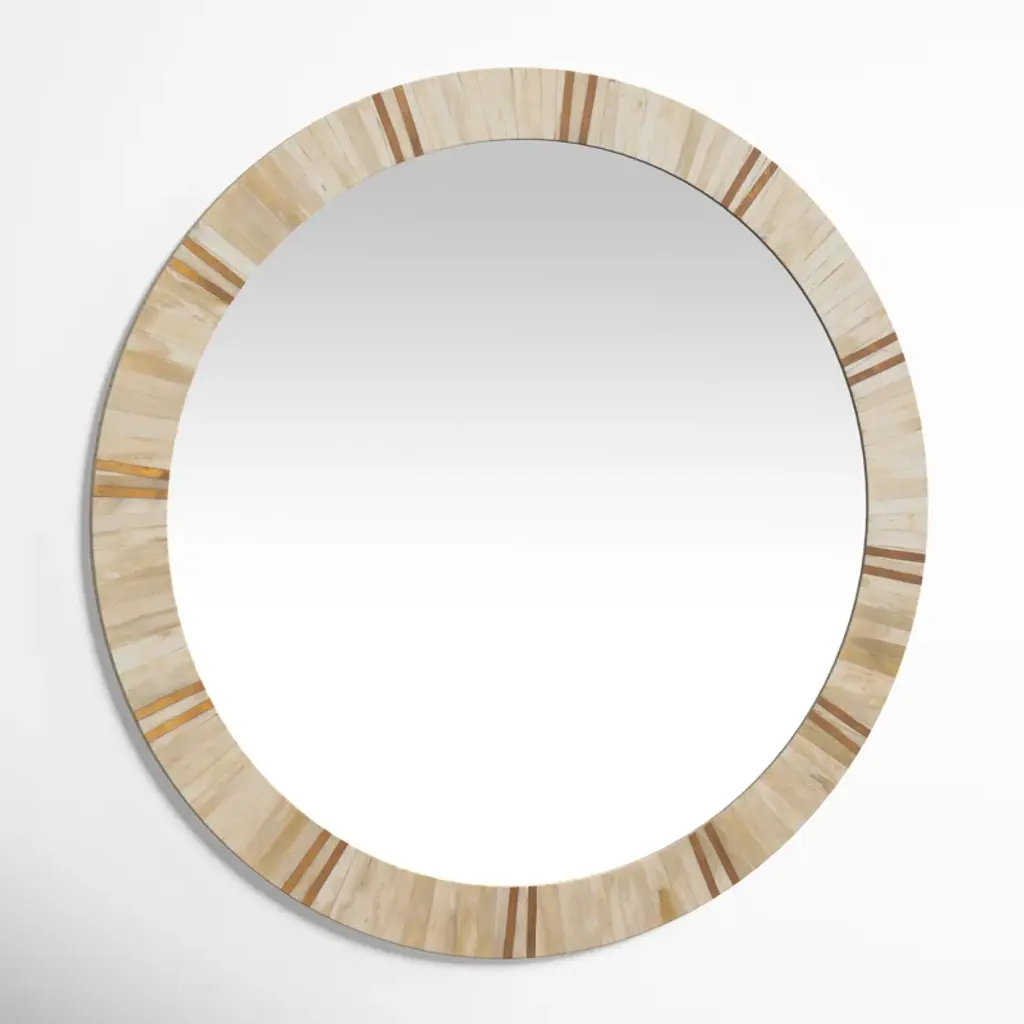 This accent mirror, featuring a sleek, modern design, effortlessly elevates your interior. Its convex shape adds a unique visual element, while the bone frame brings a touch of natural sophistication. Perfect for modern and contemporary spaces.
