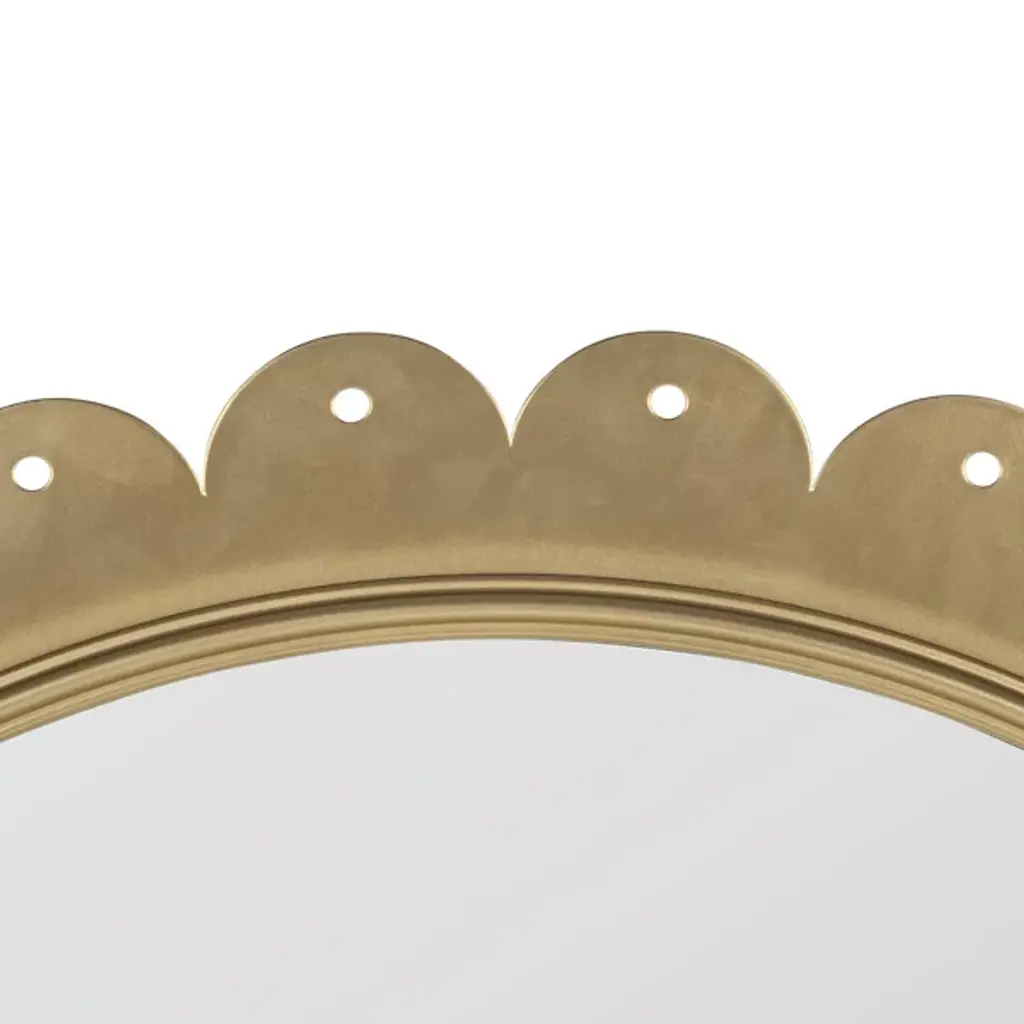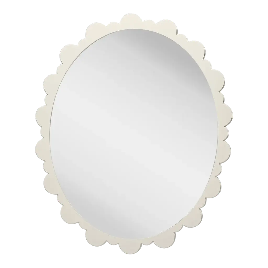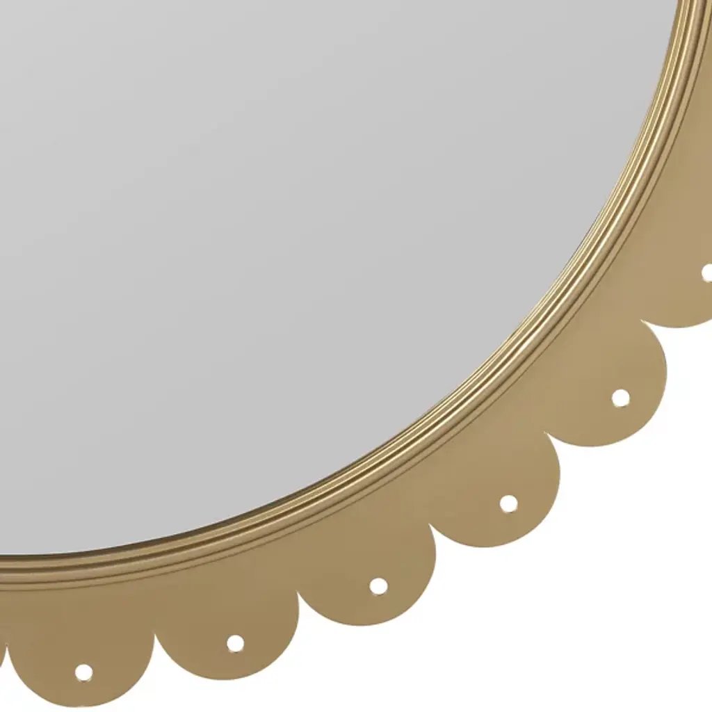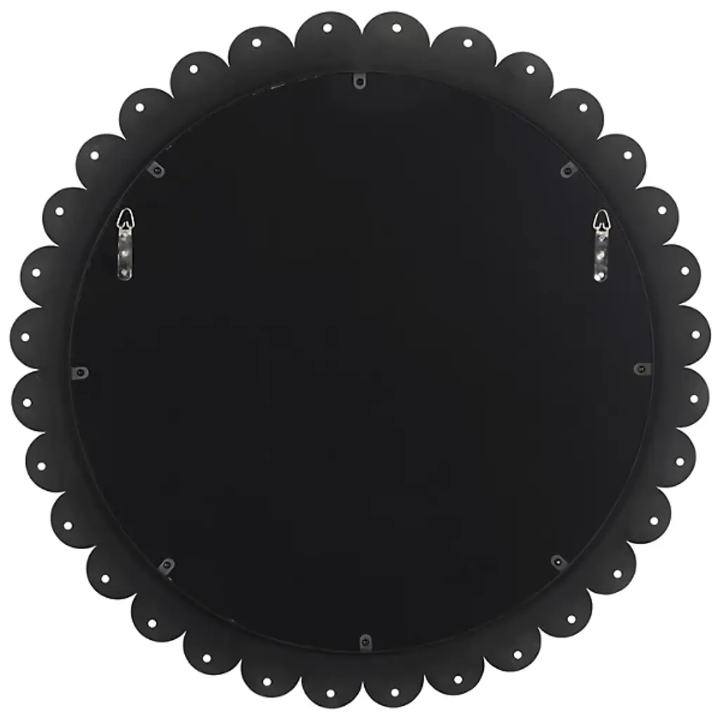 The Bria Hammel x Cooper Classics Candler Mirror combines playful scallops with precise metalwork. Each rounded edge along the border features a delicate perforation, creating a lace-like pattern around the circular frame. The design draws inspiration from vintage doilies and needlework patterns while maintaining a modern sensibility. This wall mirror brings decorative charm to powder rooms, dressing areas, and bedroom walls. The metal construction ensures durability while allowing for intricate detail work around the perimeter.