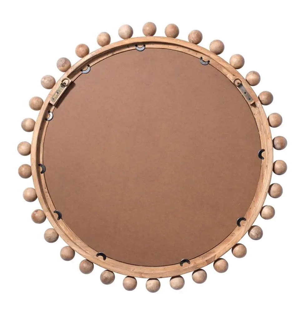 This handcarved wood wall mirror is ornamented with nearly three dozen small wood balls. The sweet yet sophisticated spherical accents are finished naturally, as is the frame of the mirror, to highlight the natural grain of the wood and incorporate it into the design.