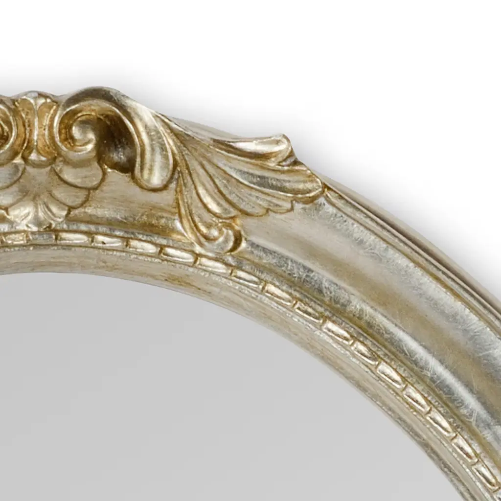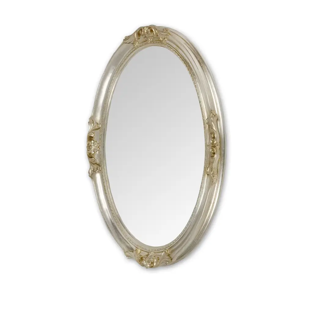 A magnificent homage to the classic Baroque style, this oval mirror is sure to add a dash of opulence to any classic or contemporary decor for an eclectic touch. The minutely carved wooden frame is luxuriously covered with antiqued silver leaf, a choice simultaneously lending it a fancy and refined style. The back comes equipped with hooks for a quick horizontal or vertical display.