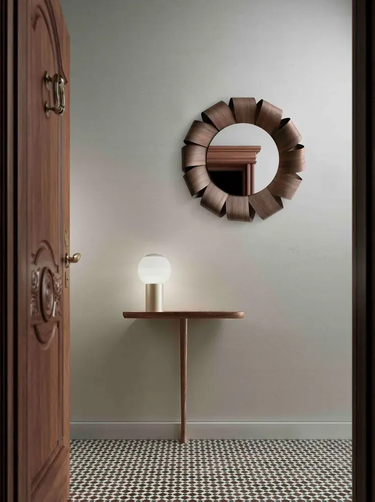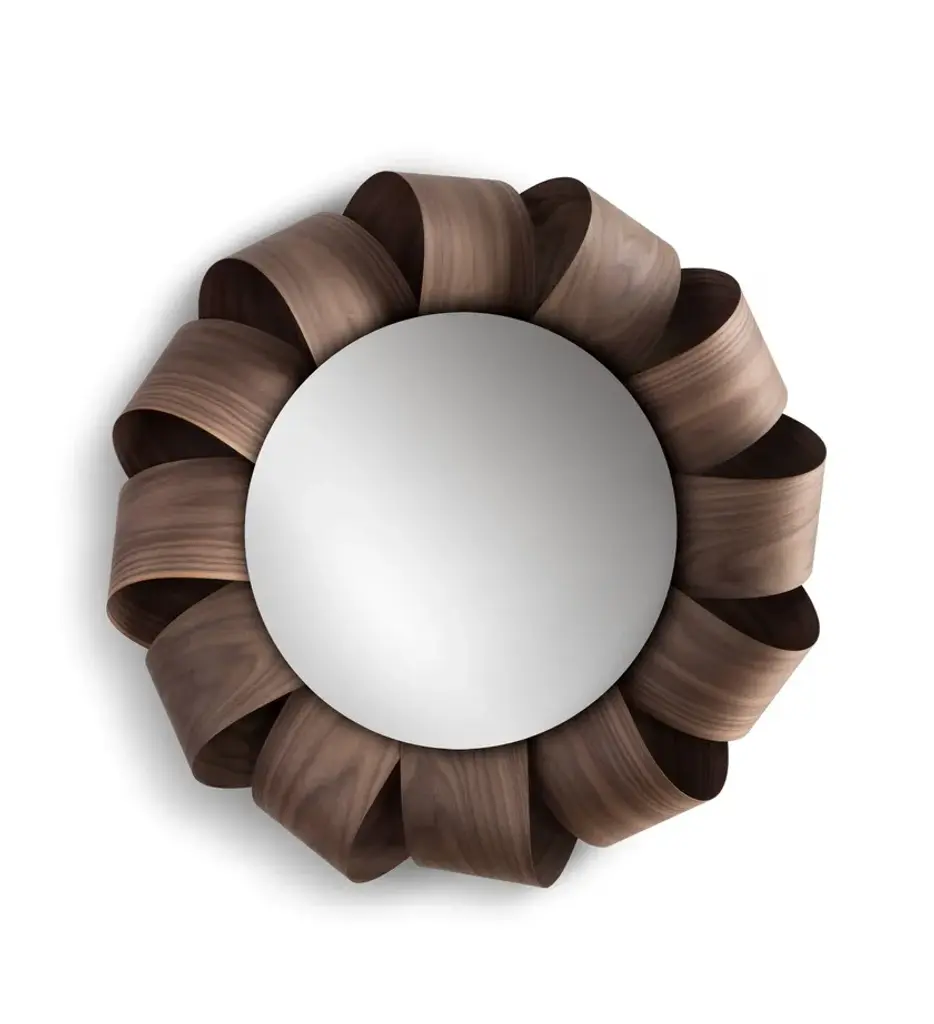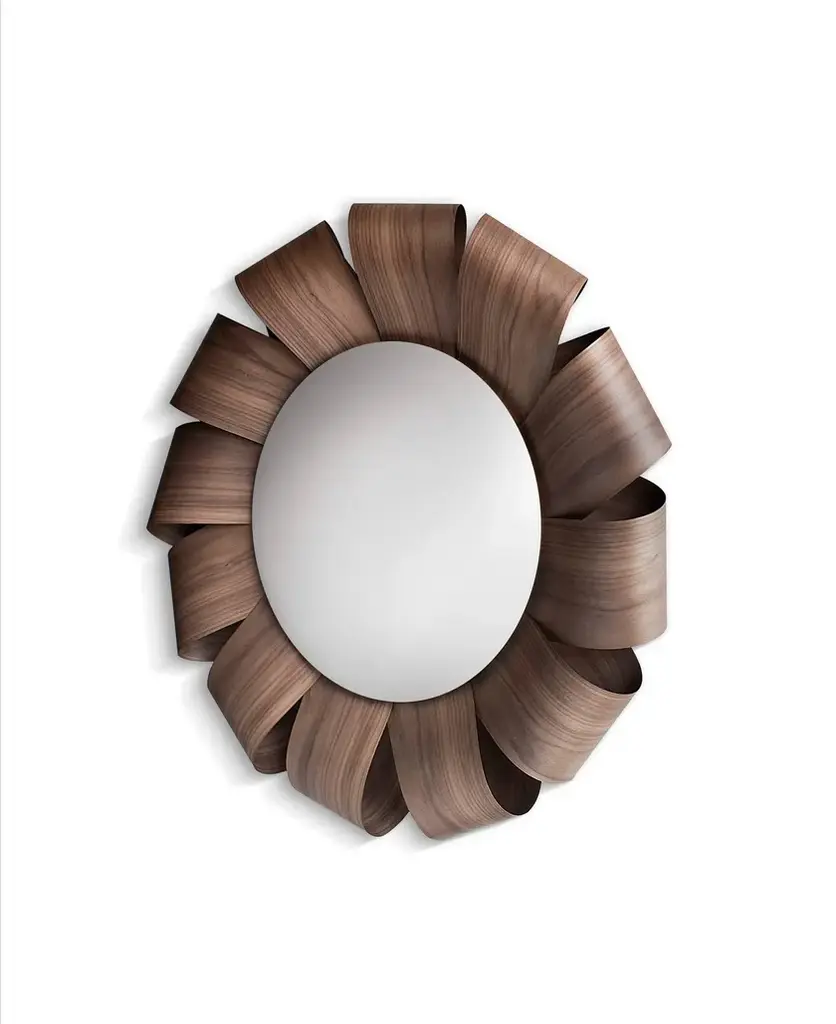 Brisa is a mirror made of natural walnut leaves subtly folded. Its three-dimensional shapes evoke nature. The mirror available in two dimensions - Brisa and Brisa XL - and with silver and bronze finish.Materials:Brisa - Walnut wood and mirror (EBRIN)Brisa Bronze - Walnut wood and bronze finished mirror (EBRINB)Brisa XL - Walnut wood and mirror (EBRIXLN)Brisa XL Bronze - Walnut wood and bronze finished mirror (EBRIXLNB)
