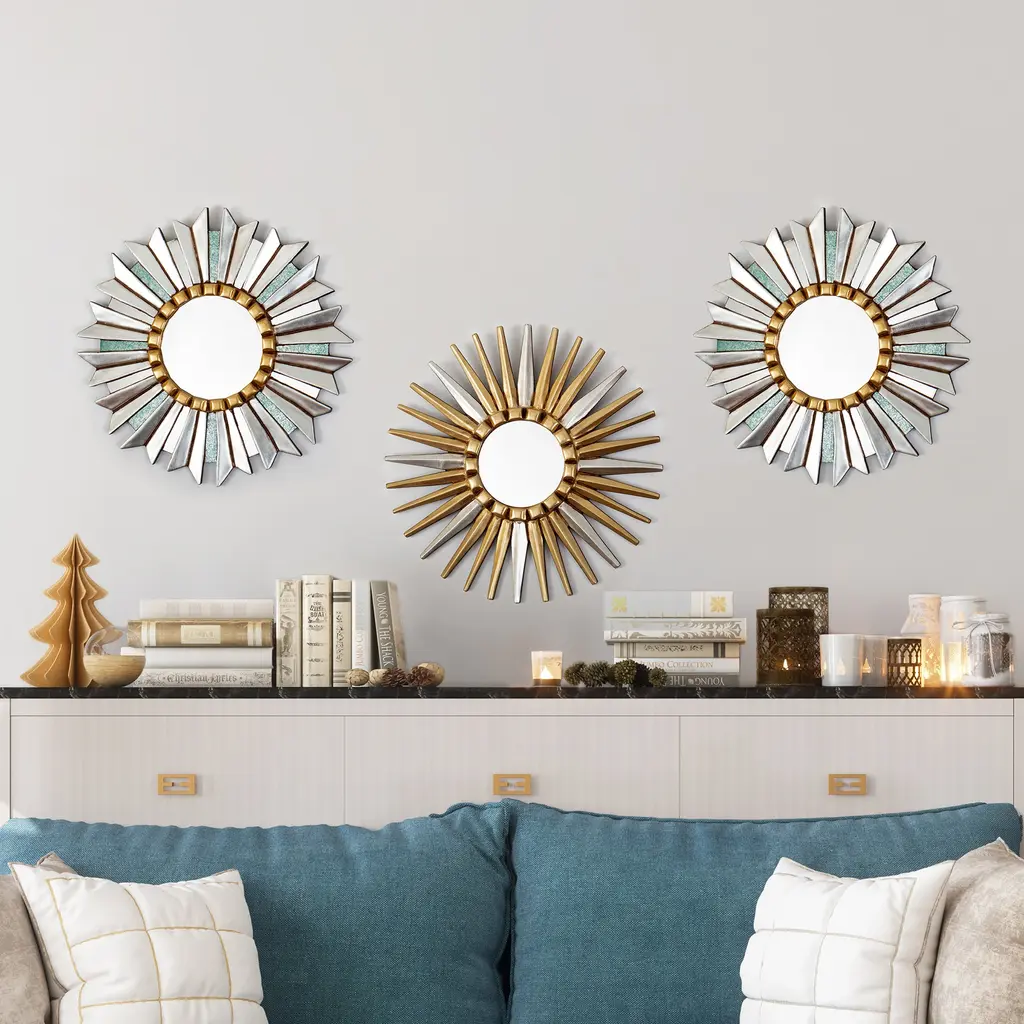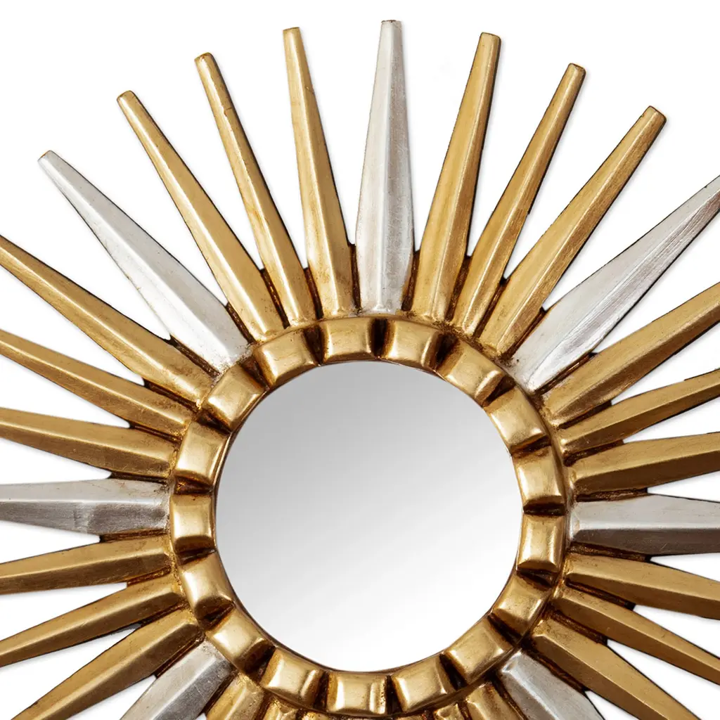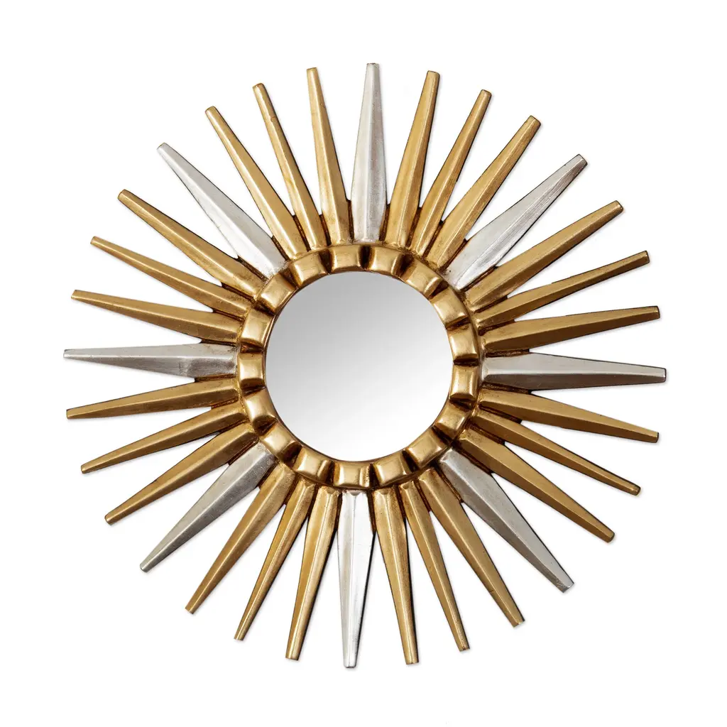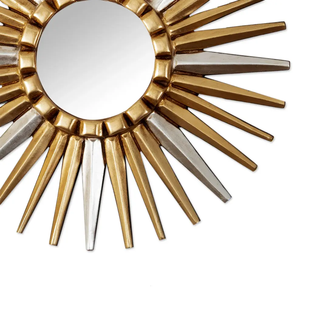 Peruvian artisan Marcos Luzalde works with precious metals and wood to create an elegant design that will add a sophisticated aura to your interiors. This wall accent mirror comes in the shape of a luminous sun, featuring a little glass application at the center and sturdy rays embellished with bronze leaf and aluminum for a luxurious style.