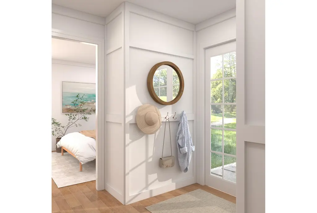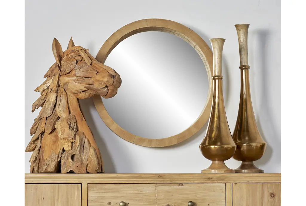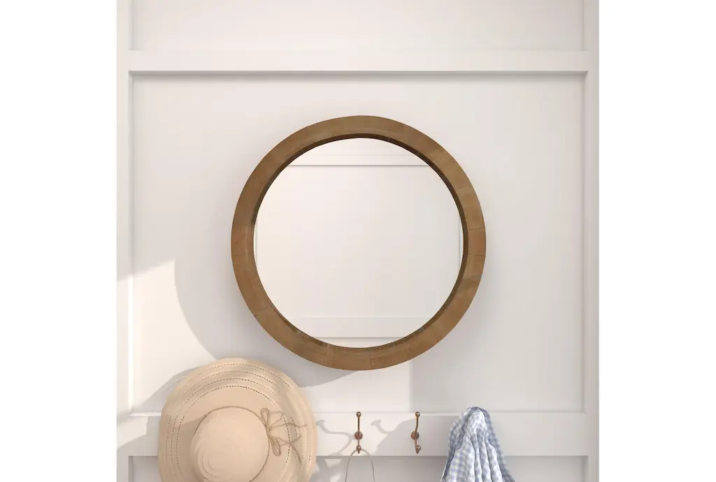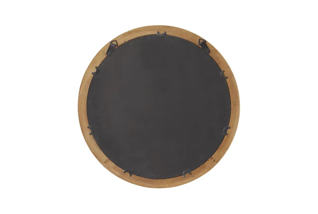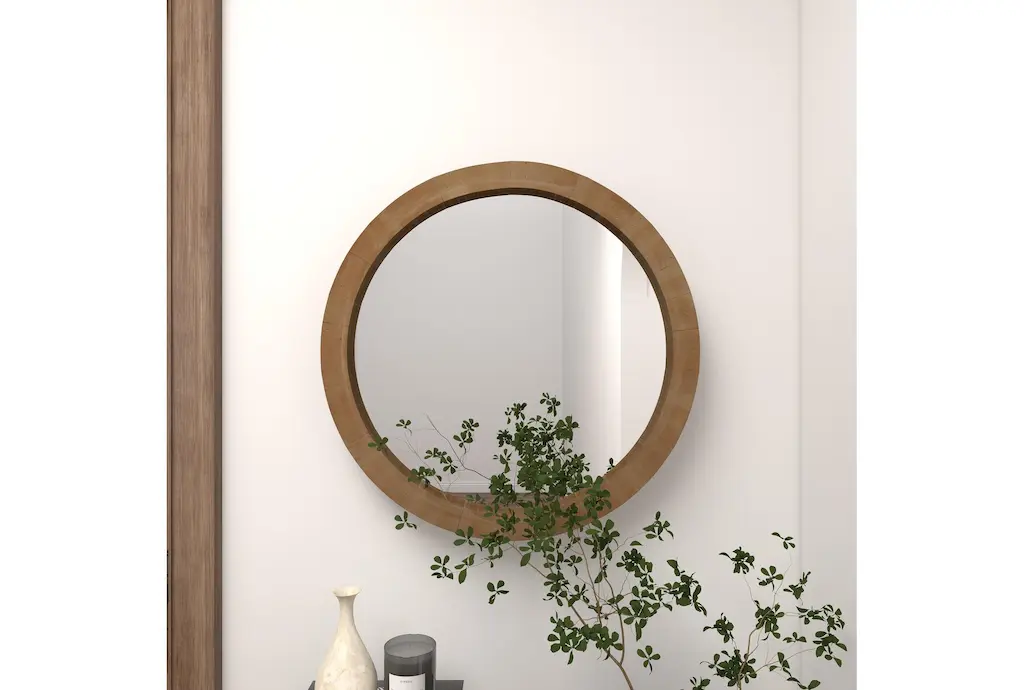 Apart from decorating your home, the purpose of this wall mirror is to bounce back outdoor light to a small room to make it look bigger. Pair this decorative wall mirror with house plants or other wall decor accent pieces to blend everything together perfectly. Bring a minimalist vibe and an illusion of space to your walls or pair this round mirror with other sculptures on your console table for added display in your entryway, bedroom, or living room space. This item ships in 1 carton. Can be hung vertically using the D-rings on the back; nails and screws not included. Suitable for indoor use only. This item ships fully assembled in one piece. This is a single brown colored entryway mirror. Contemporary style.