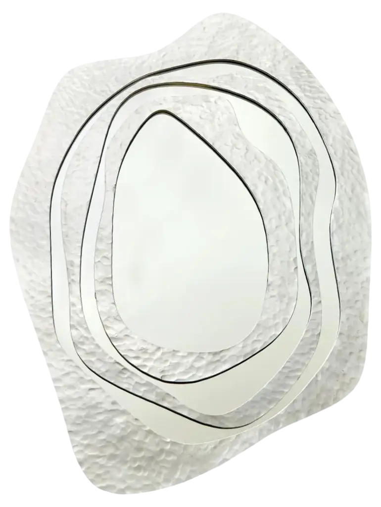 This brutalist mirror features a handcrafted triple frame with a hammered texture finished in nickel. This mirror is designed for portrait orientation only.