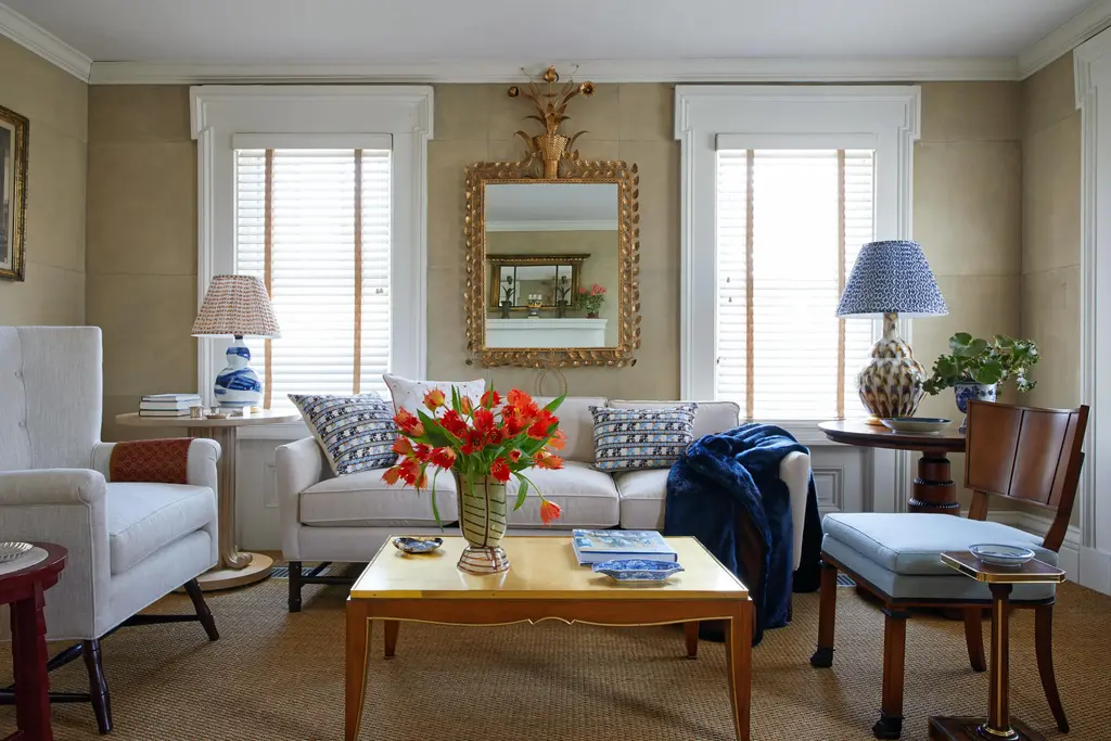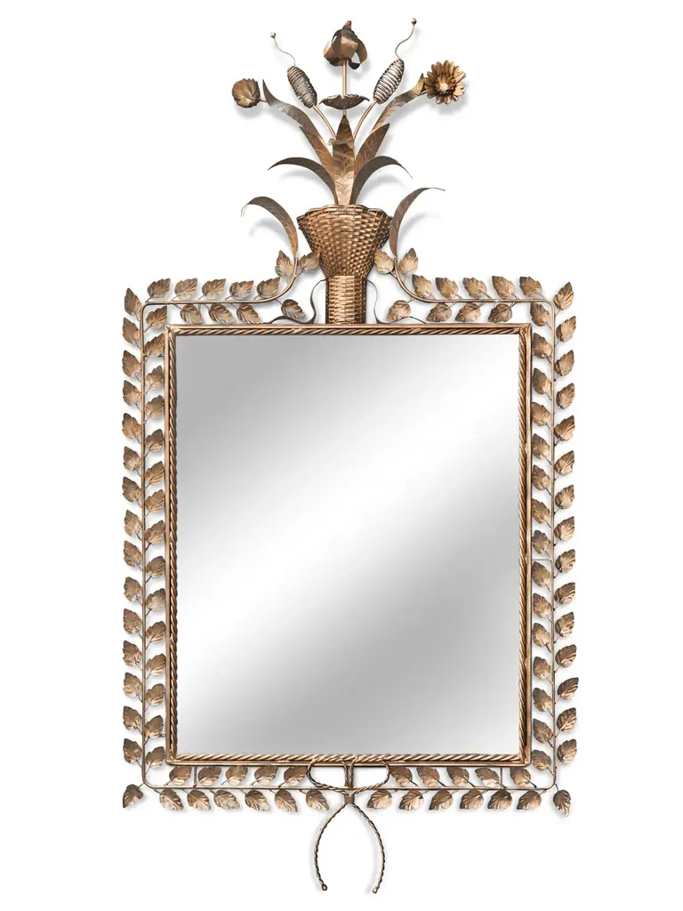 We always say that gold adds warmth to a space and the Jardin mirror brings this in spades as well as wonderful texture! The mirror is framed with delicate gilded leaves that meet at the top in a burst of gilded pods and flowers. The perfect piece for an airy hallway or living room. 34"W x 2"D x 59.5"H ( 67” H including bottom bow)