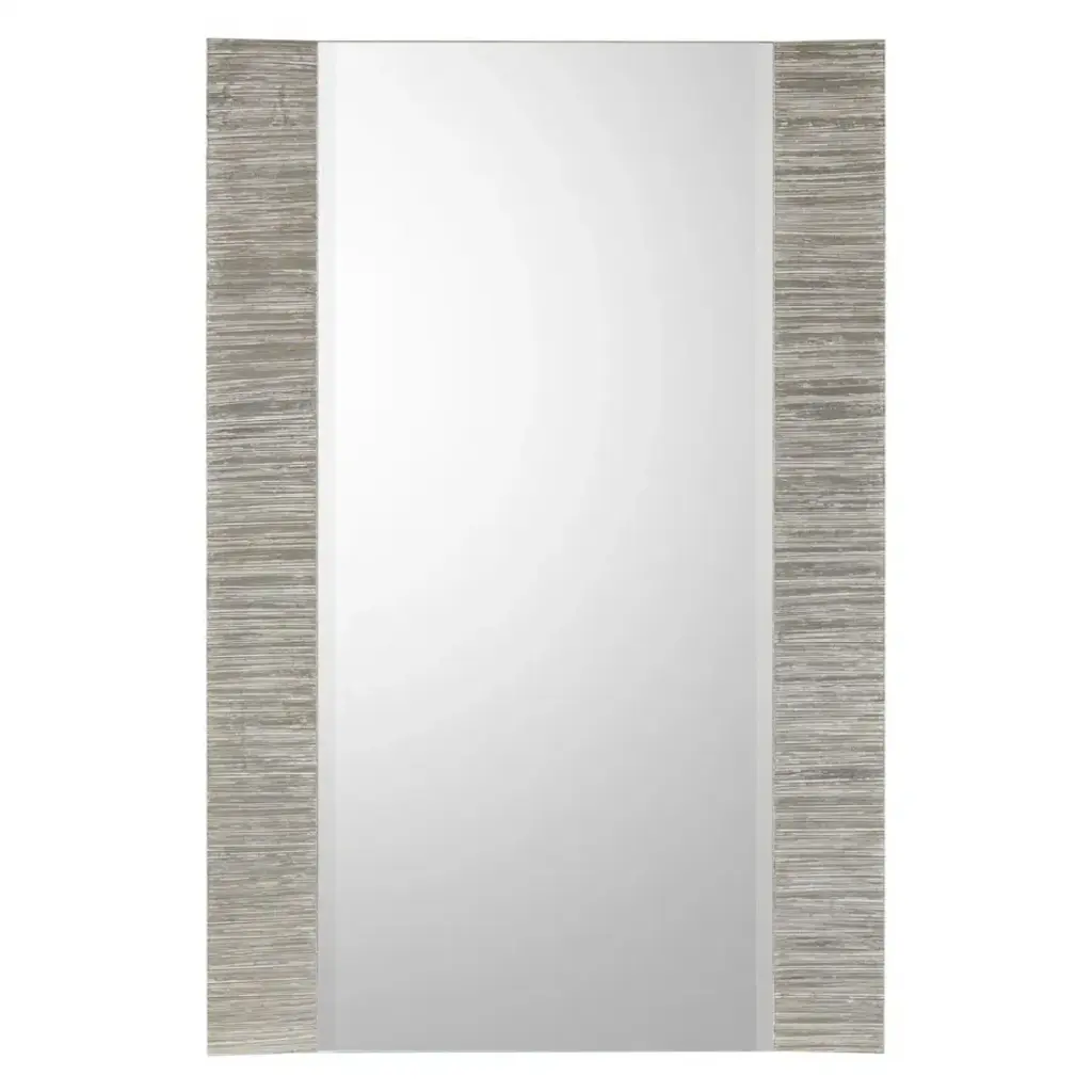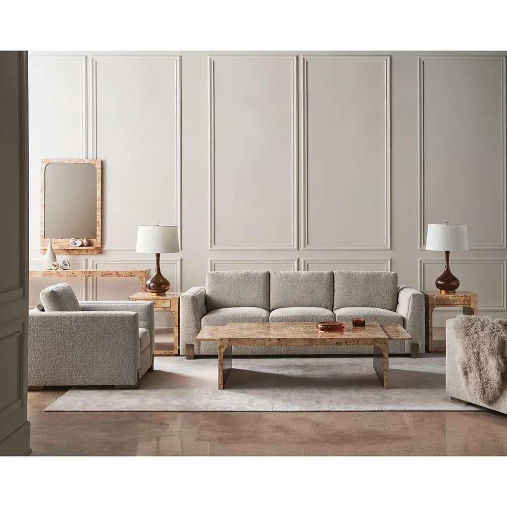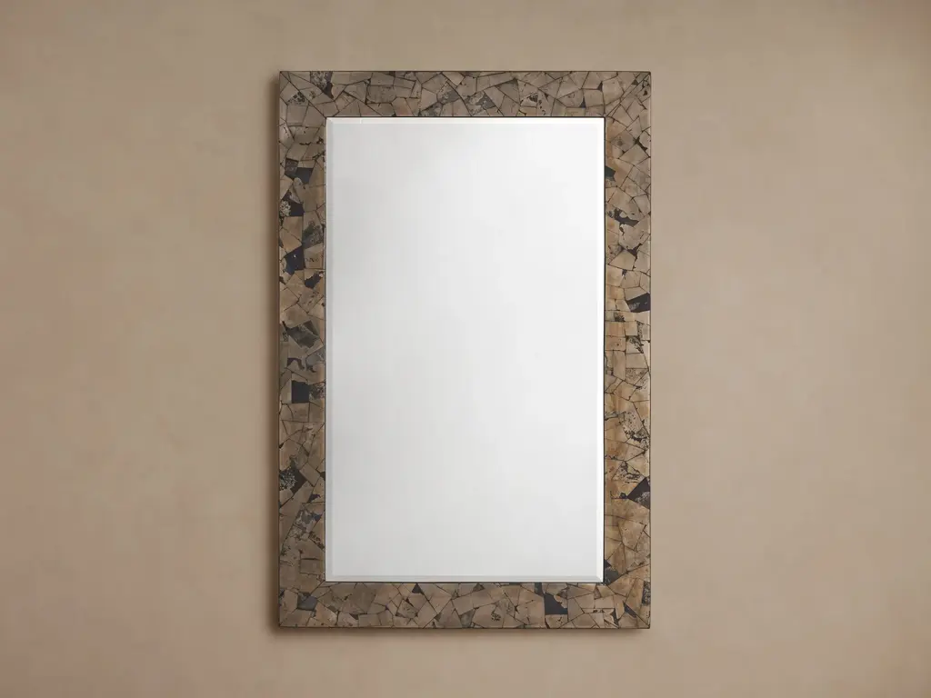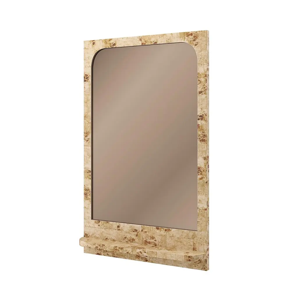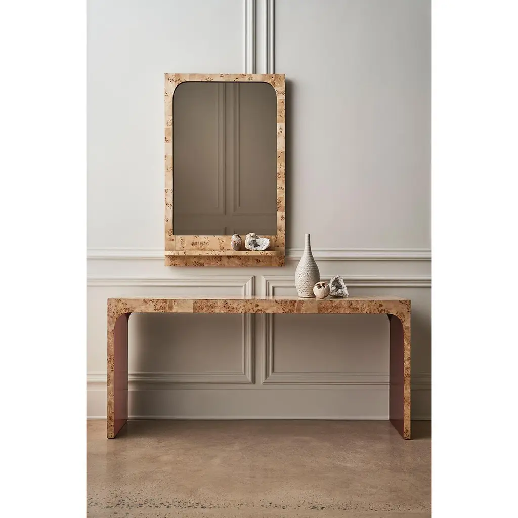 Framed in exotic mappa burl veneers. Tinted bronze casts a warm glow, complemented by a natural interplay of light and dark tones.Features a small shelf for keeping trinkets and treasures. A standout and unusual modern mirror.Dimensions: 30" W x 5.5" D x 48" H