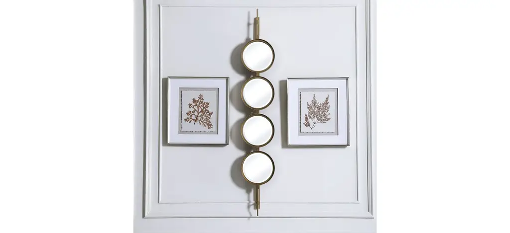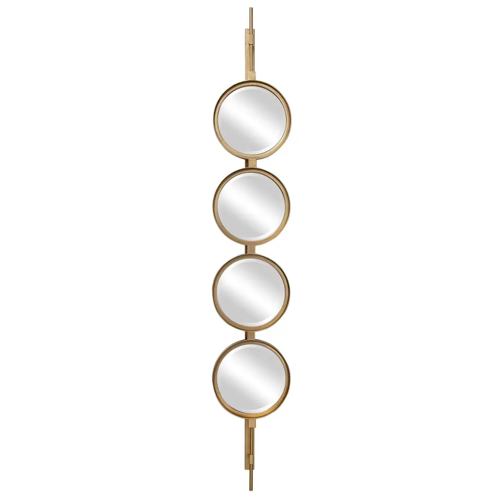Contemporary in style, this mirror features a sleek iron base with linear metal accents. The piece is finished in gold leaf with four round beveled mirrors. Group multiple pieces together and hang horizontal or vertical to create a truly unique wall feature.