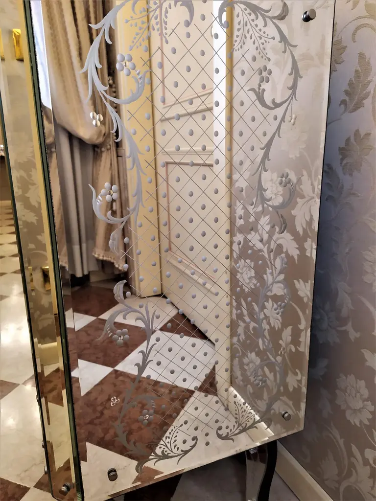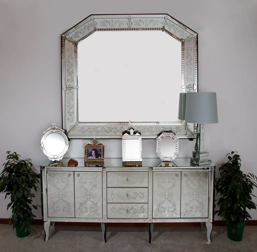 Luxurious classic sideboard called "Ca'Corner", in murano Glass mirror, composed of three central drawers and four side doors, all beveled, wheel engraved and hand polished with pure silver silvering following the ancient processing techniques handed down from father to son up to our days, in which the Fratelli Tosi makes its pride.