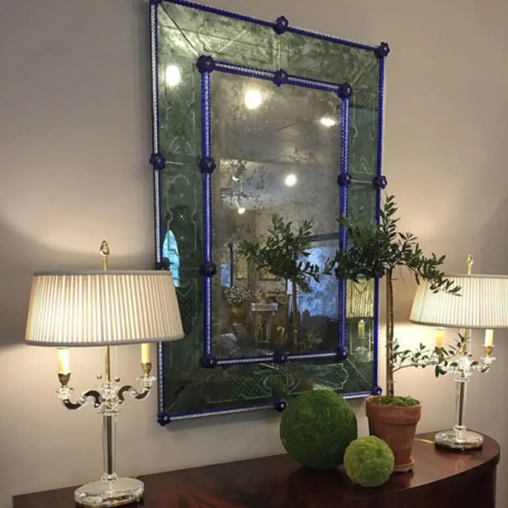 This piece of furniture is a reproduction of the typical Antique Venetian Mirror made in rectangular Murano glass, silvered with antique silvering entirely produced in mercury. This technique is typical of the 18th-century Venetian area. Both internal and external frame is fabricated in Murano crystal glass rods on a silver background. The delicate finishes on the corners are decorated with blue crystal flowers, all antiqued, according to the ancient techniques and traditions of Murano.