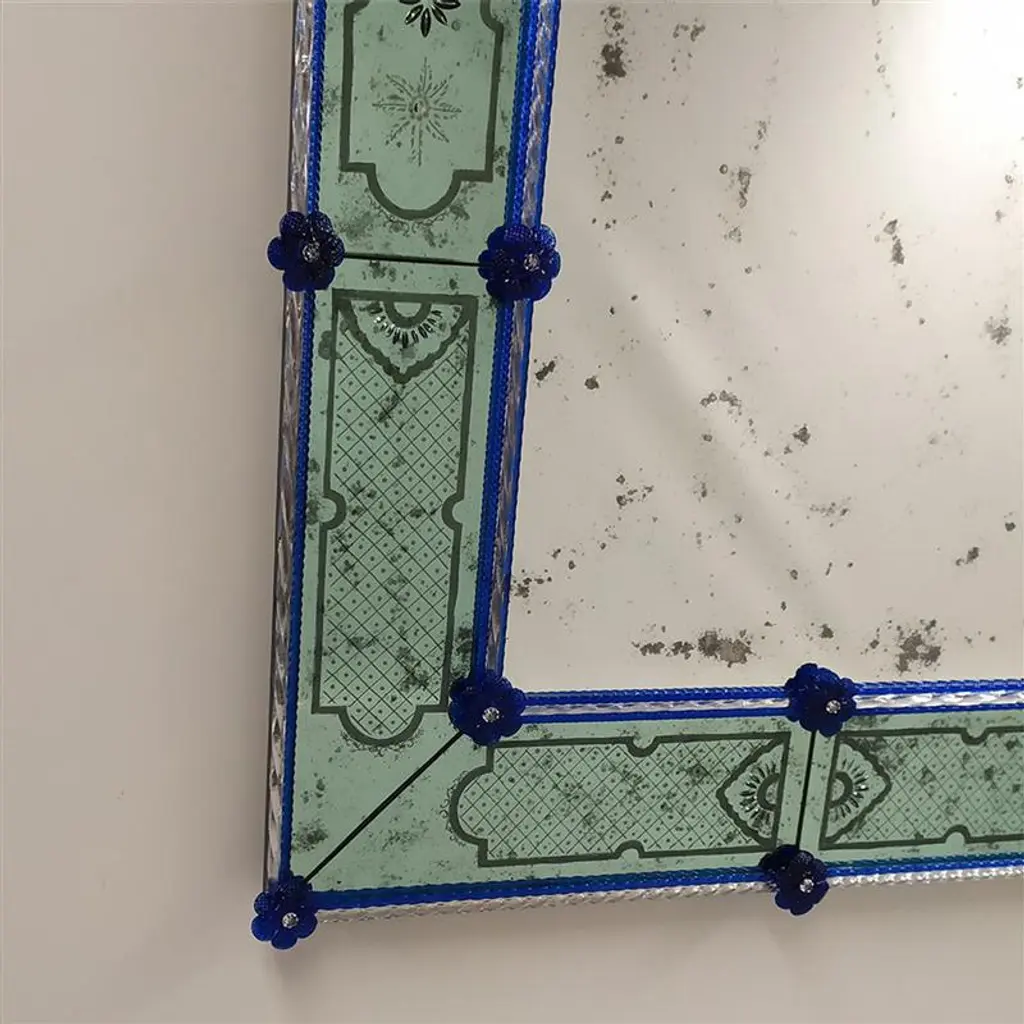 This piece of furniture is a reproduction of the typical Antique Venetian Mirror made in rectangular Murano glass, silvered with antique silvering entirely produced in mercury. This technique is typical of the 18th-century Venetian area. Both internal and external frame is fabricated in Murano crystal glass rods on a silver background. The delicate finishes on the corners are decorated with blue crystal flowers, all antiqued, according to the ancient techniques and traditions of Murano.