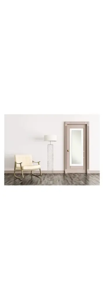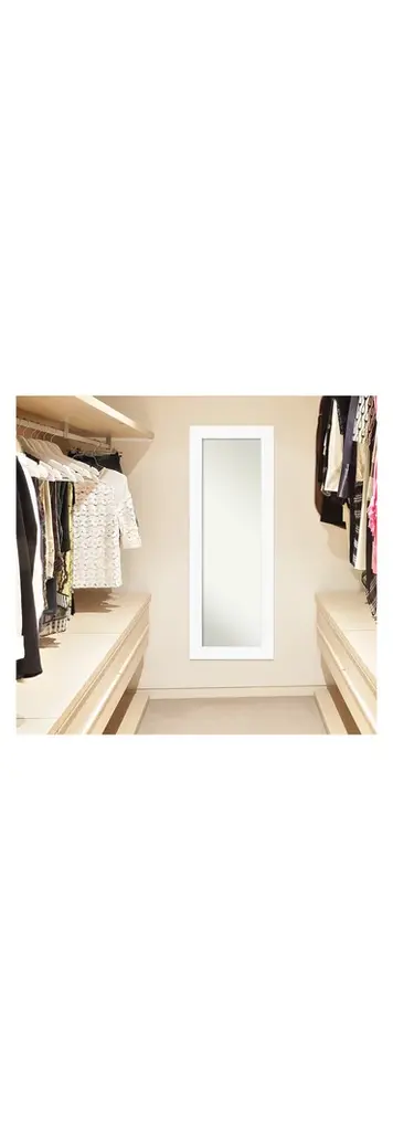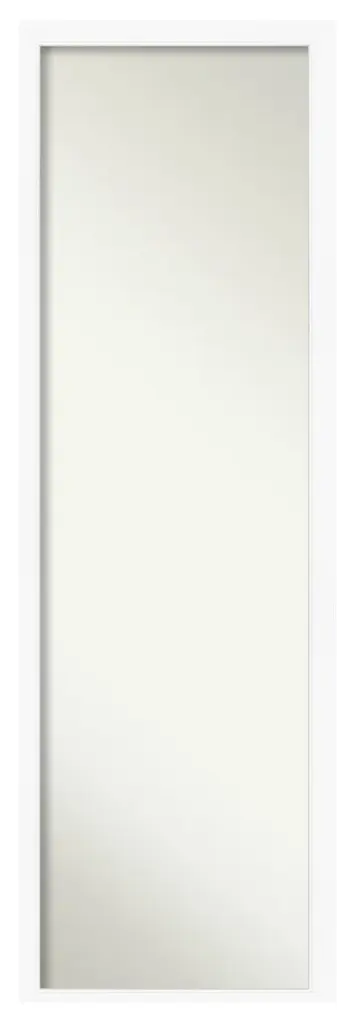 This full-length Non-Beveled Mirror framed in the Cabinet White frame, complements your decor without the need for unsightly over-the-door brackets. Individually made using traditional custom framing techniques, it has the quality you would expect from your local frame shop. It holds its value with premium finishing that can be appreciated up close. Our On The Door Mirror has two hooks to hang directly on your door or wall without additional anchors or brackets. Hang it on the back of a closet, bedroom or bathroom door, or wall as a standard full-length mirror.Features:MIRROR DETAILS: This mirror features premium glass for a clear, undistorted image and has a non-beveled surface to maximize the viewing area. The overall size of this full-length mirror measures 19.5 x 53.5 inches, including the frame. Its reflective area measures 14 x 48 inches. The mirror works perfectly as a door mirror, full-size mirror, or large mirror on the wall.FRAME DETAILS: The Cabinet White frame is a wide frame that is the color of a white cabinet and has a flat surface, slightly recessed inner lip, and smooth, matte finish. The frame is 3 in. wide and stands 0.75 in. off the wall.NO OVER-THE-DOOR BRACKETS: This full-length mirror hangs on any door without unsightly over-the-door brackets.HASSLE-FREE HANGING: Each mirror has durable D rings attached to the back along with 2 hanging hooks and nails to tap directly into your door or wall. The D rings hang easily on each hook without additional anchors or brackets. Our nail and hook combination works well on traditional walls, solid doors, and even hollow core doors.PROTECTIVE BACKING: This mirror is finished with a solid surface backing to ensure stability and prevent moisture and dust buildup.ASSEMBLED IN THE USA: Each piece is assembled to order in Madison, WI USA.FOR HOME OR COMMERCIAL USE: Because of our attention to detail and focus on artistry, architects, interior designers, and homeowners alike choose this mirror to create beautiful living spaces.