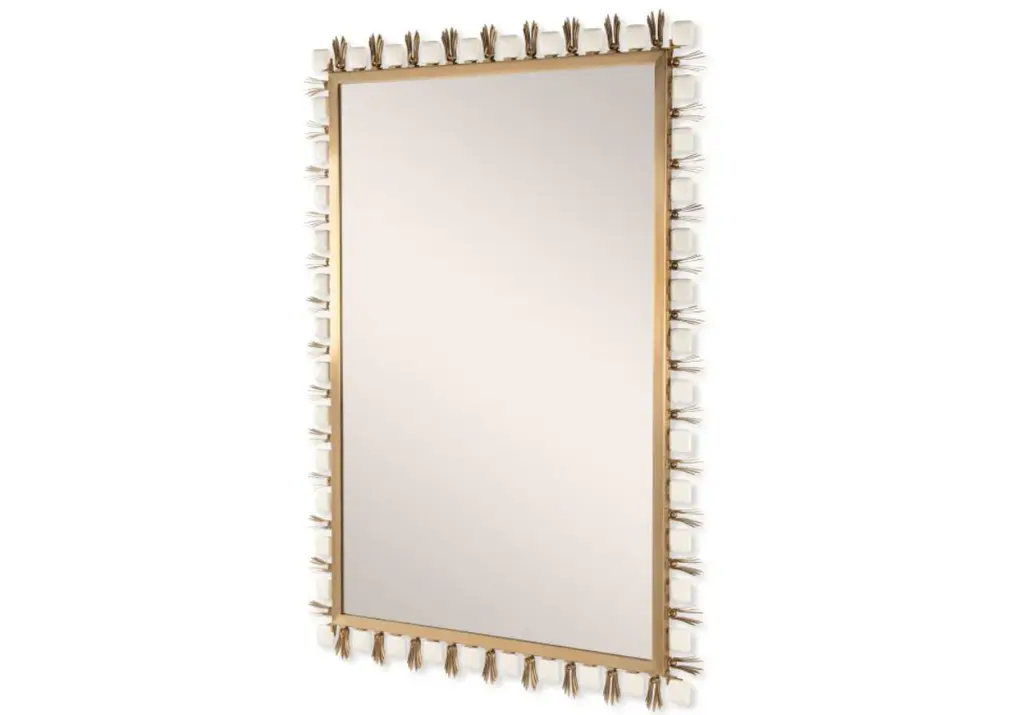 Inspired by traditional designs, this mirror makes a glamorous statement with its gold leaf finish and rectangular mirror. Alternating squares in enameled white contrasted by decorative metal flourishes further elevate its modern, tasteful design.