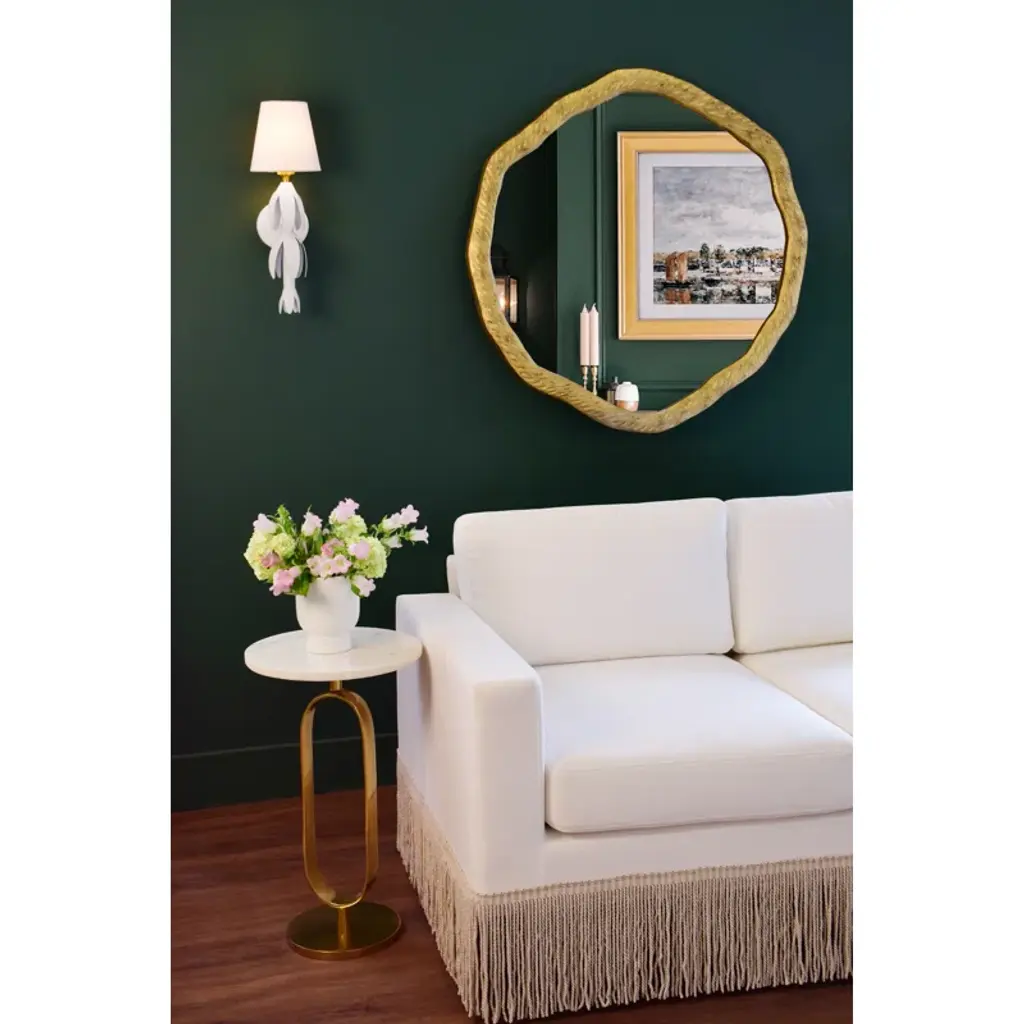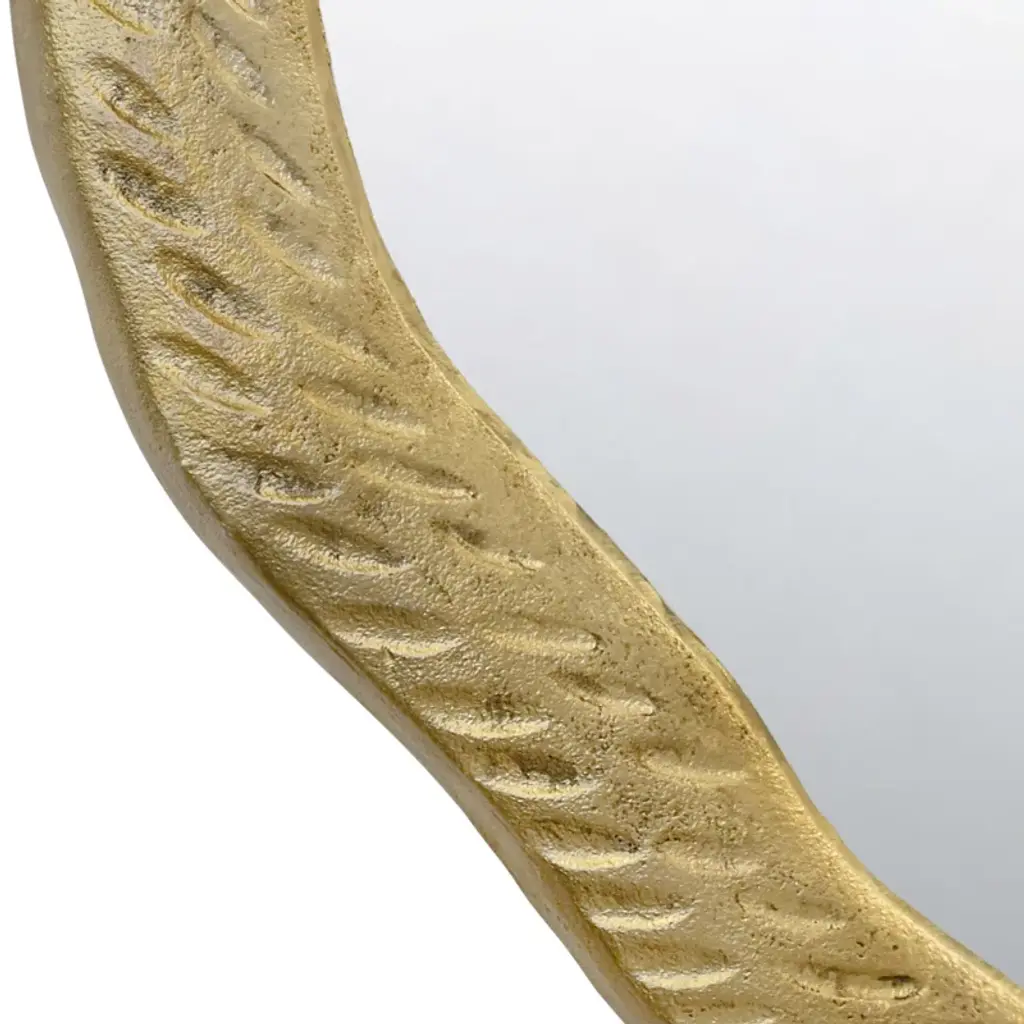 Round metal mirror with organic textured antique brass frame.
