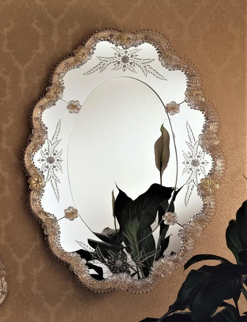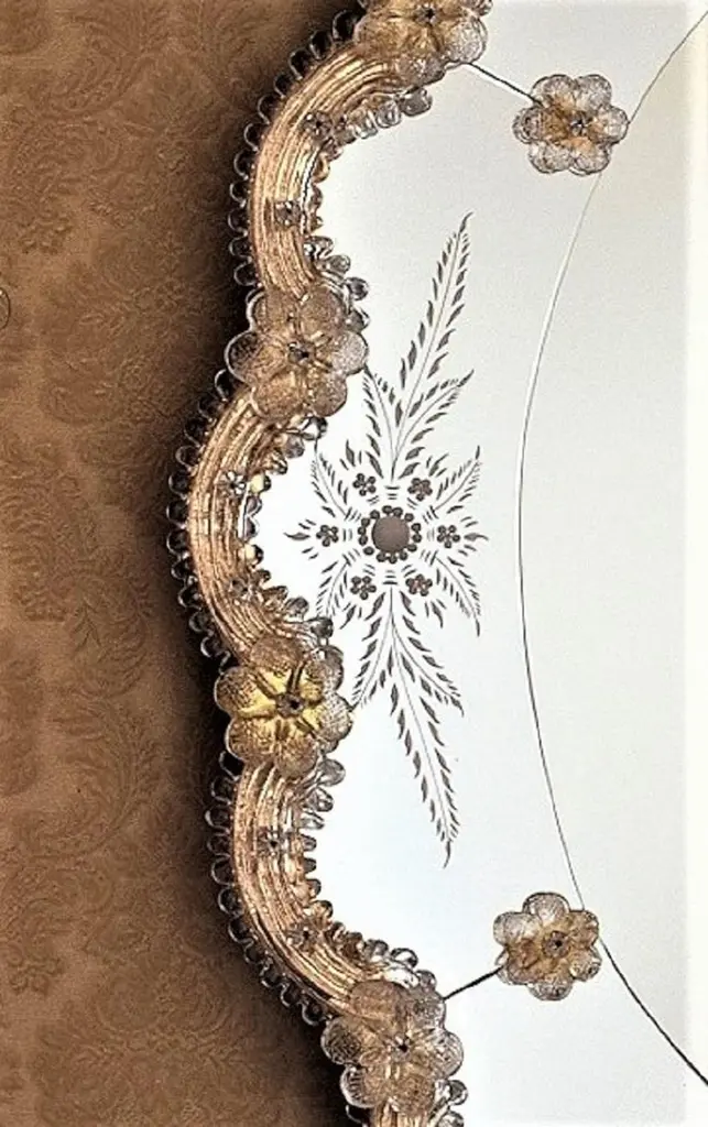 Murano glass mirror in Venetian Style, mirror made to a design by Fratelli Tosi, entirely handmade according to the techniques of our ancestors. Mirror composed of a crystal frame on a gold background, in Murano glass and decorated curls in Murano glass, all on a gold background, embellished with Crystal Gold flowers, the mirror is all decorated with floral engravings entirely made by hand.