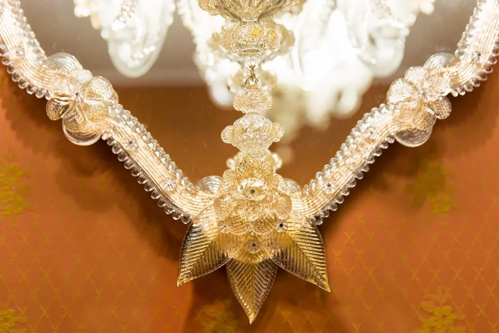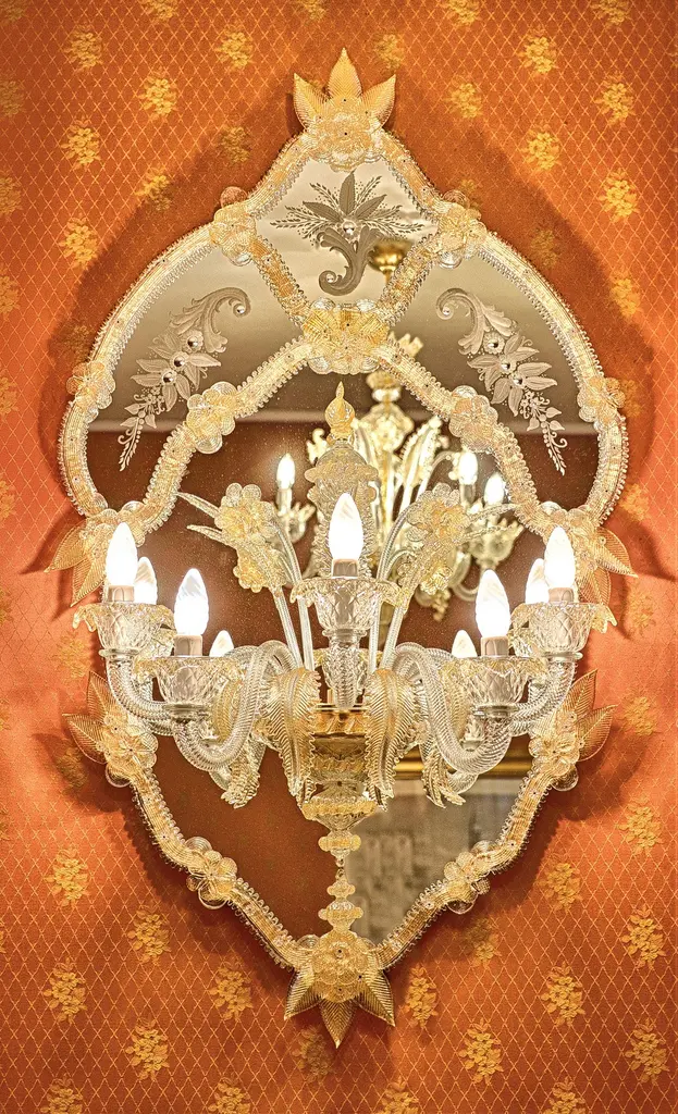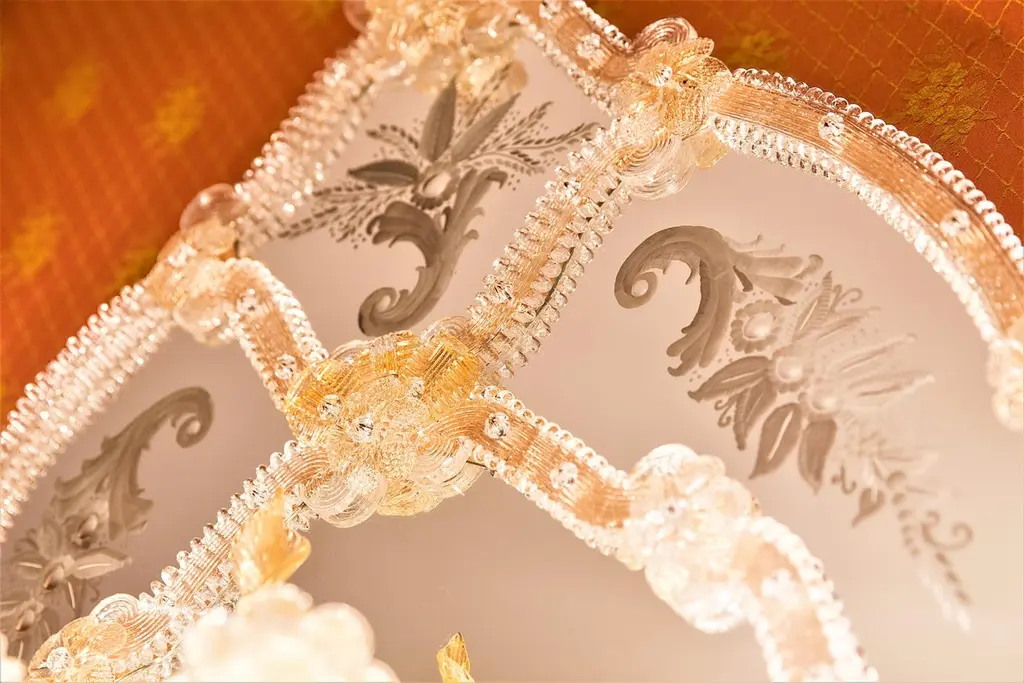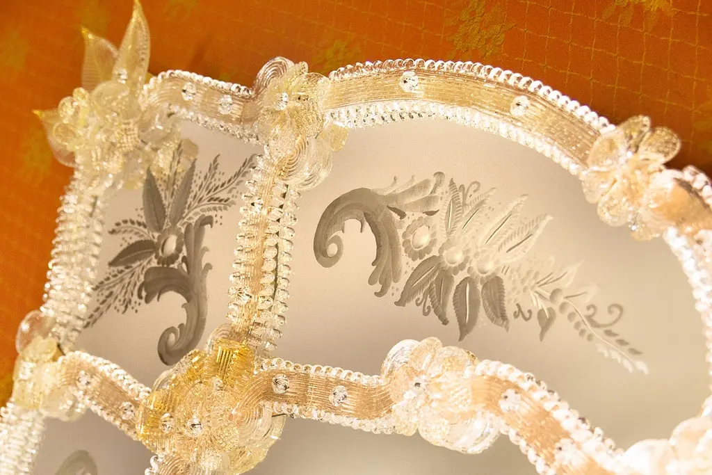 Shimmering mirror in Murano glass with the insertion of a five-light applique in the central mirror in typical Venetian style.Gold crystal applique, executed following the ancient techniques of our glass masters that handed down to the present day generates a unique work of its kind, with two functions, illuminating our homes with a mirror in total Venetian style totally created and executed by hand by Fratelli Tosi.The mirror composed of a crystal frame on a gold background in Murano glass, is then hand-engraved with floral subjects and silvered with pure silver, it is then all finished with leaves and flowers in crystal with gold leaf.A true work of art.